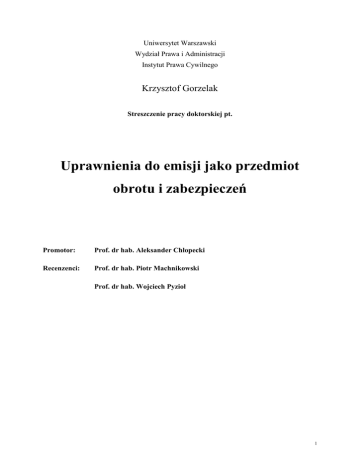 Uniwersytet Warszawski Wydział Prawa i Administracji Instytut Prawa Cywilnego Krzysztof Gorzelak Streszczenie pracy doktorskiej pt. Uprawnienia do emisji jako przedmiot obrotu i zabezpieczeń Promotor: Prof. dr hab. Aleksander Chłopecki Recenzenci: Prof. dr hab. Piotr Machnikowski Prof. dr hab. Wojciech Pyzioł 1 Wstęp Celem niniejszej pracy jest zbadanie cywilnoprawnych aspektów obrotu uprawnieniami do emisji gazów cieplarnianych ze szczególnym uwzględnieniem sposobów wykorzystania uprawnień do emisji jako przedmiotu zabezpieczenia spłaty wierzytelności. W ramach rozprawy można wyodrębnić jej dwie główne części. Po pierwsze dogłębnej analizy wymagał status prawny uprawnień do emisji. W związku z tym wstęp oraz dwa pierwsze rozdziały poświęcone zostały przedstawieniu źródeł powstania systemu handlu uprawnieniami do emisji oraz stworzeniu całościowej charakterystyki uprawnień do emisji jako szczególnej kategorii prawa cywilnego. W drugiej części pracy, w oparciu o wnioski z analizy zawartej w części poprzedzającej, badaniu poddany został reżim obrotu uprawnieniami do emisji z punktu widzenia prawa cywilnego. Należy podkreślić, że przedmiotem mojego zainteresowania było nie tylko przenoszenie tytułu do uprawnień do emisji w ramach sprzedaży, która niewątpliwie stanowi najpowszechniej wykorzystywany typ transakcji odnoszący się do uprawnień do emisji. Szczególną uwagę zwrócono także na możliwość wykorzystania uprawnień do emisji jako przedmiotu zabezpieczeń spłaty wierzytelności, czy to w drodze przeniesienia na zabezpieczenie, ustanowienia ograniczonych praw rzeczowych w formie różnego rodzaju praw zastawniczych czy też zaciągnięcia zobowiązań do nierozporządzania uprawnieniami do emisji, przybierającego postać blokady umownej. 1. Systemy handlu uprawnieniami do emisji W rozdziale 1 dokonano analizy źródeł powstania systemów handlu uprawnieniami do emisji. Opis genezy systemów handlu uprawnieniami do emisji stanowi niezbędny punkt wyjścia dla dalszych rozważań, ponieważ to w ramach takich systemów powstały uprawnienia do emisji. Na gruncie Europejskiego Systemu Handlu Uprawnieniami do Emisji (EU ETS) jedno uprawnienie do emisji ucieleśnia prawo do emisji jednej tony równoważnika dwutlenku węgla. Istota handlu uprawnieniami do emisji wyraża się w 2 obowiązku uzyskania, a następnie przedstawienia do umorzenia określonej liczby uprawnień odpowiadającej wielkości zanieczyszczeń wyemitowanych przez dany podmiot. Obowiązek powyższy zostaje nałożony na różnego rodzaju podmioty emitujące znaczną ilość gazów cieplarnianych, takie jak zakłady przemysłowe czy linie lotnicze. Uczestnicy systemu mogą dokonywać między sobą obrotu uprawnieniami, celem wyzbycia się nadwyżki uprawnień (powstałej np. wskutek wdrożenia procesów zmniejszających emisję) lub celem uzupełnienia niedoboru (powstałego np. wskutek zwiększenia emisji). System EU ETS stanowi odpowiedź na zagrożenia dla środowiska naturalnego płynące z emisji gazów cieplarnianych. Większość przedstawicieli nauk przyrodniczych stoi na stanowisku, że emisja dwutlenku węgla i innego rodzaju tzw. gazów cieplarnianych może prowadzić do poważnych zmian klimatycznych, stanowiących poważne niebezpieczeństwo dla ekosystemu Ziemi. System handlu uprawnieniami do emisji ma umożliwić redukcję emisji w możliwie elastyczny, ekonomicznie efektywny sposób. Poszczególni uczestnicy systemu mogą bowiem indywidualnie podjąć decyzję, czy efektywniejsze będzie dla nich wdrożenie działań redukujących emisję, czy też nabycie na rynku brakujących uprawnień do emisji od podmiotów, które wskutek wdrożenia takich działań dysponują nadwyżką. 2. Charakter prawny uprawnień do emisji Rozdział 2 poświęcony został analizie charakteru prawnego uprawnień do emisji i wyjaśnieniu ich wyjątkowego charakteru na tle innych instytucji prawnych, ale również zbadaniu pewnych podobieństw z niektórymi rodzajami praw podmiotowych. Taka analiza służyła ustaleniu, czy wypracowane już przez doktrynę i orzecznictwo bogate wnioski dotyczące reżimów prawnych innych instrumentów prawnych, mogą posłużyć odtworzeniu reżimu prawnego obrotu uprawnieniami do emisji. Natura powietrza jako substancji decydująco wpłynęła na kształt idei uprawnień do emisji. Powietrze atmosferyczne jest dobrem amorficznym, nienadającym się do zawłaszczenia w stanie, w jakim się znajduje. Nie może być w związku z tym przedmiotem praw podmiotowych. Z tego względu, celem wykreowania prawa uprawniającego do korzystania z atmosfery, konieczne było odwołanie się do koncepcji prawa nie związanego z materialnym substratem. Uprawnienie do emisji nie przyznaje w związku z tym monopolu na korzystanie z masy powietrza, co nadawałoby mu status prawa o charakterze bezwzględnym, 3 skutecznego wobec wszystkich. Uprawnienie do emisji skonstruowane jest w sposób odwrotny, tj. jako zwolnienie z generalnego zakazu emitowania zanieczyszczeń. W ten sposób nawiązana zostaje relacja pomiędzy podmiotem dysponującym uprawnieniem do emisji a organem administracji, wyrażająca się w prawie uprawnionego do przedstawienia uprawnienia do umorzenia w zamian za co organ administracji zaniecha nałożenia kary. Tym samym uprawnienie do emisji ucieleśnia prawo żądania określonego zachowania wyłącznie od skonkretyzowanego podmiotu, jest więc prawem o charakterze względnym. Uprawnienia do emisji służą ochronie interesów majątkowych. Podlegają one wycenie rynkowej, mają zatem określoną, wymierną wartość. Pomimo to nie można uznać ich za element stosunku cywilnoprawnego. Nie powstają one bowiem w ramach równorzędnej relacji nawiązywanej przez uczestników obrotu. Przeciwnie, uprawnienie do emisji ucieleśnia uprawnienie do wyemitowania zanieczyszczeń, a więc zwalnia z generalnego zakazu ich emitowania. Uprawnienie 
