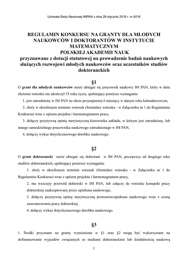 Uchwała Rady Naukowej IMPAN z dnia 28 stycznia 2016 r. nr 8/I16 REGULAMIN KONKURSU NA GRANTY DLA MŁODYCH NAUKOWCÓW I DOKTORANTÓW W INSTYTUCIE MATEMATYCZNYM POLSKIEJ AKADEMII NAUK przyznawane z dotacji statutowej na prowadzenie badań naukowych służących rozwojowi młodych naukowców oraz uczestników studiów doktoranckich §1 O grant dla młodych naukowców może ubiegać się pracownik naukowy IM PAN, który w dniu złożenia wniosku nie ukończył 35 roku życia, spełniający poniższe wymagania: 1. jest zatrudniony w IM PAN na okres przynajmniej 6 miesięcy w danym roku kalendarzowym, 2. złoży w określonym terminie wniosek (formularz wniosku - w Załączniku nr 1 do Regulaminu Konkursu) wraz z opisem projektu i harmonogramem pracy, 3. dołączy pozytywną opinię merytoryczną kierownika zakładu, w którym jest zatrudniony, lub innego samodzielnego pracownika naukowego zatrudnionego w IM PAN, 4. dołączy wykaz dotychczasowego dorobku naukowego. §2 O grant doktorancki może ubiegać się doktorant w IM PAN, począwszy od drugiego roku studiów doktoranckich, spełniający poniższe wymagania: 1. złoży w określonym terminie wniosek (formularz wniosku - w Załączniku nr 1 do Regulaminu Konkursu) wraz z opisem projektu i harmonogramem pracy, 2. ma wszczęty przewód doktorski w IM PAN, lub załączy do wniosku konspekt pracy doktorskiej zaakceptowany przez opiekuna naukowego, 3. dołączy pozytywną opinię merytoryczną promotora/opiekuna naukowego wraz z oceną zaawansowania pracy doktorskiej, 4. dołączy wykaz dotychczasowego dorobku naukowego. §3 1. Środki przyznane na granty wymienione w §1 oraz §2 mogą być wykorzystane na dofinansowanie wyjazdów związanych ze studiami doktoranckimi lub działalnością naukową 1 Uchwała Rady Naukowej IMPAN z dnia 28 stycznia 2016 r. nr 8/I16 prowadzoną w IM PAN, np. szkół, warsztatów naukowych, konferencji naukowych, w celu wygłoszenia referatu ściśle związanego z pracą doktorską lub działalnością naukową, kursów językowych, lub też innych wydatków związanych z prowadzoną działalnością naukową. 2. Z grantów finansować też można honoraria dla najlepszych młodych naukowców oraz uczestników studiów doktoranckich. 3. Warunkiem rozliczenia grantu dla młodych naukowców oraz grantu doktoranckiego jest przedłożenie sprawozdania (wzór w Załączniku nr 2), w którym pracownik lub doktorant przedstawi sposób wykorzystania przyznanych środków finansowych. §4 Osoby przystępujące do konkursu zobowiązane są do złożenia oświadczenia o zgodzie na przetwarzanie ich danych osobowych w zakresie niezbędnym w postępowaniu konkursowym. §5 Dyrektor IM PAN ogłaszając konkurs określa termin składania wniosków, szczegółowe warunki oraz powołuje komisję do przeprowadzenia konkursu. §6 Zakończenia realizacji grantu dokonuje się przez przedstawienie stosownego rozliczenia finansowego i merytorycznego (wzór sprawozdania - w Załączniku nr 2), które należy złożyć nie później niż do 15 grudnia roku kalendarzowego, w którym grant został przyznany. 2 Uchwała Rady Naukowej IMPAN z dnia 28 stycznia 2016 r. nr 8/I16 Załącznik nr 1 do regulaminu konkursu na granty dla młodych naukowców i doktorantów w IMPAN Data wpływu ................................... Wniosek o przyznanie grantu indywidualnego dla młodych pracowników naukowych i doktorantów Instytutu Matematycznego PAN Tytuł projektu Wnioskodawca (stopień naukowy, imię i nazwisko): Miejsce pracy wnioskodawcy (zakład, tel., e-mail): Wykaz publikacji (podać autorów, rok, tytuł, czasopismo, tom, strony): Opis projektu badawczego (przedmiot i cel badań, nowatorstwo, istotność projektu w stosunku do obecnego stanu wiedzy- maksymalnie 2 strony) Opis planowanych kosztów (wyjazdy, honoraria, kursy) Opinia kierownika zakładu lub samodzielnego pracownika naukowego IMPAN ........................................................ (podpis wnioskodawcy, data) Uchwała Rady Naukowej IMPAN z dnia 28 stycznia 2016 r. nr 8/I16 Załącznik nr 2 do regulaminu konkursu na granty dla młodych naukowców i doktorantów w IMPAN Protokół oceny i odbioru grantu dla młodych naukowców i doktorantów w roku ……………………. Zakład/Pracownia ………………………………………………………………………….…………… Stopień naukowy, imię i nazwisko kierownika pracy …………………………………..……. Temat grantu:…………………………………………………………….……………………………… Zadania do wykonania wg projektu grantu: Zadania wykonane: Streszczenie pracy: Wyjazdy zrealizowane z funduszy przeznaczonych na grant (podać cel naukowy, termin i miejsce wyjazdu): Inne koszty: Data i podpis Kierownika grantu ………………… Ocena Komisji oceniającej: a) praca wykonana prawidłowo b) praca wykonana częściowo c) praca niewykonana Uwagi Komisji: Skład Komisji ……………. ……………. Podpisy ……………. ……………. Data:……………… Kwota przyznana: Kwota wykorzystana: --------------------------------podpis Głównego Księgowego Podpis Dyrektora ……………...…