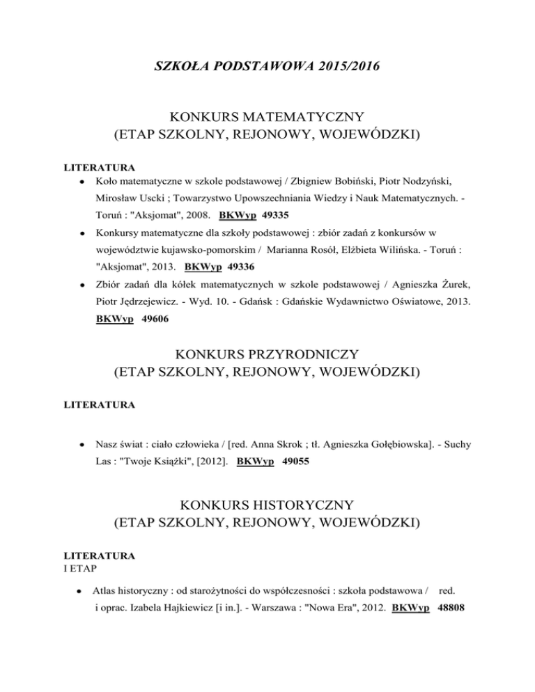 SZKOŁA PODSTAWOWA 2015/2016 KONKURS MATEMATYCZNY (ETAP SZKOLNY, REJONOWY, WOJEWÓDZKI) LITERATURA Koło matematyczne w szkole podstawowej / Zbigniew Bobiński, Piotr Nodzyński, Mirosław Uscki ; Towarzystwo Upowszechniania Wiedzy i Nauk Matematycznych. Toruń : "Aksjomat", 2008. BKWyp 49335 Konkursy matematyczne dla szkoły podstawowej : zbiór zadań z konkursów w województwie kujawsko-pomorskim / Marianna Rosół, Elżbieta Wilińska. - Toruń : "Aksjomat", 2013. BKWyp 49336 Zbiór zadań dla kółek matematycznych w szkole podstawowej / Agnieszka Żurek, Piotr Jędrzejewicz. - Wyd. 10. - Gdańsk : Gdańskie Wydawnictwo Oświatowe, 2013. BKWyp 49606 KONKURS PRZYRODNICZY (ETAP SZKOLNY, REJONOWY, WOJEWÓDZKI) LITERATURA Nasz świat : ciało człowieka / [red. Anna Skrok ; tł. Agnieszka Gołębiowska]. - Suchy Las : "Twoje Książki", [2012]. BKWyp 49055 KONKURS HISTORYCZNY (ETAP SZKOLNY, REJONOWY, WOJEWÓDZKI) LITERATURA I ETAP Atlas historyczny : od starożytności do współczesności : szkoła podstawowa / red. i oprac. Izabela Hajkiewicz [i in.]. - Warszawa : "Nowa Era", 2012. BKWyp 48808 Ilustrowany atlas historii Polski / red. Witold Sienkiewicz. - Warszawa : "Demart", 2007. BKWyp 48194, BKCzy 48193 Słownik szkolny - historia / Jerzy Pilikowski. - Kraków : "Zielona Sowa", cop. 2008. BKWyp 48801 Terminy i pojęcia historyczne / Bogdan Snoch. - Warszawa : Wydawnictwa Szkolne i Pedagogiczne, 1990. BKWyp 42757, BKCzy 42759 Encyklopedia szkolna. Historia / [aut. Krzysztof Baczkowski i in.]. - Wyd. 4 zm. i rozsz. - Warszawa : Wydawnictwa Szkolne i Pedagogiczne, 2004. BKWyp 48192, BKCzy 48191 Od niepodległości do niepodległości : historia Polski 1918-1989 / Adam Dziurok [i in.]. - Wyd. 2 popr. - Warszawa : Instytut Pamięci Narodowej. Komisja Ścigania Zbrodni przeciwko Narodowi Polskiemu, 2011, s. 9- 102. BKWyp 48766 II ETAP Atlas historyczny : od starożytności do współczesności : szkoła podstawowa / red. i oprac. Izabela Hajkiewicz [i in.]. - Warszawa : "Nowa Era", 2012. BKWyp 48808 Ilustrowany atlas historii Polski / red. Witold Sienkiewicz. - Warszawa : "Demart", 2007. BKWyp 48194, BKCzy 48193 Słownik szkolny - historia / Jerzy Pilikowski. - Kraków : "Zielona Sowa", cop. 2008. BKWyp 48801 Terminy i pojęcia historyczne / Bogdan Snoch. - Warszawa : Wydawnictwa Szkolne i Pedagogiczne, 1990. BKWyp 42757, BKCzy 42759 Encyklopedia szkolna. Historia / [aut. Krzysztof Baczkowski i in.]. - Wyd. 4 zm. i rozsz. - Warszawa : Wydawnictwa Szkolne i Pedagogiczne, 2004. BKWyp 48192, BKCzy 48191 Od niepodległości do niepodległości : historia Polski 1918-1989 / Adam Dziurok [i in.]. - Wyd. 2 popr. - Warszawa : Instytut Pamięci Narodowej. Komisja Ścigania Zbrodni przeciwko Narodowi Polskiemu, 2011, s.103- 204. BKWyp 48766 III ETAP Atlas historyczny : od starożytności do współczesności : szkoła podstawowa / red. i oprac. Izabela Hajkiewicz [i in.]. - Warszawa : "Nowa Era", 2012. BKWyp 48808 Ilustrowany atlas historii Polski / red. Witold Sienkiewicz. - Warszawa : "Demart", 2007. BKWyp 48194, BKCzy 48193 Słownik szkolny - historia / Jerzy Pilikowski. - Kraków : "Zielona Sowa", cop. 2008. BKWyp 48801 Terminy i pojęcia historyczne / Bogdan Snoch. - Warszawa : Wydawnictwa Szkolne i Pedagogiczne, 1990. BKWyp 42757, BKCzy 42759 Encyklopedia szkolna. Historia / [aut. Krzysztof Baczkowski i in.]. - Wyd. 4 zm. i rozsz. - Warszawa : Wydawnictwa Szkolne i Pedagogiczne, 2004. BKWyp 48192, BKCzy 48191 Od niepodległości do niepodległości : historia Polski 1918-1989 / Adam Dziurok [i in.]. - Wyd. 2 popr. - Warszawa : Instytut Pamięci Narodowej. Komisja Ścigania Zbrodni przeciwko Narodowi Polskiemu, 2011, s. 205- 492. BKWyp 48766 KONKURS JĘZYKA POLSKIEGO (ETAP SZKOLNY, REJONOWY, WOJEWÓDZKI) Literatura: Etap szkolny: Dziewczyna i chłopak czyli Heca na 14 fajerek / Hanna Ożogowska. - Łódź : "Akapit Press", 2015. BKWyp 49588 Pociągi jadą do taty / Edith Nesbit ; tł. Agnieszka Zięba ; il. Kinga Paździurkiewicz. Kraków : "Skrzat", 2009. BKWyp 49601 Niewiarygodne przygody Marka Piegusa / Edmund Niziurski ; il. Agata Krzyżanowska. - Kraków : "Greg", cop. 2014. BKWyp 49599 Nawiedzony dom / Joanna Chmielewska. - Ożarów Mazowiecki : "Olesiejuk", 2013. BKWyp 49598 Etap wojewódzki Pan Samochodzik i templariusze / Zbigniew Nienacki. - Wrocław : "Siedmioróg", 2014. BKWyp 49600 Wakacje z duchami / Adam Bahdaj ; [ il. Elżbieta Kidacka]. - Wyd. 10. - Łódź : "Literatura", 2015. BKWyp 49605 Duch z Niewiadomic / Katarzyna Majgier ; il. Bartek Drejewicz. - Warszawa : "Nasza Księgarnia", 2014. BKWyp 49604 Literatura pomocnicza Warsztaty dziennikarskie / Stanisław Bortnowski. - Wyd. 2. - Warszawa : "Stentor", 2003. BKWyp 45239 KONKURS JĘZYKA NIEMIECKIEGO (ETAP SZKOLNY, REJONOWY, WOJEWÓDZKI) Inne gramatyki języka niemieckiego dla dzieci i młodzieży: Gramatyka języka niemieckiego / Stanisław Łuszczyk, Aleksander Szulc, Zdzisław Wawrzyniak. - Warszawa : Wydawnictwa Szkolne i Pedagogiczne, 1982. BKWyp 32473 GIMNAZJUM 2015/ 2016 KONKURS HISTORYCZNY (ETAP SZKOLNY, REJONOWY, WOJEWÓDZKI) LITERATURA ETAP II Historia powszechna : wiek XVI-XVIII / Maciej Serwański. - Wyd. 2. - Poznań : Wydawnictwo Poznańskie, 2008. BKWyp 47766 Historia powszechna : wiek XIX / Tomasz Kizwalter. - Wyd. 2. - Warszawa : "Trio", 2007. BKWyp 46434 Historia Polski 1492-1795 / Mariusz Markiewicz. - Wyd. 2 popr. - Kraków : Wydawnictwo Literackie, 2004. BKWyp 45209 Historia powszechna : wiek XIX / Waldemar Łazuga. - Wyd. 2. - Poznań : Wydawnictwo Poznańskie, 2008. BKWyp 49318, 49319. ETAP III Historia powszechna : wiek XVI-XVIII / Maciej Serwański. - Wyd. 2. - Poznań : Wydawnictwo Poznańskie, 2008. BKWyp 47766 Historia powszechna : wiek XIX / Tomasz Kizwalter. - Wyd. 2. - Warszawa : "Trio", 2007. BKWyp 46434 Historia Polski 1492-1795 / Mariusz Markiewicz. - Wyd. 2 popr. - Kraków : Wydawnictwo Literackie, 2004. BKWyp 45209 Historia powszechna : wiek XIX / Waldemar Łazuga. - Wyd. 2. - Poznań :