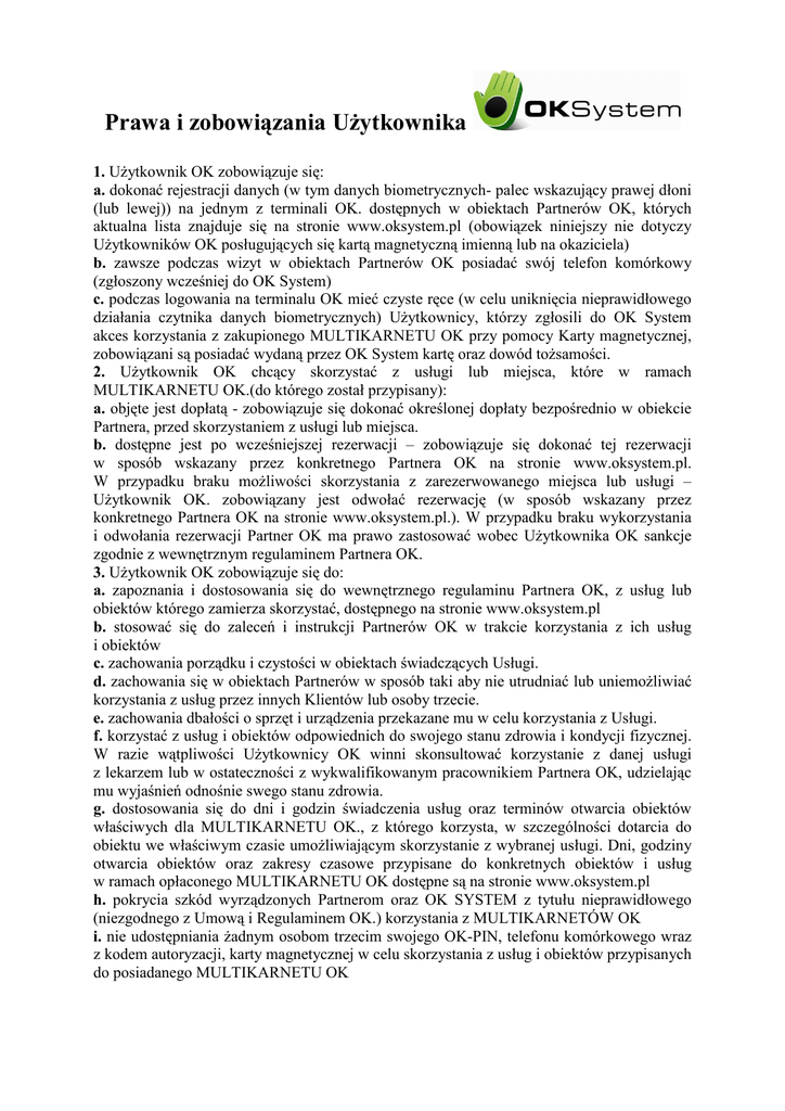 Prawa i zobowiązania Użytkownika 1. Użytkownik OK zobowiązuje się: a. dokonać rejestracji danych (w tym danych biometrycznych- palec wskazujący prawej dłoni (lub lewej)) na jednym z terminali OK. dostępnych w obiektach Partnerów OK, których aktualna lista znajduje się na stronie www.oksystem.pl (obowiązek niniejszy nie dotyczy Użytkowników OK posługujących się kartą magnetyczną imienną lub na okaziciela) b. zawsze podczas wizyt w obiektach Partnerów OK posiadać swój telefon komórkowy (zgłoszony wcześniej do OK System) c. podczas logowania na terminalu OK mieć czyste ręce (w celu uniknięcia nieprawidłowego działania czytnika danych biometrycznych) Użytkownicy, którzy zgłosili do OK System akces korzystania z zakupionego MULTIKARNETU OK przy pomocy Karty magnetycznej, zobowiązani są posiadać wydaną przez OK System kartę oraz dowód tożsamości. 2. Użytkownik OK chcący skorzystać z usługi lub miejsca, które w ramach MULTIKARNETU OK.(do którego został przypisany): a. objęte jest dopłatą - zobowiązuje się dokonać określonej dopłaty bezpośrednio w obiekcie Partnera, przed skorzystaniem z usługi lub miejsca. b. dostępne jest po wcześniejszej rezerwacji – zobowiązuje się dokonać tej rezerwacji w sposób wskazany przez konkretnego Partnera OK na stronie www.oksystem.pl. W przypadku braku możliwości skorzystania z zarezerwowanego miejsca lub usługi – Użytkownik OK. zobowiązany jest odwołać rezerwację (w sposób wskazany przez konkretnego Partnera OK na stronie www.oksystem.pl.). W przypadku braku wykorzystania i odwołania rezerwacji Partner OK ma prawo zastosować wobec Użytkownika OK sankcje zgodnie z wewnętrznym regulaminem Partnera OK. 3. Użytkownik OK zobowiązuje się do: a. zapoznania i dostosowania się do wewnętrznego regulaminu Partnera OK, z usług lub obiektów którego zamierza skorzystać, dostępnego na stronie www.oksystem.pl b. stosować się do zaleceń i instrukcji Partnerów OK w trakcie korzystania z ich usług i obiektów c. zachowania porządku i czystości w obiektach świadczących Usługi. d. zachowania się w obiektach Partnerów w sposób taki aby nie utrudniać lub uniemożliwiać korzystania z usług przez innych Klientów lub osoby trzecie. e. zachowania dbałości o sprzęt i urządzenia przekazane mu w celu korzystania z Usługi. f. korzystać z usług i obiektów odpowiednich do swojego stanu zdrowia i kondycji fizycznej. W razie wątpliwości Użytkownicy OK winni skonsultować korzystanie z danej usługi z lekarzem lub w ostateczności z wykwalifikowanym pracownikiem Partnera OK, udzielając mu wyjaśnień odnośnie swego stanu zdrowia. g. dostosowania się do dni i godzin świadczenia usług oraz terminów otwarcia obiektów właściwych dla MULTIKARNETU OK., z którego korzysta, w szczególności dotarcia do obiektu we właściwym czasie umożliwiającym skorzystanie z wybranej usługi. Dni, godziny otwarcia obiektów oraz zakresy czasowe przypisane do konkretnych obiektów i usług w ramach opłaconego MULTIKARNETU OK dostępne są na stronie www.oksystem.pl h. pokrycia szkód wyrządzonych Partnerom oraz OK SYSTEM z tytułu nieprawidłowego (niezgodnego z Umową i Regulaminem OK.) korzystania z MULTIKARNETÓW OK i. nie udostępniania żadnym osobom trzecim swojego OK-PIN, telefonu komórkowego wraz z kodem autoryzacji, karty magnetycznej w celu skorzystania z usług i obiektów przypisanych do posiadanego MULTIKARNETU OK