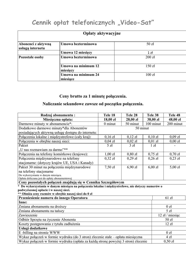 Cennik opłat telefonicznych „Video-Sat” Opłaty aktywacyjne Abonenci z aktywną usługą internetu Pozostałe osoby Umowa bezterminowa 50 zł Umowa 12 miesięcy Umowa bezterminowa 1 zł 200 zł Umowa na minimum 12 miesięcy Umowa na minimum 24 miesiące 150 zł 100 zł Ceny brutto za 1 minutę połączenia. Naliczanie sekundowe zawsze od początku połączenia. Rodzaj abonamentu : Miesięczna opłata: Darmowe minuty w abonamencie*: Dodatkowe darmowe minuty*dla Abonentów posiadających aktywną usługę dostępu do internetu: Połączenia lokalne i międzystrefowe (cały kraj): Połączenia w obrębie naszej sieci: Pakiet „U nas rozmawiam za darmo”** Połączenia na telefony komórkowe (krajowe): Połączenia międzynarodowe na telefony stacjonarne: (dotyczy krajów UE, USA i Kanady) Pakiet 30 minut na połączenia międzynarodowe na telefony stacjonarne Tele 18 18,00 zł 0 minut Tele 28 Tele 38 28,00 zł 38,00 zł 50 minut 100 minut 50 minut Tele 48 48,00 zł 200 minut 0,16 zł 0,04 zł 5 zł 0,12 zł 0,02 zł 3 zł 0,10 zł 0,01 zł 1 zł 0,09 zł 0,00 zł - 1,00 zł 0,32 zł 0,80 zł 0,29 zł 0,75 zł 0,26 zł 0,70 zł 0,23 zł 7,50 zł 6,90 zł 6,00 zł 5,00 zł Do wykorzystania w danym miesiącu. Opłata doliczana jest do opłaty abonamentowej Ceny pozostałych połączeń znajdują się w Cenniku Szczegółowym * Do wykorzystania w danym miesiącu na połączenia lokalne i międzystrefowe, nie dotyczy numerów o podwyższonej opłacie i w naszej sieci. ** Obniża ceny rozmów w obrębie naszej sieci do 0 zł Przeniesienie numeru do innego Operatora Inne: Zmiana abonamentu na droższy Zmiana abonamentu na tańszy Zawieszenie Odbiór Sprzętu na życzenie Abonenta Koszty postępowania z tytułu zadłużenia Usługi dodatkowe E -billing na stronie WWW Wykaz połączeń w formie wydruku (do 3 stron) zlecenie stałe – opłata miesięczna Wykaz połączeń w formie wydruku (opłata za każdą stronę powyżej 3 stron) zlecenie 61 zł 0 zł 5 zł 12 zł / miesiąc 50 zł 12 zł 0 zł 4 zł 0,50 zł stałe – opłata miesięczna Wykaz połączeń w formie wydruku (do 3 stron) - zlecenie jednorazowe Wykaz połączeń w formie wydruku (opłata za każdą stronę powyżej 3 stron) - zlecenie jednorazowe Zmiana numeru – za każdorazowe skorzystanie z usługi 6 zł 0,50 zł 50 zł Opłata za zmianę numeru nie zostanie pobrana jeżeli Abonent wykaże, że korzystanie z przydzielonego numeru telefonicznego jest uciążliwe. Żądanie takie wraz z uzasadnieniem wymaga formy pisemnej pod rygorem nieważności. Blokada połączeń wychodzących Poziom 1 – połączenia na numery o podwyższonej opłacie 5 zł Poziom 2 – połączenia na numery o podwyższonej opłacie i międzynarodowe 5 zł Poziom 3 – połączenia na numery o podwyższonej opłacie, międzynarodowe i 5 zł międzymiastowe Poziom 4 – połączenia na numery o podwyższonej opłacie, międzynarodowe i 5 zł do sieci komórkowych Poziom 5 – połączenia na numery o podwyższonej opłacie, międzynarodowe, 5 zł międzymiastowe i do sieci komórkowych Poziom 6 – połączenia na numery o podwyższonej opłacie, międzynarodowe, 5 zł międzymiastowe, do sieci komórkowych i do internetu Automatyczna blokada połączeń wychodzących – opłata miesięczna 0 zł Przekierowanie połączeń natychmiastowe Opłata za połączenie z numerem docelowym zgodnie z cennikiem Przekierowanie połączeń, gdy linia jest zajęta Przekierowanie połączeń w przypadku nieobecności Połączenie oczekujące W abonamencie Połączenie automatyczne Opłata za połączenie z numerem docelowym zgodnie z cennikiem Wybieranie skrócone Nie przeszkadzać W abonamencie Połączenie trójstronne Opłata za połączenie z numerem docelowym zgodnie z cennikiem Zastrzeżenie numeru W abonamencie Naprawa lub modernizacja sieci w lokalu Abonenta Wg kosztorysu zaakceptowanego przez (z przyczyn leżących po stronie Abonenta lub na jego Abonenta; nie mniej niż 30 zł życzenie) Wymiana (w przypadku uszkodzenia lub zniszczenia) modemu 250 zł Nieuzasadnione wezwanie technika (uszkodzony sprzęt telefoniczny Abonenta, Od 25 zł nieumiejętność obsługi sprzętu, itp.) Objaśnienia do Cennika Usług Telefonicznych Opłata abonamentowa naliczana jest każdego miesiąca z góry, zgodnie z cennikiem danego planu taryfowego. Miesięczna opłata abonamentowa w planach Tele 28, Tele 38 i Tele 48 obejmuje pakiet bezpłatnych minut do wykorzystania na połączenia lokalne, strefowe i międzystrefowe do sieci wszystkich operatorów stacjonarnych naliczany wg kolejności chronologicznej. Niewykorzystane minuty nie są przenoszone do następnego okresu rozliczeniowego. W pierwszym miesiącu świadczenia usługi liczba przysługujących bezpłatnych minut naliczana jest proporcjonalnie od daty instalacji do końca miesiąca kalendarzowego wg wzoru (ilość przysługujących darmowych minut / 30 x ilość dni pozostających do końca miesiąca kalendarzowego). Pakiet bezpłatnych minut oraz bezpłatne połączenia w obrębie sieci”Video-Sat” dotyczą tylko rozmów telefonicznych. W przypadku realizacji połączeń teleinformatycznych i transmisji danych lub realizacji połączeń na numery służące do korzystania z usług innych dostawców opłata za każde połączenie naliczana będzie zgodnie z cennikiem danego planu taryfowego. Oplata jednorazowa za usługę przenoszenia numeru dotyczy zachowania przydzielonego w sieci „Video-Sat” numeru telefonicznego przy zmianie operatora stacjonarnej sieci telefonicznej w ramach tej samej strefy numeracyjnej. Realizacja usługi jest możliwa tylko w przypadku istniejących możliwości technicznych. Wolne od opłat są połączenia telefoniczne ze skróconymi numerami alarmowymi na obszarze tej samej strefy numeracyjnej, ze służbami ustawowo powołanymi do niesienia pomocy, a w szczególności z pogotowiem ratunkowym, pogotowiem straży pożarnej, pogotowiem policji. Data opracowania 05.11.2008