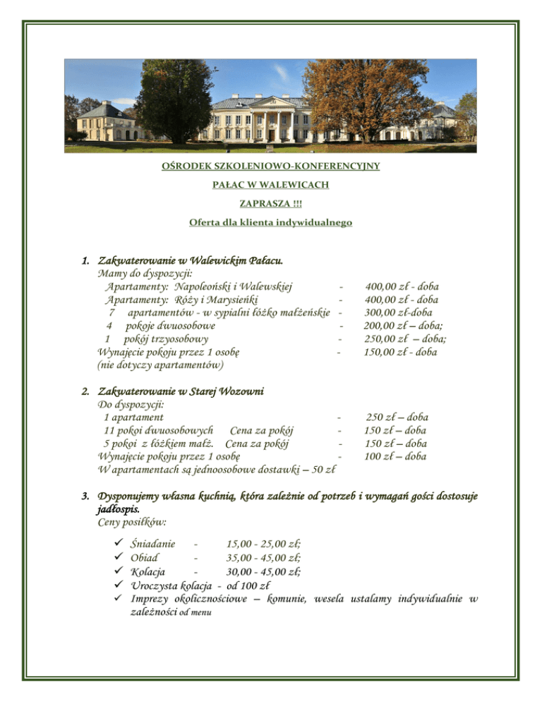 OŚRODEK SZKOLENIOWO-KONFERENCYJNY PAŁAC W WALEWICACH ZAPRASZA !!! Oferta dla klienta indywidualnego 1. Zakwaterowanie w Walewickim Pałacu. Mamy do dyspozycji: Apartamenty: Napoleoński i Walewskiej Apartamenty: Róży i Marysieńki 7 apartamentów - w sypialni łóżko małżeńskie 4 pokoje dwuosobowe 1 pokój trzyosobowy Wynajęcie pokoju przez 1 osobę (nie dotyczy apartamentów) - 2. Zakwaterowanie w Starej Wozowni Do dyspozycji: 1 apartament 11 pokoi dwuosobowych Cena za pokój 5 pokoi z łóżkiem małż. Cena za pokój Wynajęcie pokoju przez 1 osobę W apartamentach są jednoosobowe dostawki – 50 zł 400,00 zł - doba 400,00 zł - doba 300,00 zł-doba 200,00 zł – doba; 250,00 zł – doba; 150,00 zł - doba 250 zł – doba 150 zł – doba 150 zł – doba 100 zł – doba 3. Dysponujemy własna kuchnią, która zależnie od potrzeb i wymagań gości dostosuje jadłospis. Ceny posiłków: Śniadanie 15,00 - 25,00 zł; Obiad 35,00 - 45,00 zł; Kolacja 30,00 - 45,00 zł; Uroczysta kolacja - od 100 zł Imprezy okolicznościowe – komunie, wesela ustalamy indywidualnie w zależności od menu 4. Organizujemy także: Ogniska z grillem w zabytkowym parku, dla licznych grup. Charakter i koszt Uzależniony jest od wymagań, potrzeb i ilości osób (w granicach 50,00 - 100,00 zł od osoby); Naszą specjalnością jest pieczone prosię, karp wędzony i pieczony oraz „krupnik" - gorący napój alkoholowy na bazie miodu z pomarańczami i przyprawami; 5. Posiadamy dwie sale konferencyjne wielkość: 15 m na 6 m (wymiary: długość x szerokość);- koszt wynajmu 500 zł/dzień 6 m na 4 m (wymiary: długość x szerokość); - koszt wynajmu 200 zł/dzień Koszt serwisu kawowego 25 zł/osoby Posiadamy również wyposażenie multimedialne, które udostępniamy na życzenie klienta./dopłata za rzutnik 50 zł/dzień Posiadamy salonik z kominkiem do spotkań kuluarowych. Ponadto w piwnicach pałacowych zorganizowaliśmy fitness – do dyspozycji 2 rowery, rolletic, bieżnia i siłownia. Koszt wykorzystania 15 zł/godz/os. 6. Posiadamy użytkowe piwnice pałacowe: -wynajem całej piwnicy pałacowej - 450,00 zł/dzień -wynajem jednego pomieszczenia w piwnicy - 150,00 zł/dzień 7. Prowadzimy naukę jazdy konnej dla osób początkujących i zaawansowanych. Jazda konna odbywa się na maneżu i w terenie. W okresie jesienno - zimowym jazdy odbywają się na krytej ujeżdżalni. Ceny jazd: Jazda luzem Jazda na lonży Jazda. w terenie - 1 godz. 30 min. 1 godz. - 30,00 zł -40,00 zł 30,00 zł -40,00 zł 30,00zł-40,00zł; Istnieje także możliwość przejażdżki bryczką polową po terenie naszej Stadniny objeżdżając stawy hodowlane Przejażdżka brekiem - 1 godz. Przejażdżka bryczką - 1 godz. Przejażdżka landem lub karetą 1 godz. Przejażdżki saniami 1 godz. (lando wypożyczane jest na uroczystości weselne). 100,00 zł; 150,00 zł 450,00 zł; 150,00 zł; 8.Organizujemy wycieczki z przewodnikiem po stadninie. Koszt wycieczki: Dzieci 3,50 zł od osoby; Dorośli 5,00 zł od osoby; W przypadku chęci zorganizowania wycieczki z przewodnikiem po Stadninie prosimy o wcześniejszy kontakt. a) W razie ewentualnej rezerwacji noclegów, posiłków - ustalenia menu prosimy o kontakt z: Tel.: 046- 838 21 14 lub 0-693422 684 E-Mail: [email protected] lub [email protected] b) W sprawach organizacji wycieczek (również szkolnych), jazd konnych, przejażdżek bryczkami prosimy o kontakt z: Panią Małgorzatą Maciejewską-Zajcew Tel.: 046 - 838 26 81 lub 0-697 841 777 E-mail: [email protected] 9. Dla wędkarzy hobbystów mamy przygotowane dwa łowiska specjalne: Walewice i Psary: Cena za 1 wędkę 30 zł za dzień. WAŻNE !!! Pałac nie pełni funkcji muzeum, ponieważ jest zakładem pracy i hotelem, w szczególnych przypadkach możemy udostępnić zwiedzenie ciekawych miejsc w pałacu po wcześniejszym uzgodnieniu z: Panią Katarzyną Stefaniak Tel.693 422 684 , e-mail: [email protected] lub [email protected] CIEKAWE MIEJSCA TO: Apartament, w którym przebywał Cesarz Napoleon Bonaparte - z oryginalnymi tapetami z papieru czerpanego ręcznie z początku 19-tego wieku. Kaplica pałacowa wraz z historią Walewic. Koszt wycieczki po pałacu 5,00 zł od osoby (przyjmowane grupa minimum 10 osób). Koszt wycieczki po pałacu dla mniejszej grupy niż 10 osób - 10 zł/osoby