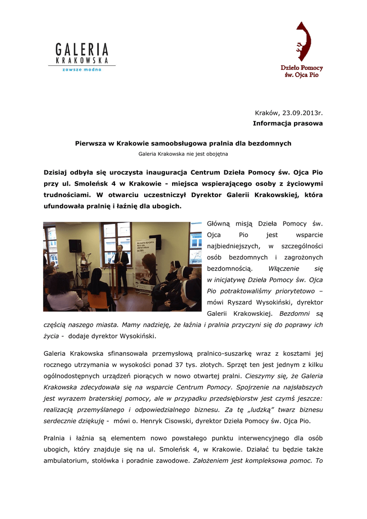 Kraków, 23.09.2013r. Informacja prasowa Pierwsza w Krakowie samoobsługowa pralnia dla bezdomnych Galeria Krakowska nie jest obojętna Dzisiaj odbyła się uroczysta inauguracja Centrum Dzieła Pomocy św. Ojca Pio przy ul. Smoleńsk 4 w Krakowie - miejsca wspierającego osoby z życiowymi trudnościami. W otwarciu uczestniczył Dyrektor Galerii Krakowskiej, która ufundowała pralnię i łaźnię dla ubogich. Główną misją Dzieła Pomocy św. Ojca Pio jest najbiedniejszych, osób w bezdomnych bezdomnością. wsparcie szczególności i zagrożonych Włączenie się w inicjatywę Dzieła Pomocy św. Ojca Pio potraktowaliśmy priorytetowo – mówi Ryszard Wysokiński, dyrektor Galerii Krakowskiej. Bezdomni są częścią naszego miasta. Mamy nadzieję, że łaźnia i pralnia przyczyni się do poprawy ich życia - dodaje dyrektor Wysokiński. Galeria Krakowska sfinansowała przemysłową pralnico-suszarkę wraz z kosztami jej rocznego utrzymania w wysokości ponad 37 tys. złotych. Sprzęt ten jest jednym z kilku ogólnodostępnych urządzeń piorących w nowo otwartej pralni. Cieszymy się, że Galeria Krakowska zdecydowała się na wsparcie Centrum Pomocy. Spojrzenie na najsłabszych jest wyrazem braterskiej pomocy, ale w przypadku przedsiębiorstw jest czymś jeszcze: realizacją przemyślanego i odpowiedzialnego biznesu. Za tę „ludzką” twarz biznesu serdecznie dziękuję - mówi o. Henryk Cisowski, dyrektor Dzieła Pomocy św. Ojca Pio. Pralnia i łaźnia są elementem nowo powstałego punktu interwencyjnego dla osób ubogich, który znajduje się na ul. Smoleńsk 4, w Krakowie. Działać tu będzie także ambulatorium, stołówka i poradnie zawodowe. Założeniem jest kompleksowa pomoc. To co będziemy oferować w nowym punkcie ma charakter interwencyjny – mówi o. Henryk Cisowski. Jednak w połączeniu z poradnią Centrum Pomocy przy ul. Loretańskiej – zagwarantuje pełne wsparcie – podkreśla inicjator przedsięwzięcia. Przy Loretańskiej od trzech lata działa bowiem także poradnia socjalna, prawna, psychologiczna i zawodowa. Tam tworzone są indywidualne programy wsparcia dla osób potrzebujących. Przychodzą do nas osoby samotne, chore, ubogie. Jedni potrzebują pracy, inni wsparcia duchowego, jeszcze inni po prostu chleba. Pomoc, którą oferujemy możliwa jest głównie dzięki wsparciu z 1%, które otrzymaliśmy od przyjaciół – dodaje o. Henryk. W pomaganie - oprócz Braci Kapucynów, Zakonu Sióstr Felicjanek, wielu świeckich – zaangażowanych są setki wolontariuszy. I ten jeden, najważniejszy: św. o. Pio, który w poszukiwaniu samotnych i bezdomnych zagląda nawet do Galerii Krakowskiej. Dzieło Pomocy św. Ojca Pio powstało w 2004 roku z inicjatywy Braci Mniejszych Kapucynów jako wyraz franciszkańskiej wrażliwości wobec ubogich, którzy od zawsze szukali pomocy u krakowskich kapucynów. Główną misją Dzieła jest wsparcie najbiedniejszych, w szczególności osób bezdomnych i zagrożonych bezdomnością, osób samotnych, uzależnionych, dotkniętych chorobą lub niepełnosprawnością. Celem Dzieła Pomocy św. Ojca Pio jest niesienie kompleksowej pomocy osobom potrzebującym poprzez różnorodne działania wspierające i promujące osobę ludzką w jej integralnym rozwoju, a także budzenie i wspieranie postaw prospołecznych oraz inicjatyw obywatelskich na rzecz ubogich i potrzebujących. Więcej informacji udziela: Ryszard Wysokiński: Dyrektor Centrum Galerii Krakowskiej, ECE Projektmanagement Polska, tel.: +48 12 428 99 00, e-mail: [email protected]