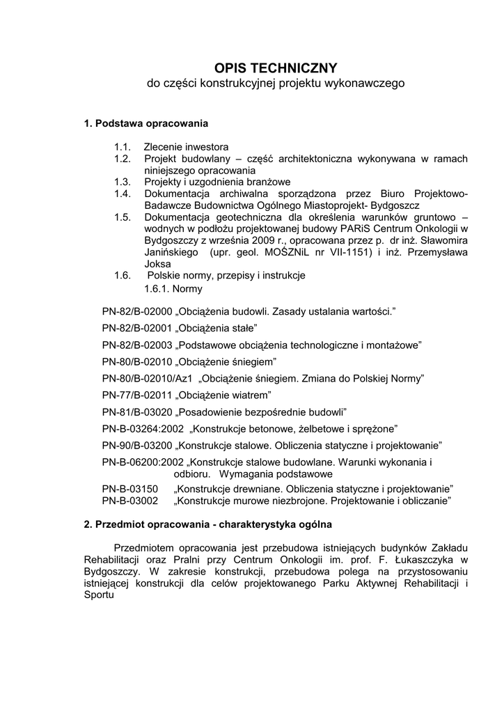 OPIS TECHNICZNY do części konstrukcyjnej projektu wykonawczego 1. Podstawa opracowania 1.1. 1.2. 1.3. 1.4. 1.5. 1.6. Zlecenie inwestora Projekt budowlany – część architektoniczna wykonywana w ramach niniejszego opracowania Projekty i uzgodnienia branŜowe Dokumentacja archiwalna sporządzona przez Biuro ProjektowoBadawcze Budownictwa Ogólnego Miastoprojekt- Bydgoszcz Dokumentacja geotechniczna dla określenia warunków gruntowo – wodnych w podłoŜu projektowanej budowy PARiS Centrum Onkologii w Bydgoszczy z września 2009 r., opracowana przez p. dr inŜ. Sławomira Janińskiego (upr. geol. MOŚZNiL nr VII-1151) i inŜ. Przemysława Joksa Polskie normy, przepisy i instrukcje 1.6.1. Normy PN-82/B-02000 „ObciąŜenia budowli. Zasady ustalania wartości.” PN-82/B-02001 „ObciąŜenia stałe” PN-82/B-02003 „Podstawowe obciąŜenia technologiczne i montaŜowe” PN-80/B-02010 „ObciąŜenie śniegiem” PN-80/B-02010/Az1 „ObciąŜenie śniegiem. Zmiana do Polskiej Normy” PN-77/B-02011 „ObciąŜenie wiatrem” PN-81/B-03020 „Posadowienie bezpośrednie budowli” PN-B-03264:2002 „Konstrukcje betonowe, Ŝelbetowe i spręŜone” PN-90/B-03200 „Konstrukcje stalowe. Obliczenia statyczne i projektowanie” PN-B-06200:2002 „Konstrukcje stalowe budowlane. Warunki wykonania i odbioru. Wymagania podstawowe PN-B-03150 „Konstrukcje drewniane. Obliczenia statyczne i projektowanie” PN-B-03002 „Konstrukcje murowe niezbrojone. Projektowanie i obliczanie” 2. Przedmiot opracowania - charakterystyka ogólna Przedmiotem opracowania jest przebudowa istniejących budynków Zakładu Rehabilitacji oraz Pralni przy Centrum Onkologii im. prof. F. Łukaszczyka w Bydgoszczy. W zakresie konstrukcji, przebudowa polega na przystosowaniu istniejącej konstrukcji dla celów projektowanego Parku Aktywnej Rehabilitacji i Sportu 3. Opis stanu istniejącego oraz ocena stanu technicznego konstrukcji pod kątem planowanej rozbudowy Istniejący budynek Zakładu Rehabilitacji to budynek dwukondygnacyjny, podpiwniczony, wybudowany w latach 80-tych i 90-tych dwudziestego wieku. Został on wykonany w układzie podłuŜnym, dwutraktowym w konstrukcji Ŝelbetowej monolitycznej ze stropami prefabrykowanymi w postaci płyt kanałowych lub płyt spręŜonych typu SPIROLL. Konstrukcję stropodachu stanowią równieŜ płyty kanałowe lub spręŜone typu SPIROLL wraz z płytami korytkowmi opartymi na ścankach aŜurowych. Płyty stropowe oparte na monolitycznych, Ŝelbetowych podciągach i słupach lub na ścianach murowanych. Klatki schodowe oraz szyby windowe wykonane jako monolityczne, Ŝelbetowe. Istniejący budynek Zakładu Rehabilitacji posadowiony jest bezpośrednio na stopach i ławach fundamentowych. Fundamenty posadowione są głównie na warstwie twardoplastycznych iłów pylastych (IL=0,10) lub piasków średnich i grubych w stanie średniozagęszczonym o ID=0,60. Istniejący budynek Pralni to budynek dwukondygnacyjny, podpiwniczony, wybudowany w latach 80-tych i 90-tych dwudziestego wieku. Został on wykonany w układzie podłuŜnym, trój- i pięcionawowym w konstrukcji Ŝelbetowej monolitycznej ze stropami prefabrykowanymi w postaci płyt kanałowych lub ze stropami monoltycznymi, Ŝelbetowymi. Konstrukcję stropodachu stanowią równieŜ płyty kanałowe wraz z płytami korytkowmi opartymi na ścankach aŜurowych. Na części wyŜszej budynku Pralni na konstrukcję stropodachu zastosowano płyty panwiowe oparte na dźwigarach prefabrykowanych strunobetonowych. Płyty stropowe oparte na monolitycznych, Ŝelbetowych podciągach i słupach lub na ścianach murowanych. Klatki schodowe oraz szyby windowe wykonane jako monolityczne, Ŝelbetowe. Istniejący budynek Pralni posadowiony jest bezpośrednio na stopach i ławach fundamentowych. Fundamenty posadowione są głównie na warstwie piasków od drobnych do średnich i grubych w stanie średniozagęszczonym i zagęszczonym o ID=0,55÷0,70. Obliczeniowy opór jednostkowy podłoŜa (m x qf) dla tych warunków wynosi ok. 300 kPa dla stóp i ok. 250 kPa dal ław fundamentowych. Obiekty budowlane, będące przedmiotem przebudowy znajdują się w dobrym stanie technicznym. Planowana przebudowa nie spowoduje zwiększenia sił wewnętrznych i napręŜeń w istniejących ustrojach konstrukcyjnych. RównieŜ napręŜenia w gruncie pod istniejącymi fundamentami w wyniku projektowanej przebudowy nie osiągną wartości uznawanych za dopuszczalne. 4. Przyjęte obciąŜenia 4.1 Przyjęte obciąŜenia zmienne (wartości charakterystyczne) - obciąŜenie śniegiem – II strefa; Qk = 0,9 kN/m2 - obciąŜenie wiatrem – I strefa; qk = 0,25 kN/m2; teren typu B - obciąŜenie zmienne uŜytkowe stropów: 5,0 kN/m2 – dla stropu nad piwnicą (sal gimnastyczna, pom. techniczne) 2,0 kN/m2 – dla pozostałych stropów (pom. gabinetów lekarskich, szatnie, pom. biurowe) - obciąŜenie technologiczne stropów (instalacje + sufity podwieszane) – 0, 30 kN/m2 - - obciąŜenie zastępcze od ścianek działowych – dla ścian lekkich w systemie 2 G-K o cięŜarze ściany do 50 kG/m przyjęto obciąŜenie zastępcze 2 równomiernie rozłoŜone 0,25 kN/m obciąŜenie od urządzeń dachowych - przyjęto indywidualnie na podstawie danych przekazanych przez Projektantów instalacji oraz kart technicznych urządzeń 4.2 Metoda obliczeń Obliczenia statyczne wraz z wymiarowaniem wykonano metodą stanów granicznych nośności i uŜytkowania. W przypadku zmiany niniejszych załoŜeń naleŜy wykonać obliczenia sprawdzające konstrukcję. 4.3 Pomoce projektowe Obliczenia statyczne i wymiarowanie elementów konstrukcji budynku wykonano pomocy następujących programów komputerowych: RM-Win w. 10.0 „Program do analizy statycznej płaskich konstrukcji prętowych” RM-śelbet w. 5.1 „Program do wymiarowania konstrukcji Ŝelbetowych wg PN-B-03264:2002 ” PL-Win 2 w. 2.14 „Program do analizy statycznej konstrukcji płytowych oraz do wymiarowania konstrukcji Ŝelbetowy