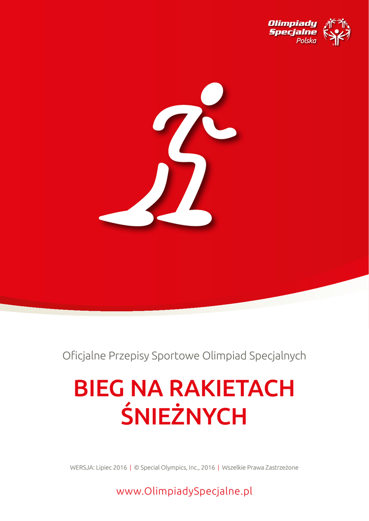 3 LA RA Oficjalne Przepisy Sportowe Olimpiad Specjalnych BIEG NA RAKIETACH ŚNIEŻNYCH WERSJA: Lipiec 2016 | © Special Olympics, Inc., 2016 | Wszelkie Prawa Zastrzeżone www.OlimpiadySpecjalne.pl BIEG NA RAKIETACH ŚNIEŻNYCH 3 LA RAZ BIEG NA RAKIETACH ŚNIEŻNYCH 1. PRZEPISY REGULUJĄCE Oficjalne Przepisy Olimpiad Specjalnych obowiązują na wszystkich zawodach Biegów na Rakietach Śnieżnych Olimpiad Specjalnych. Special Olympics, Inc. jest międzynarodową organizacją zarządzającą Biegami na Rakietach Śnieżnych. Artykuł 1, Oficjalnych Przepisów Olimpiad Specjalnych, mówi o Kodeksach Postępowania, standardach treningowych, wymaganiach medycznych i bezpieczeństwa, podziale na grupy, kryteriach awansu na wyższy szczebel zawodów i sportach zunifikowanych. 2. OFICJALNE KONKURENCJE Intencją tej listy konkurencji jest danie możliwości rywalizacji zawodnikom na wszystkich poziomach sprawności. Organizatorzy mogą dowolnie określić zakres rywalizacji i jeśli jest to potrzebne, określić wytyczne do organizacji takiej imprezy. Trenerzy są odpowiedzialni za odpowiednie wytrenowanie i odpowiedni dobór konkurencji do poziomu i możliwości zawodnika. Poniżej znajduje się lista oficjalnych konkurencji dostępnych na zawodach Olimpiad Specjalnych: 2.1. Wyścig na 25 metrów (25m) 2.2. Wyścig na 50 metrów (50m) 2.3. Wyścig na 100 metrów (100m) 2.4. Wyścig na 200 metrów (200m) 2.5. Wyścig na 400 metrów (400m) 2.6. Wyścig na 800 metrów (800m) 2.7. Wyścig na 1600 metrów (1600m) 2.8. Wyścig na 5 kilometrów (5K) 2.9. Wyścig na 10 kilometrów (10K) 2.10.Wyścig sztafet 4 x 100 metrów (4x100m) 2.11.Wyścig sztafet 4 x 200 metrów (4x200m) 2.12.Wyścig sztafet 4 x 400 metrów (4x400m) 2.13.Wyścig sztafet zunifikowanych 4 x 100 metrów (4x100mU) 2.14.Wyścig sztafet zunifikowanych 4 x 200 metrów (4x 200mU) 2.15.Wyścig sztafet zunifikowanych 4 x 400 metrów (4x400mU) 3. PRZEBIEG TRAS 3.1. Trasa wyścigu 3.1.1.Trasa do wyścigu to 400-metrowa pętla, z przynajmniej metrowej szerokości torami dla poszczególnych zawodników biorących udział w biegu. 3.1.2. 400 metrowa pętla powinna być względnie płaska. 3.1.3.Trasa powinna być tak przygotowana aby na całej jej długości panowały zbliżone do siebie warunki. 3.1.4. Kierunek biegu po pętli powinien być lewoskrętny. 3.2. Trasa wyścigu długodystansowego 3.2.1.Wyścig długodystansowy (1600 m lub więcej) może przebiegać po różnych trasach/pętlach i przez zróżnicowany teren. 3.3. Układ toru do danych konkurencji powinien składać się z: 3.3.1. Wyścig na 25 m, 50 m i 100 m. 3.3.1.1.Bieg na części prostej pętli lub na oddzielnym, wyznaczonym do tych konkurencji prostym torze aby umożliwić równoległe przeprowadzanie konkurencji. 2 Wszelkie Prawa Zastrzeżone WERSJA: Lipiec 2016 © Special Olympics, Inc., 2016 BIEG NA RAKIETACH ŚNIEŻNYCH 3 LA RAZ 3.3.2. 3.3.3. 3.3.4. 3.3.5. 3.3.6. 3.3.7. 3.3.8. 3.3.9. 3.3.1.2.Dla konkurencji 25 m, 50 m i 100 m tory powinny być zaznaczone liniami na całej długości toru. 3.3.1.3. Tory powinny mieć między 1 m do 1.7 m (preferowany) szerokości. Wyścig na 200 metrów. 3.3.2.1. Połowa pętli 400 metrów. Wyścig na 400 metrów. 3.3.3.1. Jedno okrążenie pętli 400 metrów. Wyścig na 800 metrów. 3.3.4.1. Dwa okrążenia pętli 400 metrów. Wyścig na 1600 metrów. 3.3.5.1.Bieg po zróżnicowanym terenie z możliwością wykorzystania pętli 400 metrów jako startu i mety. Wyścig na 5 i 10 kilometrów. 3.3.6.1. Bieg po trasie w zróżnicowanym terenie. Wyścig sztafet 4 x 100 metrów. 3.3.7.1. Bieg po pętli 400 metrów z 3 strefami zmian. 3.3.7.2. Każda strefa ma mieć 20 metrów długości i musi być wyraźnie oznakowana. 3.3.7.3. Początek strefy zmian powinien znajdować się bliżej linii startowej. Wyścig sztafet 4 x 200 metrów. 3.3.8.1. Bieg po pętli 400 metrów z 1 strefą zmian. 3.3.8.2. Strefa zmian ma mieć 20 metrów długości i musi być wyraźnie oznakowana. 3.3.8.3. Początek strefy zmian ma być bliższy/bliżej linii startowej. Wyścig sztafet 4 x 400 metrów. 3.3.9.1. Bieg po pętli 400 metrów z 1 strefą zmian. 3.3.9.2. Strefa zmian ma mieć 20 metrów długości i musi być wyraźnie oznakowana. 3.3.9.3. Początek strefy zmian ma być bliższy/bliżej linii startowej. 4. SPRZĘT 4.1. Rakiety Śnieżne 4.1.1.Rama rakiety nie może być mniejsza niż 17.78 cm x 50.8 cm. Pomiar będzie wzięty w najdłuższym i najszerszym miejscu rakiety. Pomiar ramy rakiety śnieżnej nie będzie brany z krzywizn rakiety. Rakiety śnieżne powinny mieć na ramie przynajmniej dwa punkty oddalone od siebie o niemniej niż 17.78 cm (szerokość) i przynajmniej dwa punkty oddalone od siebie o niemniej niż 50.8 cm (długość). 4.1.2.Fabrycznie zamocowane kolce na palcach i pięcie są do przyjęcia. Mocowanie dodatkowych kolców jest niedozwolone. 4.1.3. Rakieta powinna składać się z ramy i siatki lub stałego wypełnienia. 4.1.4. Stopa musi być przymocowana bezpośrednio do rakiety przy pomocy wiązania. 4.1.5.Zawodnicy muszą używać dwóch takich samych rakiet (typ, marka, styl rozmiar) i takiego samego ubioru podczas całych zawodów. 4.2. Obuwie 4.2.1.Obuwiem na zawodach może być: obuwie biegowe, obuwie turystyczne (górskie) lub obuwie zimowe (na śnieg). Wszyscy zawodnicy muszą mieć na nogach obuwie. 4.3. Kijki 4.3.1.Używanie kijków jest dozwolone i decyzja o ich użyciu pozostaje w gestii zawodnika/ trenera. 4.4. Nr startowy 3 Wszelkie Prawa Zastrzeżone WERSJA: Lipiec 2016 © Special Olympics, Inc., 2016 BIEG NA RAKIETACH ŚNIEŻNYCH 3 LA RAZ 4.4.1.Numer startowy musi być widoczny i umieszczony z przodu (okolice klatki piersiowej) zawodnika, podczas całych zawodów. 5. PERSONEL 5.1. Sędziowie 5.1.1.1. Szef toru 5.1.1.2. Szef wyścigu 5.1.1.3. Szef Sędziów startowych (Starterzy) 5.1.1.4. Asystent Sędziego startowego (Asystent Startera) 5.1.1.5. Sędzia mety 5.1.1.6. Sędziowie polowi – trasy 5.1.1.7. Szef sędziów czas