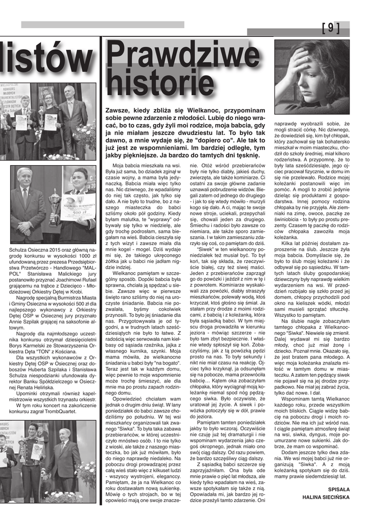 [9] listów Prawdziwe historie Zawsze, kiedy zbliża się Wielkanoc, przypominam sobie pewne zdarzenie z młodości. Lubię do niego wracać, bo to czas, gdy żyli moi rodzice, moja babcia, gdy ja nie miałam jeszcze dwudziestu lat. To było tak dawno, a mnie wydaje się, że "dopiero co". Ale tak to już jest ze wspomnieniami. Im bardziej odległe, tym jakby piękniejsze. Ja bardzo do tamtych dni tęsknię. Schulza Osieczna 2015 oraz główną nagrodę konkursu w wysokości 1000 zł ufundowaną przez prezesa Przedsiębiorstwa Przetwórczo - Handlowego "MALPOL" Stanisława Malickiego jury postanowiło przyznać Joachimowi Rufael grającemu na trąbce z Dziecięco - Młodzieżowej Orkiestry Dętej w Krobi. Nagrodę specjalną Burmistrza Miasta i Gminy Osieczna w wysokości 500 zł dla najlepszego wykonawcy z Orkiestry Dętej OSP w Osiecznej jury przyznało Annie Szpilak grającej na saksofonie altowym. Nagrodę dla najmłodszego uczestnika konkursu otrzymał dziesięcioletni Borys Karmelski ze Stowarzyszenia Orkiestra Dęta "TON" z Kościana. Dla wszystkich wykonawców z Orkiestry Dętej OSP w Osiecznej oraz doboszów Huberta Szpilaka i Stanisława Schulza niespodzianki ufundowała dyrektor Banku Spółdzielczego w Osiecznej Renata Helińska. Upominki otrzymali również kapelmistrzowie wszystkich trzynastu orkiestr. W tym roku koncert na zakończenie konkursu zagrał TrombQuartet. Moja babcia mieszkała na wsi. Była już sama, bo dziadek zginął w czasie wojny, a mama była jedynaczką. Babcia miała więc tylko nas. Nic dziwnego, że wpadaliśmy do niej tak często, jak tylko się dało. A nie było to trudne, bo z naszego miasteczka do babci szliśmy około pół godziny. Kiedy byłam malutka, te "wyprawy" odbywały się tylko w niedzielę, ale gdy trochę podrosłam, sama biegałam na wieś. Babcia cieszyła się z tych wizyt i zawsze miała dla mnie kogel - mogel. Dziś wydaje mi się, że takiego ukręconego żółtka jak u babci nie jadłam nigdzie indziej. Wielkanoc pamiętam w szczególny sposób. Dopóki babcia była sprawna, chciała ją spędzać u siebie. Zawsze więc w pierwsze święto rano szliśmy do niej na uroczyste śniadanie. Babcia nie pozwalała, byśmy cokolwiek przynosili. To było jej śniadanie dla nas. Przygotowywała je od tygodni, a w trudnych latach sześćdziesiątych nie było to łatwe. Z radością więc serwowała nam kiełbasy od sąsiada rzeźnika, jajka z własnego kurnika, szynki. Moja mama mówiła, że wielkanocne śniadania u babci były "na bogato". Teraz jest tak w każdym domu, więc pewnie to moje wspomnienie może trochę śmieszyć, ale dla mnie ma po prostu zapach rodzinnego domu. Opowiedzieć chciałam wam jednak o drugim dniu świąt. W lany poniedziałek do babci zawsze chodziliśmy po południu. W tej wsi mieszkańcy organizowali tak zwanego "Siwka". To była taka zabawa przebierańców, w której uczestniczyło mnóstwo osób. I to nie tylko z wioski, ale także z naszego miasteczka, bo jak już mówiłam, było do niego naprawdę niedaleko. Na poboczu drogi prowadzącej przez całą wieś stało więc z kilkuset ludzi - wszyscy wystrojeni, eleganccy. Pamiętam, że ja na Wielkanoc co roku dostawałam nową sukienkę. Mówię o tych strojach, bo w tej opowieści mają one swoje znacze- nie. Otóż wśród przebierańców były nie tylko diabły, jakieś duchy, zwierzęta, ale także kominiarze. Ci ostatni za swoje główne zadanie uznawali pobrudzenie widzów. Biegali zatem od jednego do drugiego - i jak to się wtedy mówiło - murzyli kogo się dało. A ci, mając te swoje nowe stroje, uciekali, przepychali się, chowali jeden za drugiego. Śmiechu i radości było zawsze co niemiara, ale także sporo zamieszania. I w takim zamieszaniu zdarzyło się coś, co pamiętam do dziś. “Siwek” w ten wielkanocny poniedziałek też musiał być. To był koń, tak się składa, że rzeczywiście białej, czy też siwej maści. Jeden z przebierańców zaprzągł go do powózki i jeździł z nim w tę i z powrotem. Kominiarze wyskakiwali zza powózki, diabły straszyły mieszkańców, polewały wodą, ktoś krzyczał, ktoś głośno się śmiał. Ja stałam przy drodze z moimi rodzicami, z babcią i z koleżanką, która była sąsiadką babci. W tym miejscu droga prowadziła w kierunku jeziora - mówiąc szczerze - nie było tam zbyt bezpiecznie. I właśnie wtedy spłoszył się koń. Zobaczyliśmy, jak z tą powózką pędzi prosto na nas. To były sekundy i nikt nie miał czasu na reakcję. Ojciec tylko krzyknął, ja odsunęłam się na pobocze, mama przewróciła babcię… Kątem oka zobaczyłam chłopaka, który wyciągnął moją koleżankę niemal spod nóg pędzącego siwka. Było oczywiste, że uratował jej życie. A siwek i powózka potoczyły się w dół, prawie do jeziora. Pamiętam tamten poniedziałek jakby to było wczoraj. Oczywiście nie czuję już tej dramaturgii i nie wspominam wydarzenia jako czegoś okropnego, jednak miało ono swój ciąg dalszy. Od razu powiem, że bardzo szczęśliwy ciąg dalszy. Z sąsiadką babci szczerze się zaprzyjaźniłam. Ona była ode mnie prawie o pięć lat młodsza, ale kiedy tylko wpadałam na wieś, zawsze spotykałam się także z nią. Opowiadała mi, jak bardzo jej rodzice przeżyli tamto zdarzenie. Oni naprawdę wyobrazili sobie, że mogli stracić córkę. Nic dziwnego, że dowiedzieli się, kim był chłopak, który zachował się tak bohatersko mieszkał w moim miasteczku, chodził do szkoły średniej, miał kilkoro rodzeństwa. A przypomnę, że to były lata sześćdziesiąte, jego ojciec pracował fizycznie, w domu im się nie przelewało. Rodzice mojej koleżanki postanowili więc im pomóc. A mogli to zrobić jedynie dzieląc się produktami z gospodarstwa. Innej pomocy rodzina chłopaka by nie przyjęła. Ale ziemniaki na zimę, owoce, paczkę ze świniobicia - to były po prostu prezenty. Czasem tę paczkę do rodziców chłopaka zawoziła moja koleżanka. Kilka 