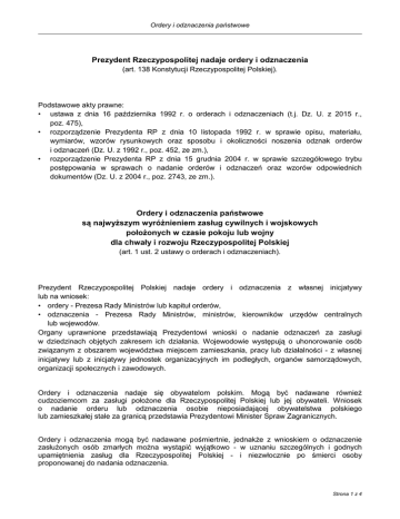 Ordery i odznaczenia państwowe Prezydent Rzeczypospolitej nadaje ordery i odznaczenia (art. 138 Konstytucji Rzeczypospolitej Polskiej). Podstawowe akty prawne: • ustawa z dnia 16 października 1992 r. o orderach i odznaczeniach (t.j. Dz. U. z 2015 r., poz. 475), • rozporządzenie Prezydenta RP z dnia 10 listopada 1992 r. w sprawie opisu, materiału, wymiarów, wzorów rysunkowych oraz sposobu i okoliczności noszenia odznak orderów i odznaczeń (Dz. U. z 1992 r., poz. 452, ze zm.), • rozporządzenie Prezydenta RP z dnia 15 grudnia 2004 r. w sprawie szczegółowego trybu postępowania w sprawach o nadanie orderów i odznaczeń oraz wzorów odpowiednich dokumentów (Dz. U. z 2004 r., poz. 2743, ze zm.). Ordery i odznaczenia państwowe są najwyższym wyróżnieniem zasług cywilnych i wojskowych położonych w czasie pokoju lub wojny dla chwały i rozwoju Rzeczypospolitej Polskiej (art. 1 ust. 2 ustawy o orderach i odznaczeniach). Prezydent Rzeczypospolitej Polskiej nadaje ordery i odznaczenia z własnej inicjatywy lub na wniosek: • ordery - Prezesa Rady Ministrów lub kapituł orderów, • odznaczenia - Prezesa Rady Ministrów, ministrów, kierowników urzędów centralnych lub wojewodów. Organy uprawnione przedstawiają Prezydentowi wnioski o nadanie odznaczeń za zasługi w dziedzinach objętych zakresem ich działania. Wojewodowie występują o uhonorowanie osób związanym z obszarem województwa miejscem zamieszkania, pracy lub działalności - z własnej inicjatywy lub z inicjatywy jednostek organizacyjnych im podległych, organów samorządowych, organizacji społecznych i zawodowych. Ordery i odznaczenia nadaje się obywatelom polskim. Mogą być nadawane również cudzoziemcom za zasługi położone dla Rzeczypospolitej Polskiej lub jej obywateli. Wniosek o nadanie orderu lub odznaczenia osobie nieposiadającej obywatelstwa polskiego lub zamieszkałej stale za granicą przedstawia Prezydentowi Minister Spraw Zagranicznych. Ordery i odznaczenia mogą być nadawane pośmiertnie, jednakże z wnioskiem o odznaczenie zasłużonych osób zmarłych można wystąpić wyjątkowo - w uznaniu szczególnych i godnych upamiętnienia zasług dla Rzeczypospolitej Polskiej - i niezwłocznie po śmierci osoby proponowanej do nadania odznaczenia. Strona 1 z 4 Ordery i odznaczenia państwowe Odznaki nadanych orderów i odznaczeń wręcza Prezydent RP bądź w jego imieniu: • osoby uprawnione do występowania z wnioskami o nadanie orderów i odznaczeń oraz ich zastępcy, • w Siłach Zbrojnych - dowódcy upoważnieni przez Ministra Obrony Narodowej oraz Ministra Spraw Wewnętrznych, • za granicą - kierownicy polskich placówek dyplomatycznych i konsularnych. Odznakę Medalu za Długoletnie Pożycie Małżeńskie mogą w imieniu Prezydenta RP wręczać także: marszałek województwa, starosta, prezydent miasta, burmistrz oraz wójt. Wyjątkowo Prezydent RP może upoważnić do wręczenia inną osobę. Jednym z siedmiu cywilnych odznaczeń nadawanych przez Prezydenta RP jest Medal za Długoletnią Służbę. Odznaczenie to - ustanowione w 1938 r., a przywrócone w 2007 r. jest nagrodą za wzorowe, wyjątkowo sumienne wykonywanie obowiązków wynikających z pracy zawodowej w służbie Państwa. W zależności od długości ogólnego stażu pracy osoby proponowanej do odznaczenia Medal za Długoletnią Służbę dzieli się na trzy stopnie: • I stopień - Medal Złoty za Długoletnią Służbę (nadawany po upływie minimum 30 lat pracy zawodowej), • II stopień - Medal Srebrny za Długoletnią Służbę (nadawany po upływie minimum 20 lat pracy zawodowej), • III stopień - Medal Brązowy za Długoletnią Służbę (nadawany po upływie minimum 10 lat pracy zawodowej). Z inicjatywą uhonorowania pracownika Medalem za Długoletnią Służbę występuje do wojewody aktualny pracodawca kandydata do wyróżnienia - nie wcześniej niż po upływie 10 lat od ostatniego nadania. W przypadku osoby, która w danym roku nabywa prawo do emerytury, wniosek o nadanie Medalu za Długoletnią Służbę przedstawia się najpóźniej w dniu rozwiązania stosunku pracy z tą osobą. Dla zasłużonego działacza społecznego wystąpić można o nadanie Krzyża Zasługi. Wyróżnienie to ustanowione zostało w 1923 r. i nadawane jest osobom, które położyły zasługi dla państwa lub obywateli spełniając czyny przekraczające zakres ich zwykłych obowiązków, a przynoszące znaczną korzyść państwu lub obywatelom. Może być także przyznawane za: ofiarną działalność publiczną, ofiarne niesienie pomocy oraz działalność charytatywną. Przed laty Krzyż Zasługi nadawano również za wzorowe, wyjątkowo sumienne wykonywanie pracy zawodowej - obecnie dokonania profesjonalne nagradzane są Medalem za Długoletnią Służbę. Krzyż Zasługi dzieli się na trzy stopnie: • I stopień Złoty Krzyż Zasługi, • II stopień Srebrny Krzyż Zasługi, • III stopień Brązowy Krzyż Zasługi. Przed nadaniem Krzyża Zasługi wyższego stopnia powinny upłynąć co najmniej 3 lata. Ustanowiony w 1921 r. Order Odrodzenia Polski stanowi - za Orderem Orła Białego - najwyższe cywilne wyróżnienie w naszym kraju. Nadawany jest za wybitne zasługi położone w służbie Państwu i społeczeństwu, a zwłaszcza za wybitne osiągnięcia w działalności publicznej podejmowanej z pożytkiem dla kraju, za szczególne zasługi dla umacniania suwerenności i obronności kraju, dla rozwoju gospodarki narodowej, służby publicznej, za wybitną twórczość naukową, literacką i artystyczną, za wybitne zasługi dla rozwoju współpracy Rzeczypospolitej Polskiej z innymi państwami i narodami. Order ten dzieli się na pięć klas: • klasa I Krzyż Wielki Orderu Odrodzenia Polski, • klasa II Krzyż Komandorski z Gwiazdą Orderu Odrodzenia Polski, Strona 2 z 4 Ordery i odznaczenia państwowe • • • klasa III Krzyż Komandorski Orderu Odrodzenia Polski, klasa IV Krzyż Oficerski Orderu Odrod