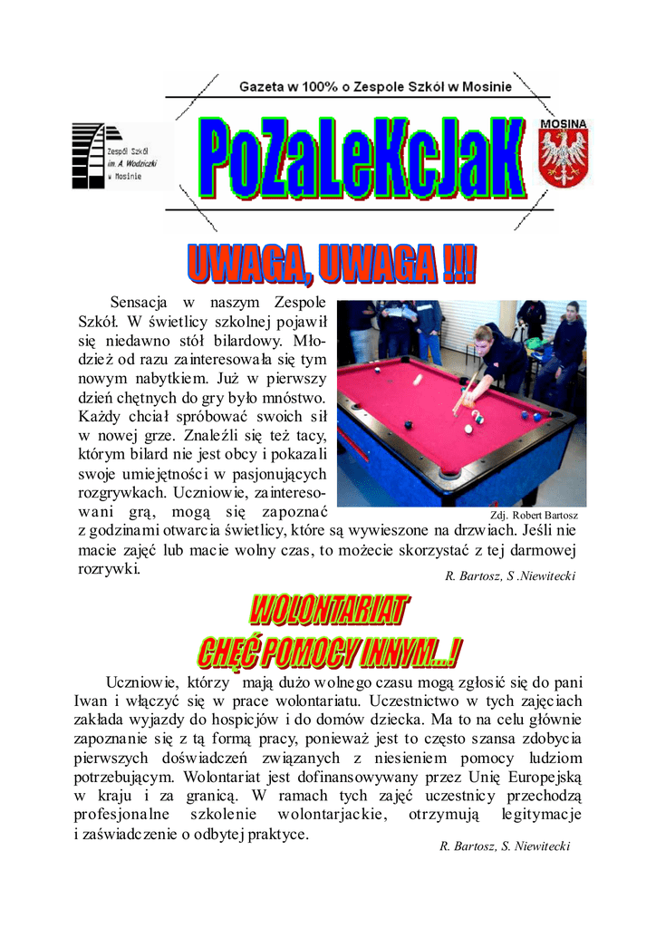Sensacja w naszym Zespole Szkół. W świetlicy szkolnej pojawił się niedawno stół bilardowy. MłodzieŜ od razu zainteresowała się tym nowym nabytkiem. JuŜ w pierwszy dzień chętnych do gry było mnóstwo. KaŜdy chciał spróbować swoich sił w nowej grze. Znaleźli się teŜ tacy, którym bilard nie jest obcy i pokazali swoje umiejętności w pasjonujących rozgrywkach. Uczniowie, zainteresowani grą, mogą się zapoznać Zdj. Robert Bartosz z godzinami otwarcia świetlicy, które są wywieszone na drzwiach. Jeśli nie macie zajęć lub macie wolny czas, to moŜecie skorzystać z tej darmowej rozrywki. R. Bartosz, S .Niewitecki Uczniowie, którzy mają duŜo wolnego czasu mogą zgłosić się do pani Iwan i włączyć się w prace wolontariatu. Uczestnictwo w tych zajęciach zakłada wyjazdy do hospicjów i do domów dziecka. Ma to na celu głównie zapoznanie się z tą formą pracy, poniewaŜ jest to często szansa zdobycia pierwszych doświadczeń związanych z niesieniem pomocy ludziom potrzebującym. Wolontariat jest dofinansowywany przez Unię Europejską w kraju i za granicą. W ramach tych zajęć uczestnicy przechodzą profesjonalne szkolenie wolontarjackie, otrzymują legitymacje i zaświadczenie o odbytej praktyce. R. Bartosz, S. Niewitecki Kółko językowo-historyczne „Kultury narodów słowiańskich” Pani Anna Iwan mówi: „ Ucząc kogoś, sama zdobywam nowe doświadczenia w pracy z ludźmi.” Uczniowie z klasy II d szkoły zawodowej mają pomysł na utworzenie grupy śpiewająco-tanecznej. Do tego zmotywował ich występ kolegi w eliminacjach do programu „ Idol” na etapie centralnym w Warszawie. Drugi rok pani Anna Iwan zachęca do udziału w olimpiadzie historycznej, olimpiadzie o Unii Europejskiej i wiedzy o Polsce i świecie. Materiały z których uczniowie przygotowują się na ten konkurs, będą równieŜ na maturze. „ Szczególny nacisk kładę na olimpiady, ale równieŜ na konkursy propagujące wiedzę o Unii Europejskiej”. Mówi pani Anna Iwan. Olimpiada na etapie okręgowym w Poznaniu poszerza poglądy i pozwala uczniom zweryfikować swoją wiedzę, porównując się z rówieśnikami z innych szkół. Jest to pozytywne doświadczenie zobaczenia czegoś innego. Daje motywację do nauki. Cele kółka językowo -histo rycznego „Kultury narodów słowiańskich” to: • zapoznanie się z kulturą i ludowością narodów słowiańskich, w tym Polski; • odnalezienie wartości i dumy z bycia Polakami i Słowianami; • uniknięcie niebezpieczeństwa rozmycia się naszej kultury w strukturach kulturalnych Unii Europejskiej. Obrona wartości płynących z tego, Ŝe jesteśmy Polakami. Co mamy do zaoferowania Ŝeby nie czuć się gorszym w kontaktach z rówieśnikami z innych krajów i umieć się dobrze zaprezentować? • walka z kompleksami i stereotypami Polski. Zdj. Sławek Niewitecki W naszej szkole prowadzone są równieŜ inne konkursy, np. okolicznościowe - „najładniejsza kartka świąteczna” czy najładniejszy „stroik”, które odbyły się w zeszłym roku. „ UwaŜam, Ŝe konkursy propagują bezinteresowną działalność społeczną, solidarność międzyludzką. Utrwalają wiarę, Ŝe są wartości i cele nie przekładalne na pieniądze. Przeciwny modelem Ŝycia konsumpcyjnego, często niekorzystnie wpływa na osobowość człowieka”. M. Deneka, D. Głuchowska 2 Rozmowa z panem Piotrem Jakóbczykiem. ZS: Kto zainicjował powstanie sportowych zajęć pozalekcyjnych? P.J.: Powstanie SKS zainicjował Pan dyrektor wraz z nauczycielami wychowania fizycznego. Tegoroczne zajęcia są kontynuacją zajęć organizowanych wcześniej przez panią Justyną Górną. ZS: Jaka jest frekwencja na zajęciach? P.J.: Do tej pory frekwencja była niska, ale z czasem wzrosła i w tej chwili w zajęciach uczestniczy około 15-20 osób. ZS: Co się uczniom podoba, a co chcieliby zmienić? P.J.: Uczniowie chcieliby, aby zajęcia były organizowane częściej i aby grali więcej w to, co lubią. ZS: Jakie dyscypliny uczniowie wybierają najchętniej/najczęściej? P.J.: Najczęściej wybierane dyscypliny przez stałych uczestników to koszykówka, siatkówka i piłka noŜna. (patrz wykres) ZS: Kto moŜe uczestniczyć w zajęciach? P.J: Uczestniczyć moŜe kaŜdy uczeń naszej szkoły, który pragnie uprawiać sport. ZS: Czy w ramach tych zajęć są organizowane wyjazdy pozalekcyjne? P.J: Jak na razie organizowane są tylko rozgrywki w reprezentowaniu szkoły. Z czasem w planie jest utworzenie ligi szkolnej, a następnie współzawodnictwo z sąsiednimi szkołami. ZS: Co daje uczestnictwo w zajęciach, czy poprawia sprawność? P.J.: KaŜdy, kto uczestnicz w zajęciach na pewno poprawia sobie kondycję. Uczniowie poprawiają swoją wydolność płuc oraz ogólną sprawność organizmu. 40% 35% 30% 25% 20% 15% 10% 31% 20% siatkówka koszykówka 40% 9% 5% 0% piłka noŜna hokej Wykres przedstawia naj częś ciej wybieran e dyscypliny sportu. Osiągnięcia uczniów w roku 2002/2003 -dziewczęta: 4 miejsce w koszykówce, 3 miejsce w siatkówce, 3 miejsce w konkursie aerobiku w Swarzędzu; -chłopcy: 4 miejsce w koszykówce, 4 miejsce w siatkówce Wszystkie wyŜej wymienione rozgrywki odbyły się na szczeblu powiatowym. R. Bartosz, S .Niewitecki 3 Czytelnia w naszej szkole jest podzielona na dwie części. Składa się ona z czytelni oraz z Multimedialnego Centrum Informacji (MCI), które istnieje od 2003 roku. To centrum składa się z czterech komputerów. MoŜe z nich korzystać kaŜdy uczeń naszej szkoły za okazaniem legitymacji szkolnej i identyfikatora. Z komputerów uczniowie mogą k or z ys ta ć wyłącznie w celach edukacyjnych. KaŜdy po wejściu do MCI musi zapoznać się z regulaminem czytelni. Dzięki komputerom moŜna pozyskiwania informacje z Internetu, takŜe doskonalić swą umiejętność posługiwania się programami takimi jak: Microsoft Word, Excel, P ublisher itp. MoŜna wyciągnąć z tego jeden wniosek, Ŝe była to do