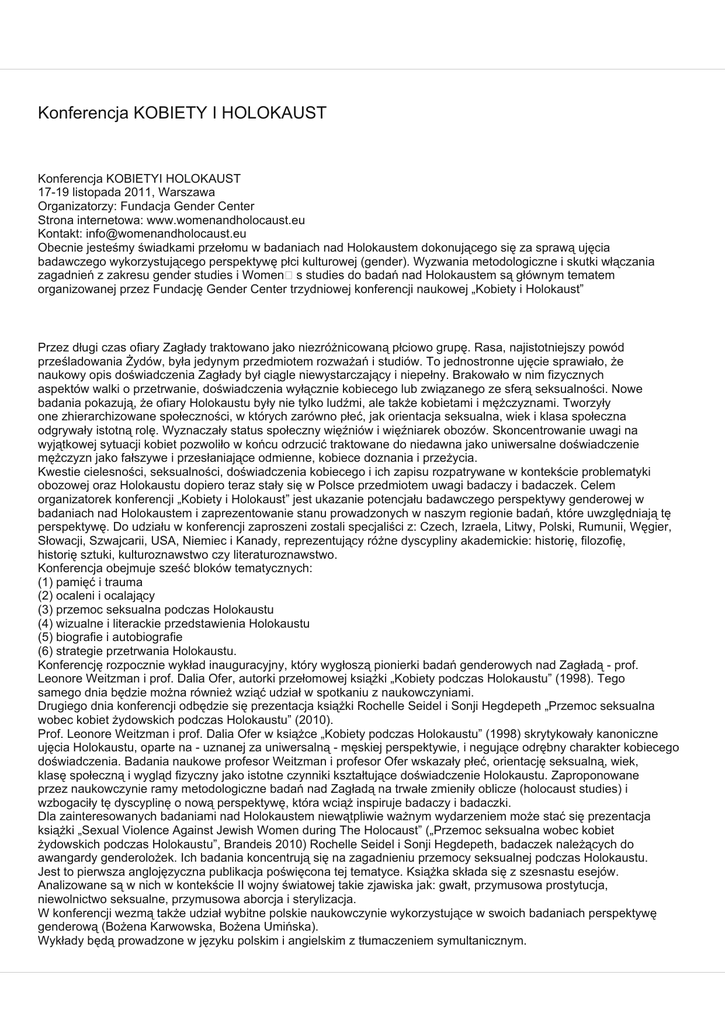 Konferencja KOBIETY I HOLOKAUST Konferencja KOBIETYI HOLOKAUST 17-19 listopada 2011, Warszawa Organizatorzy: Fundacja Gender Center Strona internetowa: www.womenandholocaust.eu Kontakt: [email protected] Obecnie jesteśmy świadkami przełomu w badaniach nad Holokaustem dokonującego się za sprawą ujęcia badawczego wykorzystującego perspektywę płci kulturowej (gender). Wyzwania metodologiczne i skutki włączania zagadnień z zakresu gender studies i Women´s studies do badań nad Holokaustem są głównym tematem organizowanej przez Fundację Gender Center trzydniowej konferencji naukowej „Kobiety i Holokaust” Przez długi czas ofiary Zagłady traktowano jako niezróżnicowaną płciowo grupę. Rasa, najistotniejszy powód prześladowania Żydów, była jedynym przedmiotem rozważań i studiów. To jednostronne ujęcie sprawiało, że naukowy opis doświadczenia Zagłady był ciągle niewystarczający i niepełny. Brakowało w nim fizycznych aspektów walki o przetrwanie, doświadczenia wyłącznie kobiecego lub związanego ze sferą seksualności. Nowe badania pokazują, że ofiary Holokaustu były nie tylko ludźmi, ale także kobietami i mężczyznami. Tworzyły one zhierarchizowane społeczności, w których zarówno płeć, jak orientacja seksualna, wiek i klasa społeczna odgrywały istotną rolę. Wyznaczały status społeczny więźniów i więźniarek obozów. Skoncentrowanie uwagi na wyjątkowej sytuacji kobiet pozwoliło w końcu odrzucić traktowane do niedawna jako uniwersalne doświadczenie mężczyzn jako fałszywe i przesłaniające odmienne, kobiece doznania i przeżycia. Kwestie cielesności, seksualności, doświadczenia kobiecego i ich zapisu rozpatrywane w kontekście problematyki obozowej oraz Holokaustu dopiero teraz stały się w Polsce przedmiotem uwagi badaczy i badaczek. Celem organizatorek konferencji „Kobiety i Holokaust” jest ukazanie potencjału badawczego perspektywy genderowej w badaniach nad Holokaustem i zaprezentowanie stanu prowadzonych w naszym regionie badań, które uwzględniają tę perspektywę. Do udziału w konferencji zaproszeni zostali specjaliści z: Czech, Izraela, Litwy, Polski, Rumunii, Węgier, Słowacji, Szwajcarii, USA, Niemiec i Kanady, reprezentujący różne dyscypliny akademickie: historię, filozofię, historię sztuki, kulturoznawstwo czy literaturoznawstwo. Konferencja obejmuje sześć bloków tematycznych: (1) pamięć i trauma (2) ocaleni i ocalający (3) przemoc seksualna podczas Holokaustu (4) wizualne i literackie przedstawienia Holokaustu (5) biografie i autobiografie (6) strategie przetrwania Holokaustu. Konferencję rozpocznie wykład inauguracyjny, który wygłoszą pionierki badań genderowych nad Zagładą - prof. Leonore Weitzman i prof. Dalia Ofer, autorki przełomowej książki „Kobiety podczas Holokaustu” (1998). Tego samego dnia będzie można również wziąć udział w spotkaniu z naukowczyniami. Drugiego dnia konferencji odbędzie się prezentacja książki Rochelle Seidel i Sonji Hegdepeth „Przemoc seksualna wobec kobiet żydowskich podczas Holokaustu” (2010). Prof. Leonore Weitzman i prof. Dalia Ofer w książce „Kobiety podczas Holokaustu” (1998) skrytykowały kanoniczne ujęcia Holokaustu, oparte na - uznanej za uniwersalną - męskiej perspektywie, i negujące odrębny charakter kobiecego doświadczenia. Badania naukowe profesor Weitzman i profesor Ofer wskazały płeć, orientację seksualną, wiek, klasę społeczną i wygląd fizyczny jako istotne czynniki kształtujące doświadczenie Holokaustu. Zaproponowane przez naukowczynie ramy metodologiczne badań nad Zagładą na trwałe zmieniły oblicze (holocaust studies) i wzbogaciły tę dyscyplinę o nową perspektywę, która wciąż inspiruje badaczy i badaczki. Dla zainteresowanych badaniami nad Holokaustem niewątpliwie ważnym wydarzeniem może stać się prezentacja książki „Sexual Violence Against Jewish Women during The Holocaust” („Przemoc seksualna wobec kobiet żydowskich podczas Holokaustu”, Brandeis 2010) Rochelle Seidel i Sonji Hegdepeth, badaczek należących do awangardy genderolożek. Ich badania koncentrują się na zagadnieniu przemocy seksualnej podczas Holokaustu. Jest to pierwsza anglojęzyczna publikacja poświęcona tej tematyce. Książka składa się z szesnastu esejów. Analizowane są w nich w kontekście II wojny światowej takie zjawiska jak: gwałt, przymusowa prostytucja, niewolnictwo seksualne, przymusowa aborcja i sterylizacja. W konferencji wezmą także udział wybitne polskie naukowczynie wykorzystujące w swoich badaniach perspektywę genderową (Bożena Karwowska, Bożena Umińska). Wykłady będą prowadzone w języku polskim i angielskim z tłumaczeniem symultanicznym. Organizatorki planują wydanie publikacji pokonferencyjnej w języku polskim i angielskim. Organizacja konferencji jest możliwa dzięki wsparciu finansowemu: Funduszu Wyszehradzkiego, American Jewish Joint Distribution Committee , Fundacji Beit Warszawa i Heinrich-Böll-Stiftung Warszawa. Patronat honorowy nad konferencją objął: Minister Kultury i Dziedzictwa Narodowego, Ministerstwo Nauki i Szkolnictwa Wyższego i Ambasada Stanów Zjednoczonych w Warszawie. Patronat medialny nad konferencją objęły: Przegląd, Zadra, Midrasz, Cwiszyn, historia.gazeta.pl, femka, Feminoteka, Radio dla Ciebie. >> program konferencji (w formacie pdf) >> plakat konferencji: w języku polskim / w języku angielskim 16 listopada (środa), o godz. 12.00, Fundacja Gender Center zaprasza serdecznie na związaną z konferencją naukowąkonferencję prasową. W konferencji prasowej udział wezmą: Rochelle Seidel i Sonja Hegdepeth – autorki książki „Przemoc seksualna wobec kobiet żydowskich podczas Holokaustu” („Sexual Violence against Jewish Women during the Holocaust”), Zuzanna Fijewska – odtwórczyni głównej roli w przedstawieniu teatralnym „Ala z elementarza”, zrealizowanym jako program towarzyszący konfere