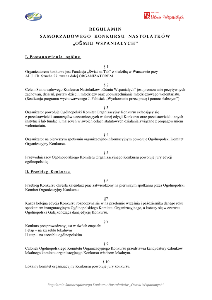 REG U L AMIN SAMOR ZADOW E G O KON K U R S U NA S T O L A T K Ó W „O Ś MIU WS P A NIA Ł Y C H” I. Po s t a n o w i e n i a ogóln e §1 Organizatorem konkursu jest Fundacja „Świat na Tak” z siedzibą w Warszawie przy Al. J. Ch. Szucha 27, zwana dalej ORGANIZATOREM. §2 Celem Samorządowego Konkursu Nastolatków „Ośmiu Wspaniałych” jest promowanie pozytywnych zachowań, działań, postaw dzieci i młodzieży oraz upowszechnianie młodzieżowego wolontariatu. (Realizacja programu wychowawczego J. Fabisiak „Wychowanie przez pracę i pomoc słabszym”) §3 Organizator powołuje Ogólnopolski Komitet Organizacyjny Konkursu składający się z przedstawicieli samorządów uczestniczących w danej edycji Konkursu oraz przedstawicieli innych instytucji lub fundacji, mających w swoich celach statutowych działania związane z propagowaniem wolontariatu. §4 Organizator na pierwszym spotkaniu organizacyjno-informacyjnym powołuje Ogólnopolski Komitet Organizacyjny Konkursu. §5 Przewodniczący Ogólnopolskiego Komitetu Organizacyjnego Konkursu powołuje jury edycji ogólnopolskiej. II. Prze bi e g Konkur s u §6 Przebieg Konkursu określa kalendarz prac zatwierdzony na pierwszym spotkaniu przez Ogólnopolski Komitet Organizacyjny Konkursu. §7 Każda kolejna edycja Konkursu rozpoczyna się w na przełomie września i października danego roku spotkaniem inauguracyjnym Ogólnopolskiego Komitetu Organizacyjnego, a kończy się w czerwcu Ogólnopolską Galą kończącą daną edycję Konkursu. §8 Konkurs przeprowadzany jest w dwóch etapach: I etap – na szczeblu lokalnym II etap – na szczeblu ogólnopolskim §9 Członek Ogólnopolskiego Komitetu Organizacyjnego Konkursu przedstawia kandydatury członków lokalnego komitetu organizacyjnego Konkursu władzom lokalnym. § 10 Lokalny komitet organizacyjny Konkursu powołuje jury konkursu. Regulamin Samorządowego Konkursu Nastolatków „Ośmiu Wspaniałych” § 11 Powołane przez lokalny komitet organizacyjny Konkursu jury nie może liczyć mniej niż 5 osób. § 12 Przewodniczący lokalnego komitetu organizacyjnego Konkursu lub osoba przez niego upoważniona potwierdza spełnienie kryteriów konkursu każdego zgłoszonego kandydata. § 13 Jury analizuje karty zgłoszeń i przeprowadza indywidualne rozmowy z uczestnikami. § 14 Jury wyłania nie więcej niż 8 laureatów na każdym etapie Konkursu w każdej kategorii. § 15 Jury może przyznać równorzędne wyróżnienia. § 16 Do eliminacji ogólnopolskich zgłaszana jest 1 osoba spośród laureatów lokalnych z kategorii indywidualnej „ÓSEMKA”. § 17 Członek Ogólnopolskiego Komitetu organizacyjnego dostarcza protokół z eliminacji do Fundacji (zał. nr 1) w terminie przewidzianym w kalendarzu prac. III. Warunki Ucz e s t n i c t w a § 18 W Konkursie może uczestniczyć dzieci i młodzież do lat 20. § 19 Dopuszczone są dwie formy zgłoszeń: indywidualne lub grupowe. § 20 W formie zgłoszeń indywidualnych uczestnicy dzielą się na dwie kategorie: • poziom szkoły podstawowej - zwany dalej „Ós e m e c z k ą ” - kandydaci mogą w nim uczestniczyć tylko na etapie lokalnym. Jury spośród kandydatów wybiera nie więcej niż 8 osób. • poziom szkoły gimnazjalnej i ponadgimnazjalnej –zwany dalej „Ós e m k ą ” – kandydaci mogą uczestniczyć w eliminacjach na szczeblu lokalnym i ogólnopolskim. Jury spośród kandydatów wybiera nie więcej niż 8 osób edycji lokalnej. Spośród laureatów edycji lokalnej jury nominuje reprezentanta do edycji ogólnopolskiej. Z tej grupy wyłaniani są laureaci Konkursu „Ośmiu Wspaniałych” Polski i Wspaniali danej jednostki samorządu uczestniczącej w edycji lokalnej. § 21 Warunki zgłoszenia grupowego: • mogą być w obu kategoriach wiekowych, • zgłoszenia rozpatrywane są tylko na szczeblu lokalnym, • zgłoszenie grupy do Konkursu może być wielokrotne pod warunkiem rozwoju prowadzonej przez nią działalności, • grupa nie może liczyć mniej niż 8 osób. Regulamin Samorządowego Konkursu Nastolatków „Ośmiu Wspaniałych” § 22 W kategorii „Ósemka” tylko jeden raz można być laureatem lokalnym i ogólnopolskim. § 23 Warunkiem zgłoszenia kandydata jest przekazanie w terminie przewidzianym w kalendarzu prac wypełnionej karty uczestnictwa wraz z załącznikami do najbliższego lokalnego organizatora Konkursu. IV. Kryt eri a i formy oc e n y kandyd a t a § 24 Kryterium pracy: • konsekwencja w realizacji podjętych prac, • zaangażowanie i wysiłek w osiągnięciu celu, • pozytywny efekt społeczny, • wzorotwórczy charakter działań, • wytrwałość w pokonywaniu trudności, • motywy działania, • minimum 1 rok pracy wolontarystycznej. Kryterium postawy: Integralnym warunkiem pozytywnej kwalifikacji kandydata jest nienaganna postawa w życiu codziennym (m.in.: wysoka kultura osobista, brak nałogów). Postawą zasługującą na wyróżnienie jest odpowiedzialność, umiejętność współpracy z innymi, empatia, dyskrecja, życzliwość, skuteczność działania. § 25 Przedstawione kryteria mają charakter pomocniczy i są jednym z elementów oceny kandydata. § 26 Formy działania zasługujące na nagrodzenie: • podejmowanie różnych działań wolontarystycznych na rzecz społeczeństwa i środowiska lokalnego, • zachęcanie rówieśników do działań prospołecznych, • podejmowanie działań przeciw przemocy i agresji w szkole, • aktywna postawa w przeciwdziałaniu uzależnieniom wśród młodzieży. V. Na gro d y § 27 Najwyższym tytułem przyznawanym przez jury w kategorii wiekowej „Ósemka” jest tytuł laureata. § 28 W kategorii „Ósemka” jury nagradza laureatów edycji lokalnej dyplomem oraz znaczkiem (wg wzoru). § 29 W kategorii „Ósemeczki” jury wyróżnia uczestników dyplomem oraz medalem (wg wzoru). Regulamin Samorządowego Konkursu Nastolatków „Ośmiu Wspaniałych” § 30 Na szczeblu ogólnopolskim laureaci otrzymują n