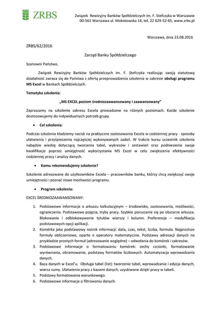 Związek Rewizyjny Banków Spółdzielczych im. F. Stefczyka w Warszawie 00-561 Warszawa ul. Mokotowska 14, tel. 22 629-52-65, www.zrbs.pl Warszawa, dnia 23.08.2016 ZRBS/62/2016 Zarząd Banku Spółdzielczego Szanowni Państwo, Związek Rewizyjny Banków Spółdzielczych im. F. Stefczyka realizując swoją statutową działalność zwraca się do Państwa z ofertą przeprowadzenia szkolenia w zakresie obsługi programu MS Excel w Bankach Spółdzielczych. Tematyka szkolenia: „MS EXCEL poziom średniozaawansowany i zaawansowany” Zapraszamy na szkolenie zakresu Excela prowadzone na różnych poziomach. Każde szkolenie dostosowujemy do indywidualnych potrzeb grupy. Cel szkolenia: Podczas szkolenia kładziemy nacisk na praktyczne zastosowania Excela w codziennej pracy - sposoby ułatwienia i przyśpieszenia najczęściej wykonywanych zadań. W trakcie kursu uczestnik szkolenia nabędzie wiedzę dotyczącą tworzenia tabel, wykresów i zestawień oraz podniesienie swoje kwalifikacje poprzez umiejętność wykorzystania MS Excel w celu zwiększenia efektywności codziennej pracy i analizy danych. Komu rekomendujemy szkolenie? Szkolenie adresowane do użytkowników Excela – pracowników banku, którzy chcą zwiększyć swoje umiejętności i poznać nowe możliwości programu. Program szkolenia: EXCEL ŚREDNIOZAAWANSOWANY: 1. Podstawowe informacje o arkuszu kalkulacyjnym – środowisko, zastosowania, możliwości, ograniczenia. Podstawowe pojęcia, tryby pracy. Szybkie poruszanie się po obszarze arkusza. Blokowanie i odblokowywanie tytułów wierszy i kolumn. Preferencje – modyfikacja podstawowych opcji aplikacji. 2. Komórka jako podstawowy nośnik informacji: data, czas, tekst, liczba, formuła. Najprostsze formuły obliczeniowe, oparte o operatory matematyczne. Podstawy adresacji danych na przykładzie prostych formuł (adresowanie względne) – odwołania do komórek i zakresów. 3. Podstawowe informacje o formatowaniu komórek: cechy czcionki, formatowanie wyrównania, obramowanie, podstawy formatów liczbowych. Automatyzacja wprowadzania danych. 4. Baza danych w Excel’u. Obsługa tabel (list): tworzenie tabel, wprowadzanie i edycja danych, wiersz sumy. Ułatwienia pracy z bazami danych, uzyskiwane dzięki pracy w tabeli. 5. Podstawy formatowania warunkowego. 6. Podstawowe informacje o filtrowaniu danych. Związek Rewizyjny Banków Spółdzielczych im. F. Stefczyka w Warszawie 00-561 Warszawa ul. Mokotowska 14, tel. 22 629-52-65, www.zrbs.pl 7. Zasady sortowania informacji. 8. Zasady wprowadzania i wykonywania operacji na datach i czasie. 9. Wykorzystanie funkcji w formułach, na przykładzie funkcji: SUMA, MAX, MIN, ŚREDNIA, ILE. LICZB. Wykorzystanie podstawowych funkcji agregujących. 10. Zasady adresacji w Excel’u. Adresy względne, bezwzględne, mieszane. 11. Wykorzystanie nazw komórek i obszarów w pracy z arkuszem oraz przy tworzeniu i edycji formuł – rodzaje adresowania. 12. Podstawy tworzenia formuł warunkowych z użyciem funkcji JEŻELI. 13. Podstawy tworzenia formuł warunkowych z użyciem funkcji ORAZ, LUB. 14. Zasady zaznaczania komórek i obszarów w Excel’u. Obsługa operacji kopiuj – wklej, zaznaczania wyłącznie widocznych komórek oraz polecenie „wklej specjalnie”. Ukrywanie i odkrywanie wierszy i kolumn. Obsługa automatycznego konspektu. 15. Najważniejsze informacje o zaokrąglaniu danych w Excel’u. Ograniczenia Excel’a: ograniczona obsługa dużych liczb, granice arkusza w różnych wersjach Excel’a (m.in. problemy komunikacyjne pomiędzy różnymi wersjami). 16. Tworzenie prostych wykresów. Wykres jako wygodne narzędzie umożliwiające efektywną analizę danych w arkuszu kalkulacyjnym. 17. Właściwe przygotowanie wydruku: podgląd wydruku, ustawienia wydruku, skalowanie strony. EXCEL ZAAWANSOWANY: 1. Praca z arkuszem. Tworzenie nowego skoroszytu według domyślnego wzorca (szablonu). Zapisywanie skoroszytu jako pliku typu: szablon, plik tekstowy, z określonym rozszerzeniem, wersją. Ustawianie podstawowych opcji/preferencji w aplikacji. 2. Komórki. Wprowadzenie liczby, daty, tekstu do komórki. Zaznaczanie komórki, bloku komórek, całego arkusza. Sortowanie bloku komórek. Automatyczne wypełnianie komórek danymi na podstawie zawartości sąsiednich komórek. 3. Zarządzanie arkuszami. Wstawianie, usuwanie wierszy i kolumn. Zmiana szerokości kolumn, wysokości wierszy o określoną wielkość lub o optymalnej szerokości i wysokości. Blokowanie, odblokowywanie tytułów wierszy i/lub kolumn. Zamiana pomiędzy arkuszami. 4. Reguły i funkcje. Stosowanie dobrych praktyk w tworzeniu reguł. Tworzenie reguł przy użyciu odwołań do komórek i operatorów arytmetycznych. Rozpoznawanie i właściwa interpretacja podstawowych błędów związanych z użyciem reguł: #name?, #div/0, #ref. Znajomość adresowania względnego i bezwzględnego (absolutnego) przy tworzeniu reguł. 5. Funkcje. Używanie funkcji sumowania, obliczania średniej, wyznaczania minimum, maksimum, zliczania, liczenia niepustych, zaokrąglania. Używanie funkcji logicznej if (jeżeli). Formatowanie komórek zawierających liczby, daty. Formatowanie komórek zawierających liczbę w celu wyświetlenia postaci procentowej. Zawijanie tekstu w komórce, bloku komórek. 6. Tworzenie wykresów różnych typów na podstawie danych zawartych w arkuszu. 7. Formatowanie arkusza. Ustawienia. Zmiana wielkości marginesów strony, orientacji strony, rozmiaru papieru. Rozmieszczenie zawartości arkusza na określonej liczbie stron. Dodawanie, edycja, usuwanie tekstu nagłówka, stopki arkusza. Wstawianie i usuwanie do nagłówka i stopki numerowania stron, daty, czasu, nazwy pliku i arkusza. Włączanie i wyłączanie wyświetlania/drukowania linii siatki, wyświetlanie/drukowanie nagłówków kolumn i wierszy. Związek Rewizyjny Banków Spółdzielczych im. F. Stefczyka w Warszawie 00-561 Warszawa ul. Mokotowska 14, tel. 22 629-52-65, www.zrbs.pl Zastosowanie automatyc