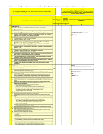 Załącznik Nr 1 do SIWZ- Szczegółowa specyfikacja techniczno-cenowa (UWAGA: po wypełnieniu przez Wykonawcę staje się formularzem cenowym oferty i Załącznikiem Nr 1 do Umowy). Uwaga: Nie można edytować kolumn o numerach I, II i III niniejszego formularza. W kolumnach IV, V należy wpisać wartości. W kolumnie VI należy wypełnić odpowiednie wiersze poprzez wpisanie w wykropkowane miejsca danych charakteryzujących oferowany sprzęt oraz odpowiednie skreślenie pozycji oznaczonych * (wykreślić niepotrzebne). Szczegółowa specyfikacja techniczno-cenowa zamówienia Lp. Opis minimalnych parametrów technicznych i funkcjonalnych I II Ilość 2 1 Polską wersję językową. Możliwość instalacji i poprawnego działania oprogramowania dostępnego w ramach posiadanych przez Zamawiającego licencji Microsoft Office 2010 oraz systemu domenowego MS Windows (Windows Server 2003). 3 Dostępność aktualizacji i poprawek do systemu u producenta systemu bezpłatnie i bez dodatkowych opłat licencyjnych z możliwością wyboru instalowanych poprawek. 4 Graficzne środowisko instalacji i konfiguracji w języku polskim. 5 Możliwość udostępniania i przejmowania pulpitu zdalnego. 6 Możliwość udostępniania plików i drukarek. 7 Możliwość blokowania lub dopuszczania dowolnych urządzeń peryferyjnych za pomocą polityk sprzętowych (np. przy użyciu numerów identyfikacyjnych sprzętu). 8 Zapewnienie wsparcia dla większości powszechnie używanych urządzeń (drukarek, urządzeń sieciowych, standardów USB, urządzeń Plug & Play, WiFi). 9 Wyposażenie systemu w zintegrowaną zaporę sieciową wraz z konsolą do zarządzania ustawieniami i regułami IP v4 i v6. 10 Zapewnienie pełnej kompatybilności z oferowanym sprzętem. 11 Zintegrowanie z systemem modułu pomocy dla użytkownika w języku polskim. 12 Zintegrowanie z systemem modułu wyszukiwania informacji. 13 Możliwość wykonania kopii bezpieczeństwa (całego dysku, wybranych folderów, kopii przyrostowych) wraz z możliwością automatycznego odzyskania wersji wcześniejszej. 14 Zabezpieczony hasłem hierarchiczny dostęp do systemu, konta i profile użytkowników zarządzane zdalnie; praca systemu w trybie ochrony kont użytkowników. 15 Zintegrowane z systemem operacyjnym narzędzia zwalczające złośliwe oprogramowanie; aktualizacja dostępna u producenta nieodpłatnie bez ograniczeń czasowych. 16 Dodatkowo system równoważny musi zapewniać obsługę podpisu elektronicznego (certyfikat kwalifikowany). Pakiet biurowy spełniający następujące wymagania poprzez wbudowane mechanizmy, Bez użycia dodatkowych aplikacji: Łączna cena ofertowa brutto Opis parametrów technicznych i funkcjonalnych sprzętu oferowanego (ilość x cena przez Wykonawcę. jednostkowa brutto) szt. zł zł III IV V VI Producent: …………………………………………………………………….. System Operacyjny Profesjonalny System operacyjny, wersja 64 bit, w polskiej wersji językowej, który zapewnia: 1 Cena jednostkowa brutto 100 Nazwa systemu operacyjnego: ………..……….., język: ……….., Typ licencji: ……….. . Producent: …………………………………………………………………….. 100 1 Licencja na oprogramowanie typu „Pakiet biurowy” musi pozwalać na dowolne przenoszenie oprogramowania niezależnie od sprzętu oraz umożliwiać instalację z wykorzystaniem jednego klucza (jeżeli występuje). 2 Licencje muszą pozwalać na swobodne przenoszenie pomiędzy stacjami roboczymi (np. w przypadku wymiany stacji roboczej). Nazwa pakietu biurowego: ………..……….., 3 Licencjonowanie musi uwzględniać prawo do (w okresie przynajmniej 5 lat) bezpłatnej instalacji udostępnianych przez producenta uaktualnień i poprawek krytycznych i opcjonalnych. język: ……….., 4 Z uwagi na szeroki zakres funkcjonalny i terytorialny wdrożenia planowanego na bazie zamawianego oprogramowania oraz konieczności minimalizacji kosztów związanych z wdrożeniem, szkoleniami i eksploatacją systemów, Zamawiający wymaga oferty zawierającej licencje pochodzące od jednego producenta, umożliwiające wykorzystanie wspólnych i jednolitych procedur masowej instalacji, uaktualniania, zarządzania i monitorowania. 5 Wymagane jest zapewnienie możliwości korzystania z wcześniejszych wersji zamawianego oprogramowania i korzystania z kopii zamiennych (możliwość kopiowanie oprogramowania na wiele urządzeń przy wykorzystaniu jednego standardowego obrazu uzyskanego z nośników dostępnych w programach licencji grupowych), z prawem do wielokrotnego użycia jednego obrazu dysku w procesie instalacji i tworzenia kopii zapasowych. 6 Wymagania zawarte w specyfikacjach technicznych poszczególnych produktów odnoszą się do natywnej funkcjonalności oferowanego oprogramowania bez użycia dodatkowego oprogramowania, chyba, że wymóg szczegółowy stanowi inaczej. Wymagania odnośnie interfejsu użytkownika: a) Pełna polska wersja językowa interfejsu użytkownika z możliwością przełączania wersji Językowej interfejsu na inne języki, w tym język angielski. 7 b) Prostota i intuicyjność obsługi, pozwalająca na pracę osobom nieposiadającym umiejętności technicznych. c) Możliwość zintegrowania uwierzytelniania użytkowników z usługą katalogową (Active Directory lub funkcjonalnie równoważną) – użytkownik raz zalogowany z poziomu systemu operacyjnego stacji roboczej ma być automatycznie rozpoznawany we wszystkich modułach oferowanego rozwiązania bez potrzeby Oddzielnego monitowania go o ponowne uwierzytelnienie się. 8 Możliwość aktywacji zainstalowanego pakietu poprzez mechanizmy wdrożonej usługi Active Directory. 9 Możliwość instalacji w postaci zwirtualizowanej aplikacji dostarczanej sieciowo na stację klienta. 10 Narzędzie wspomagające procesy migracji z poprzednich wersji pakietu i badania zgodności z dokumentami wytworzonymi w pakietach biurowych. Oprogramowa