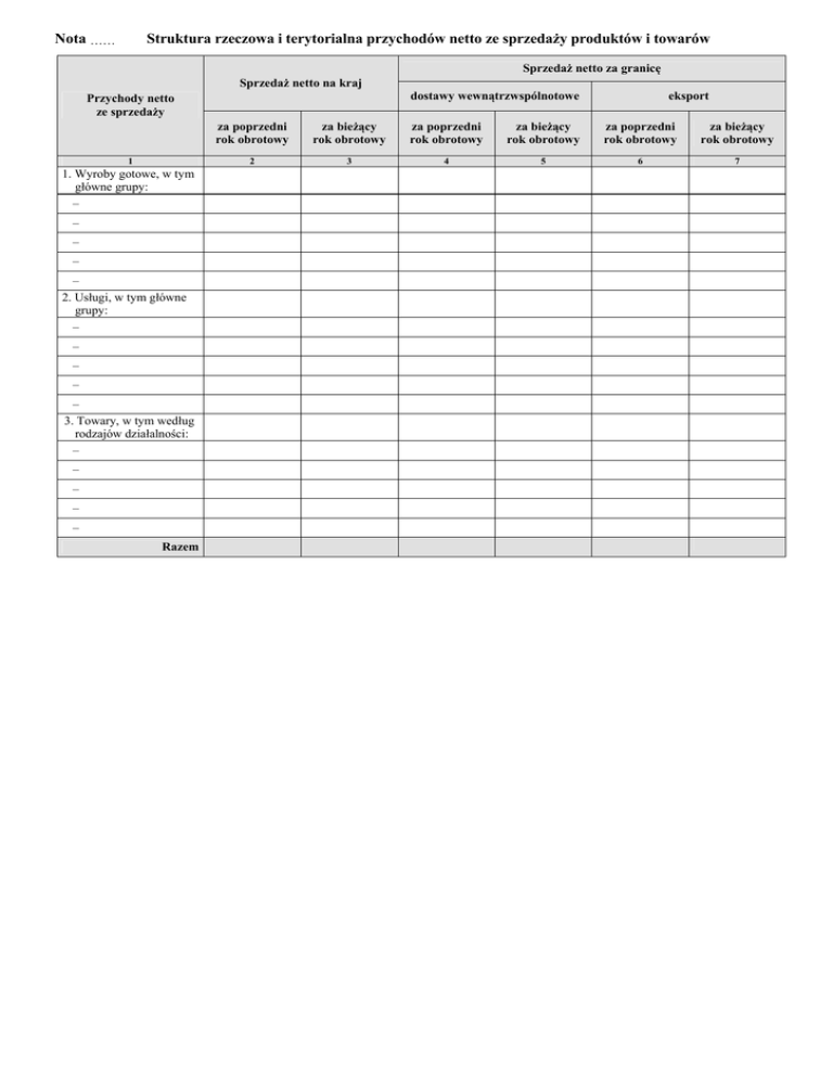 Nota …… Struktura rzeczowa i terytorialna przychodów netto ze sprzedaży produktów i towarów Sprzedaż netto za granicę Sprzedaż netto na kraj dostawy wewnątrzwspólnotowe Przychody netto ze sprzedaży 1 1. Wyroby gotowe, w tym główne grupy: – – – – – 2. Usługi, w tym główne grupy: – – – – – 3. Towary, w tym według rodzajów działalności: – – – – – Razem eksport za poprzedni rok obrotowy za bieżący rok obrotowy za poprzedni rok obrotowy za bieżący rok obrotowy za poprzedni rok obrotowy za bieżący rok obrotowy 2 3 4 5 6 7