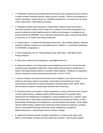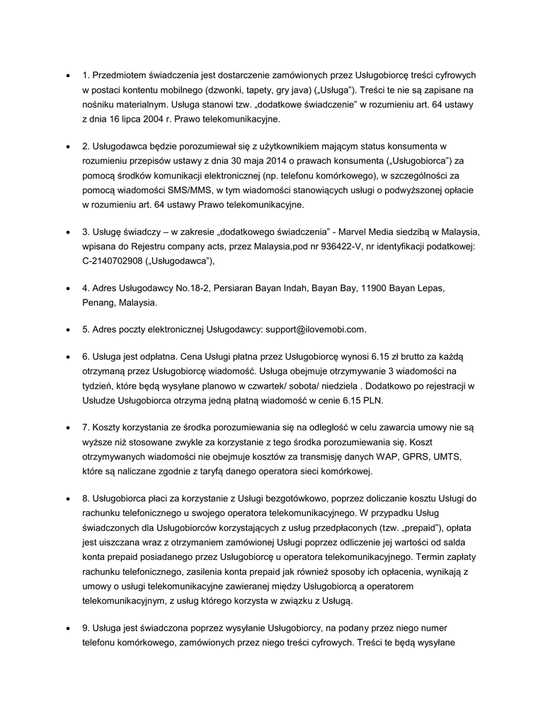 1. Przedmiotem świadczenia jest dostarczenie zamówionych przez Usługobiorcę treści cyfrowych w postaci kontentu mobilnego (dzwonki, tapety, gry java) („Usługa”). Treści te nie są zapisane na nośniku materialnym. Usługa stanowi tzw. „dodatkowe świadczenie” w rozumieniu art. 64 ustawy z dnia 16 lipca 2004 r. Prawo telekomunikacyjne. 2. Usługodawca będzie porozumiewał się z użytkownikiem mającym status konsumenta w rozumieniu przepisów ustawy z dnia 30 maja 2014 o prawach konsumenta („Usługobiorca”) za pomocą środków komunikacji elektronicznej (np. telefonu komórkowego), w szczególności za pomocą wiadomości SMS/MMS, w tym wiadomości stanowiących usługi o podwyższonej opłacie w rozumieniu art. 64 ustawy Prawo telekomunikacyjne. 3. Usługę świadczy – w zakresie „dodatkowego świadczenia” - Marvel Media siedzibą w Malaysia, wpisana do Rejestru company acts, przez Malaysia,pod nr 936422-V, nr identyfikacji podatkowej: C-2140702908 („Usługodawca”), 4. Adres Usługodawcy No.18-2, Persiaran Bayan Indah, Bayan Bay, 11900 Bayan Lepas, Penang, Malaysia. 5. Adres poczty elektronicznej Usługodawcy: [email protected]. 6. Usługa jest odpłatna. Cena Usługi płatna przez Usługobiorcę wynosi 6.15 zł brutto za każdą otrzymaną przez Usługobiorcę wiadomość. Usługa obejmuje otrzymywanie 3 wiadomości na tydzień, które będą wysyłane planowo w czwartek/ sobota/ niedziela . Dodatkowo po rejestracji w Usłudze Usługobiorca otrzyma jedną płatną wiadomość w cenie 6.15 PLN. 7. Koszty korzystania ze środka porozumiewania się na odległość w celu zawarcia umowy nie są wyższe niż stosowane zwykle za korzystanie z tego środka porozumiewania się. Koszt otrzymywanych wiadomości nie obejmuje kosztów za transmisję danych WAP, GPRS, UMTS, które są naliczane zgodnie z taryfą danego operatora sieci komórkowej. 8. Usługobiorca płaci za korzystanie z Usługi bezgotówkowo, poprzez doliczanie kosztu Usługi do rachunku telefonicznego u swojego operatora telekomunikacyjnego. W przypadku Usług świadczonych dla Usługobiorców korzystających z usług przedpłaconych (tzw. „prepaid”), opłata jest uiszczana wraz z otrzymaniem zamówionej Usługi poprzez odliczenie jej wartości od salda konta prepaid posiadanego przez Usługobiorcę u operatora telekomunikacyjnego. Termin zapłaty rachunku telefonicznego, zasilenia konta prepaid jak również sposoby ich opłacenia, wynikają z umowy o usługi telekomunikacyjne zawieranej między Usługobiorcą a operatorem telekomunikacyjnym, z usług którego korzysta w związku z Usługą. 9. Usługa jest świadczona poprzez wysyłanie Usługobiorcy, na podany przez niego numer telefonu komórkowego, zamówionych przez niego treści cyfrowych. Treści te będą wysyłane planowo 3 w tydzień. Terminy te mogą ulec zmianie z przyczyn niezależnych od Usługodawcy np. w razie zaistnienia problemów technicznych po stronie operatora telekomunikacyjnego, z usług którego korzysta Usługobiorca. Z uwagi na brak możliwości zwrotu treści cyfrowych, realizacja Usługi rozpocznie się niezwłocznie po zawarciu umowy pod warunkiem udzielenia przez Usługobiorcę zgody na rozpoczęcie spełniania świadczenia przed upływem terminu do odstąpienia od umowy. W braku takiej zgody realizacja Usługi rozpocznie się niezwłocznie po upływie terminu do odstąpienia od umowy o ile Usługobiorca w międzyczasie od niej nie odstąpił. Wyrażenie zgody, o której mowa powyżej oznacza utratę prawa do odstąpienia od umowy przez Usługobiorcę. 10. Reklamacje można kierować drogą: wiadomości poczty elektronicznej na adres [email protected], pocztową na adres CTM Mobiltek S.A, z siedzibą w Krakowie 31-060, na ulicy Gazowej 16 (list z dopiskiem „Reklamacja”) lub telefonicznie na nr telefonu 124466901. Reklamacje są rozpatrywane (a w przypadku zgłaszania ich telefonicznie również przyjmowane) w dni robocze, od poniedziałku do piątku w godz. 10.00-15.00. Termin rozpatrzenia reklamacji wynosi 5 dni roboczych od dnia jej wpływu do Usługodawcy. Termin ten może ulec zmianie jeżeli do rozpatrzenia reklamacji konieczne okaże się uzyskanie informacji od operatorów telekomunikacyjnych lub podmiotów współpracujących z Usługodawcą przy świadczeniu Usługi albo też dodatkowych informacji od Usługobiorcy. Usługodawca może domagać się od wnoszącego reklamację podania dodatkowych informacji o ile są one niezbędne do rozpatrzenia tej reklamacji. W takim przypadku czasu oczekiwania na podanie takich dodatkowych informacji nie uwzględnia się w czasie rozpatrywania reklamacji. O wyniku rozpatrzenia reklamacji Usługobiorca zostanie poinformowany pisemnie, drogą wiadomości poczty elektronicznej lub telefonicznie. Negatywne rozpatrzenie reklamacji wymaga uzasadnienia. 11. Usługobiorcy przysługuje prawo odstąpienia od umowy bez podawania jakiejkolwiek przyczyny w terminie 14 dni od dnia jej zawarcia. Odstąpienie od umowy polega na złożeniu przez Usługobiorcę na adres: CTM Mobiltek S.A, z siedzibą w Krakowie 31-060, na ulicy Gazowej 16 jednoznacznego oświadczenia o odstąpieniu od umowy. Można przy tym skorzystać z wzoru takiego oświadczenia stanowiącego załącznik nr 2 do ustawy z dnia 30 maja 2014 r. o prawach konsumenta. Skorzystanie z tego wzoru nie jest jednak obowiązkowe. Aby zachować termin do odstąpienia od umowy wystarczy wysłać oświadczenie o takim odstąpieniu przed upływem terminu do tego odstąpienia. W przypadku odstąpienia od niniejszej umowy Usługodawca zwraca Usługobiorcy wszystkie otrzymane od Usługobiorcy płatności, niezwłocznie, a w każdym przypadku nie później niż 14 dni od dnia, w którym Usługodawca został poinformowany o wykonaniu prawa odstąpienia od umowy przez Usługobiorcę. Zwrot płatności zostanie dokonany przy użyciu takich samych sposobów płatności, jakie zostały przez Usługobiorcę użyte w pierwotnej transakcji,