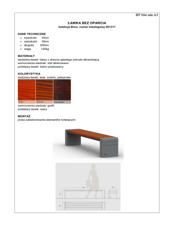 DT 1/nr urz. Ł1 ŁAWKA BEZ OPARCIA kolekcja Brno, numer katalogowy 001317 DANE TECHNICZNE • wysokość 45cm • szerokość 39cm • długość 205cm • waga 120kg MATERIAŁY siedziska ławek: listwy z drewna iglastego pokryte lakierobejcą wzmocnienia siedzisk: stal lakierowana podstawy ławek: beton piaskowany KOLORYSTYKA siedziska ławek: teak, orzech, palisander wzmocnienia siedzisk: grafit podstawy ławek: szary MONTAŻ przez zabetonowanie elementów kotwiących DT 2/nr urz. K KOSZ NA ŚMIECI Z DASZKIEM kolekcja Brno, numer katalogowy 003330 DANE TECHNICZNE • wysokość 80cm • szerokość 39cm • długość 43cm • pojemność 40l • waga 120kg MATERIAŁY obudowy koszy na śmieci: beton piaskowany daszki koszy na śmieci: stal lakierowana pojemniki z popielniczkami: stal ocynkowana KOLORYSTYKA obudowy koszy na śmieci: szary daszki koszy na śmieci: grafit, czerń MONTAŻ wolnostojące z możliwością zakotwienia DT 3 NAWIERZCHNIA SPORTOWA Z TRAWY SYNTETYCZNEJ wys. min.60mm I. CHARAKTERYSTYKA NAWIERZCHNI 1. Przeznaczenie, zakres i warunki stosowania Trawa syntetyczna jest trzecią generacją sztucznych traw zasypywanych piaskiem i granulatem EPDM, co pozwala na osiąganie wysokiego poziomu amortyzacji wstrząsów. System ten jest stosowany bez dodatkowych mat elastycznych. Wykładzina typu trawa syntetyczna przeznaczona jest do wykonywania nawierzchni sportowych na otwartej przestrzeni obiektów sportowych. Wykładzinę ułożoną i zamocowaną zgodnie z instrukcją producenta należy zasypać suszonym i sortowanym piaskiem kwarcowym oraz granulatem gumowym wg, poniższego zestawienia: • frakcja piasku 0,4-1,4mm, ilość do zasypania: 16-18kg / m2 • wypełnienie: piasek kwarcowy i granulat EPDM (szary z recyklingu) w ilości wg wytycznych producenta trawy 2. Parametry trawy syntetycznej Jako nawierzchnię sportową przyjmuje się trawę syntetyczną o następujących parametrach: • • • • • • • • • • • • • nawierzchnia musi zostać wykonana w technologii gumowo – piaskowej ; typ włókna: 100 % monofil prosty z włóknem o przekroju litery „S” z wtopionym rdzeniem wzmacniającym skład chemiczny włókna: 100 % Polietylen podkład trawy: poliuretanowy ciężar włókna: min. 17.000 Dtex. grubość włókna min. 350 micron przepuszczalność wody min. 360 l/h wysokość włókna: min. 60 mm, ilość pęczków: min. 9400 m2 (min. 16 włókien w pęczku) ilość włókien: min. 150 000/ m2 ciężar całkowity nawierzchni: min. 3.000 gr. / m2 kolor nawierzchni: zielony (dwukolorowy) wypełnienie: piasek kwarcowy i granulat EPDM z recyklingu (kolor szary) w ilości wg wytycznych producenta trawy 3. Właściwości techniczno – użytkowe Wykładzina wykonana jest z włókien monofilowych i warstwy podkładowej poliuretanowej. Włókna mają przekrój w kształcie litery „S” i są dodatkowo zbrojone poprzez wtopiony w każde włókno rdzeń stabilizujący. Pojedyncze włókna grupowane są w pęczki i tworzą barwną (w dwóch odcieniach zieleni) warstwę wierzchnią, imitującą trawę naturalną. Poszczególne pęczki mogą dodatkowo posiadać specjalny oplot stabilizujący włókna podczas procesu zasypywania. Warstwę podkładową stanowi część włókien, wpleciona na siatkę (tkaninę) z tworzywa sztucznego i razem z siatką zatopioną w poliuretanowej warstwie podkładowej. Warstwa ta ma czarną barwę i gładką fakturę; jej grubość to 2 mm. 4. Wykaz oświadczeń lub dokumentów potwierdzających spełnianie warunków jakościowych, dotyczące nawierzchni „trawa syntetyczna” i wypełnienie, które należy dołączyć do oferty: Certyfikat FIFA 2 Stars na oferowany system nawierzchni (trawa + wypełnienie szary EPDM z recyklingu) Raport z badań przeprowadzonych przez specjalistyczne laboratorium (np. Labosport lub ISA-Sport lub Sports Labs Ltd), dotyczący oferowanego systemu nawierzchni (trawa + wypełnienie szary EPDM z recyklingu), potwierdzający zgodność jej parametrów z wymogami FIFA 2 Stars Quality Concept for Football Turf (dostępny na www.FIFA.com) Deklaracja zgodności z normą PN-EN 15330-1:2008, lub aprobata techniczna ITB, lub rekomendacja techniczna ITB, lub wyniki badań specjalistycznego laboratorium (np. Labosport lub ISA-Sport lub Sports Labs Ltd) potwierdzające parametry oferowanej nawierzchni lub dokument równoważny. karta techniczna oferowanej nawierzchni oraz wypełnienia potwierdzona przez producenta ; Atest PZH ( lub dokument równoważny ) dla oferowanej nawierzchni i wypełnienia Autoryzacja producenta trawy syntetycznej, wystawiona dla Wykonawcy na realizowaną inwestycję wraz z potwierdzeniem gwarancji udzielonej przez jej producenta próbka oferowanej nawierzchni 50x50cm trawy syntetycznej z oryginalną metryką producenta. próbka oferowanego wypełnienia do trawy 100g. UWAGA: Celem weryfikacji właściwości i parametrów technicznych proponowanych przez Oferentów nawierzchni zaleca się żądanie przez Zamawiającego składania wraz z ofertą dokumentów wyżej opisanych, (podstawą prawną żądania powyższych dokumentów jest Rozporządzenie Rady Ministrów z dnia 19 maja 2006 w sprawie rodzajów dokumentów, jakich może żądać zamawiający od wykonawcy, oraz form, w jakich te dokumenty mogą być składane). Specyfikacja materiałowa – STANDARDOWE GEOSIATKI GEOMAXX® MATERIAŁ WŁAŚCIWOŚCI TAŚMY WŁAŚCIWOŚCI KOMÓREK I POŁĄCZEŃ ZGRZEWANYCH WŁAŚCIWOŚCI SEKCJI Właściwości Skład materiałowy Kolor Wartość Metoda badawcza Polimer – polietylen o gestości 0,935-0,965 g/cm3 PN-EN ISO 1183 Czarny BeŜowy, zielony, inne kolory barwniki nie zawierają --metali cięŜkich Sadza - min.1,5% -wagowo HALS1- 1,0 % masy nośnika --Stabilizator 1,5 mm +/- 0,15 mm N/A Grubość Teksturowanie: Tekstura całej powierzchni taśmy składa się z wielu romboidalnych wgłębień o głębokośsci do 0,6mm ; gestość na powierzchni 22-32/ cm2 . Perforacja: Taśmy polietylenowe p