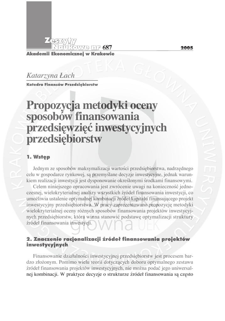 Zeszyty Naukowe nr 687 2005 Akademii Ekonomicznej w Krakowie Katarzyna ¸ach Katedra Finansów Przedsi´biorstw Propozycja metodyki oceny sposobów finansowania przedsi´wzi´ç inwestycyjnych przedsi´biorstw 1. Wst´p Jednym ze sposobów maksymalizacji wartości przedsiębiorstwa, nadrzędnego celu w gospodarce rynkowej, są przemyślane decyzje inwestycyjne, jednak warunkiem realizacji inwestycji jest dysponowanie określonymi środkami finansowymi. Celem niniejszego opracowania jest zwrócenie uwagi na konieczność jednoczesnej, wielokryterialnej analizy wszystkich źródeł finansowania inwestycji, co umożliwia ustalenie optymalnej kombinacji źródeł kapitału finansującego projekt inwestycyjny przedsiębiorstwa. W pracy zaprezentowano propozycję metodyki wielokryterialnej oceny różnych sposobów finansowania projektów inwestycyjnych przedsiębiorstw, która winna stanowić podstawę optymalizacji struktury źródeł finansowania inwestycji. 2. Znaczenie racjonalizacji êródeł finansowania projektów inwestycyjnych Finansowanie działalności inwestycyjnej przedsiębiorstw jest procesem bardzo złożonym. Pomimo wielu teorii dotyczących doboru optymalnego zestawu źródeł finansowania projektów inwestycyjnych, nie można podać jego uniwersalnej kombinacji. W praktyce decyzje o strukturze źródeł finansowania są często 104 Katarzyna Łach podejmowane subiektywnie przez zarządzających1. Jest to jednak bardzo ważny problem, bo dobór właściwych źródeł finansowania przedsięwzięć pozytywnie wpływa m.in. na: – możliwości inwestycyjne przedsiębiorstwa, – prawidłowy, zrównoważony rozwój firmy, – poprawę sytuacji finansowej przedsiębiorstwa, – konkurencyjność na rynku. W ocenie źródeł finansowania inwestycji można przyjmować różne kryteria i nadawać im różną wagę. W niniejszym opracowaniu przedstawiono możliwość zastosowania wielokryterialnej oceny wybranych źródeł finansowania projektów inwestycyjnych przedsiębiorstw, wykorzystującej punktową metodę oceny przydatności różnych źródeł finansowania inwestycji. 3. Kryteria oceny sposobów finansowania inwestycji Uwzględniając sformułowane wyżej postulaty wybrano dziewięć kryteriów, według których w niniejszym opracowaniu są oceniane podstawowe źródła pozyskiwania kapitału na działalność inwestycyjną. Przyjęto więc następujące kryteria: – koszt kapitału, – dostępność kapitału, – zakres kontroli kapitałodawcy, – czas pozyskania kapitału, – procedura pozyskania kapitału, – wielkość pozyskiwanego kapitału, – czas spłaty kapitału, – występowanie i wysokość bieżących kosztów, – niezbędne zabezpieczenia. Poniżej podjęto próbę zdefiniowania tych kryteriów, wyjaśnienia ich istoty, szczególnych aspektów, na które zwrócono uwagę, oraz znaczenia poszczególnych kryteriów. Koszt kapitału. Posługiwanie się przez podmiot gospodarczy kapitałem, niezależnie od źródła jego pochodzenia, wiąże się z pewnym kosztem. Koszt kapitału obcego uzależniony jest od wysokości wymaganych odsetek, ich rozłożenia w czasie, stopy podatku dochodowego oraz okresu wykorzystania kapitału. Natomiast 1 S. Antkiewicz, Akcje i obligacje w finansowaniu przedsiębiorstwa, Biblioteka Menedżera i Bankowca, Warszawa 2002, s. 129. Propozycja metodyki oceny… 105 koszt kapitału własnego określa oczekiwana stopa zwrotu zrównująca przyszłe dochody z tytułu dywidendy z bieżącą ceną akcji na rynku kapitałowym2. Dla potrzeb oceny zawartej w niniejszej pracy, w kryterium kosztu kapitału ujęto także wszystkie dodatkowe koszty związane z pozyskaniem kapitału: przy emisji akcji i obligacji są to koszty emisji, w przypadku kredytu – prowizje dla banku, a przy leasingu – opłaty manipulacyjne. W analizie przeprowadzonej w dalszej części opracowania przy ocenie kosztu kapitału pochodzącego z różnych źródeł starano się wziąć pod uwagę wszystkie wymienione wyżej rodzaje kosztów. Dostępność kapitału. Swoboda wyboru źródeł pozyskiwania kapitału może być ograniczona barierami wynikającymi z sytuacji rynkowej (niezależnymi od przedsiębiorstwa) lub niespełnieniem przez podmiot wymagań stawianych przez rynek (zależnymi od przedsiębiorstwa)3. Tak więc nie każdy podmiot może korzystać z każdego źródła kapitału. Na możliwość korzystania z poszczególnych źródeł finansowania rozwoju wpływ mają: – forma organizacyjno-prawna, – wielkość przedsiębiorstwa, – sytuacja finansowa, – profil działalności. Zakres kontroli kapitałodawcy. W analizie źródeł finansowania inwestycji należy zwrócić uwagę na różny zakres kontroli kapitałodawcy. W wypadku kapitału obcego kapitałodawcy niejednokrotnie kontrolują postępy w realizacji i wdrażaniu inwestycji. Natomiast w wypadku kapitału własnego powiększenie liczby udziałowców pociąga za sobą mniejszą niezależność w podejmowaniu strategicznych decyzji dotychczasowych wspólników. Czas pozyskania kapitału. Czas ma ogromne, niekiedy kluczowe znaczenie dla przedsiębiorstwa pragnącego zrealizować daną inwestycję. Ewentualne opóźnienia niejednokrotnie drastycznie zmniejszają rentowność inwestycji lub sprawiają, że staje się ona zupełnie nieopłacalna. Dlatego też czas potrzebny na zgromadzenie niezbędnych do sfinansowania inwestycji środków powinien być jak najkrótszy. Procedura pozyskania kapitału. Z procedurą pozyskiwania kapitału związana jest także kategoria czasu oraz kosztu. Poszczególne formy kapitału potrzebnego do finansowania inwestycji wymagają bardziej lub mniej skomplikowanych czynności, załatwienia mniejszej lub większej liczby formalności. Wszystkie te czynności zawsze pociągają za sobą pewne koszty oraz zajmują firmie sporo „cennego” 2 G. Łukasik, Polityka pozyskiwania kapitału przez przedsiębiorstwa w warunkach rozwoju rynku finansowego, AE w Katowicach,