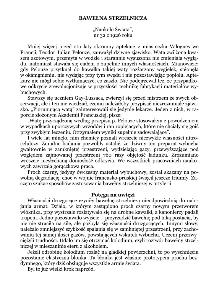 BAWEŁNA STRZELNICZA „Naokoło Świata”, nr 32 z 1926 roku Mniej więcej przed stu laty skromny aptekarz z miasteczka Valognes we Francji, Teodor Julian Pelouze, zauważył dziwne zjawisko. Wata zwilżona kwasem azotowym, przemyta w wodzie i starannie wysuszona nie zmieniała wyglądu, natomiast stawała się ciałem o zupełnie innych własnościach. Mianowicie: gdy Pelouze przytknął do kawałka takiej waty rozżarzony węgielek, spłonęła w okamgnieniu, nie wydając przy tym swędu i nie pozostawiając popiołu. Aptekarz nie mógł sobie wytłumaczyć, co zaszło. Nie podejrzewał też, że przypadkowe odkrycie zrewolucjonizuje w przyszłości technikę fabrykacji materiałów wybuchowych. Stawszy się uczniem Gay-Lussaca, zwierzył się przed mistrzem ze swych obserwacji, ale i ten nie wiedział, czemu należałoby przypisać niezrozumiałe zjawisko. „Piorunującą watą” zainteresowali się jedynie lekarze. Jeden z nich, w raporcie złożonym Akademii Francuskiej, pisze: „Watę przyrządzoną według przepisu p. Pelouze stosowałem z powodzeniem w wypadkach uporczywych wrzodów i ran ropiejących, które nie chciały się goić przy zwykłym leczeniu. Otrzymałem wyniki zupełnie zadowalające”. I wiele lat minęło, nim chemicy poznali wreszcie niezwykłe własności nitrocelulozy. Żmudne badania pozwoliły ustalić, że dziwny ten preparat wybucha gwałtownie w zamkniętej przestrzeni, wydzielając gazy, przewyższające pod względem zajmowanej przestrzeni 760 razy objętość ładunku. Zrozumiano wreszcie niesłychaną doniosłość odkrycia. We wszystkich pracowniach naukowych zawrzała gorączkowa praca. Proch czarny, jedyny ówczesny materiał wybuchowy, został skazany na powolną degradację, choć w wojnie francusko-pruskiej święcił jeszcze triumfy. Zaczęto szukać sposobów zastosowania bawełny strzelniczej w artylerii. Potęga na uwięzi Własności druzgocące czyniły bawełnę strzelniczą nieodpowiednią do nabijania armat. Działo, w którym zastąpiono proch czarny nowym przetworem włóknika, przy wystrzale rozlatywało się na drobne kawałki, a kanonierzy padali trupem. Jedno pozostawało wyjście – przyrządzić bawełnę pod taką postacią, by nic nie straciła na sile, ale pozbyła się własności druzgocących. Innymi słowy, należało zmniejszyć szybkość spalania się w zamkniętej przestrzeni, przy zachowaniu tej samej ilości gazów, powstających wskutek wybuchu. Uczeni przezwyciężyli trudności. Udało im się otrzymać kolodium, czyli roztwór bawełny strzelniczej w mieszaninie eteru z alkoholem. Jeżeli odrobinę kolodium rozlać na gładkiej powierzchni, to po wyschnięciu pozostanie elastyczna błonka. Ta błonka jest właśnie prototypem prochu bezdymnego, który dziś obsługuje wszystkie armie świata. Był to już wielki krok naprzód. Otrzymany w ten sposób produkt nie różnił się chemicznie od bawełny strzelniczej, gdyż jak i ona był czystą nitrocelulozą i wydzielał taką samą ilość gazów przy wystrzale, spalał się przy tym znacznie powolniej, nie grożąc rozerwaniem działa. W Anglii, Francji i Niemczech przystąpiono do masowej produkcji prochu bezdymnego, ale smutne wypadki rychło ostudziły przedwczesny zapał. Ukryte niebezpieczeństwo Pracując z ferworem, zapomniano o bardzo ważnym pytaniu: czy nowy proch ulega powolnemu rozkładowi i jak długo można go magazynować? Szereg strasznych wybuchów był odpowiedzią na to pytanie. Prochownie wylatywały w powietrze bez widocznej przyczyny, pociągając za sobą setki ofiar. Komisje, które zjeżdżały na miejsca wypadków, nie mogły ustalić powodów katastrofy, gdyż magazyny były zwykle zrównane z ziemią, a świadkowie nieszczęścia ginęli. Winę zwalano zwykle na nieostrożność personelu albo na iskrę powstałą wskutek tarcia, uderzenie pioruna itp. Wreszcie zwrócono baczniejszą uwagę na powolny rozkład bawełny strzelniczej. Prace Fryderyka Abla dowiodły niezbicie, że właściwa przyczyna leży w złym utrwaleniu bawełny. Okazało się, iż nitroceluloza, zawierająca choćby ślady kwasu azotowego, ulega powolnemu rozkładowi, „zagrzewa się”, staje się bardzo wrażliwa i ostatecznie może najniespodziewaniej wybuchnąć, nawet gdy już została przerobiona na proch bezdymny. Technika materiałów wybuchowych weszła na nowe tory. Zrozumiano konieczność utrwalania nitrocelulozy, czyli stosowania tak zwanej „stabilizacji”. Pierwotna fabrykacja Początkowo wszystko wydawało się dość proste, więc i sposoby otrzymywania bawełny strzelniczej nie były skomplikowane. Do wielkich naczyń żelaznych, zwanych garnkami Chardonneta, wlewano ciepłą mieszaninę kwasu azotowego z siarkowym (ten ostatni odgrywa rolę pomocniczą) i zanurzano czterokilogramową porcję waty oczyszczonej. Kąpiel trwała godzinę, po czym kwas spuszczano przez otwór w spodzie naczynia, a bawełnę wyjmowano widłami, wyżymano i wrzucano do naczyń z bieżącą wodą. Powstawał produkt bez zarzutu, szwankowała tylko jego trwałość Ale metoda Chardonneta i podobna do niej metoda Abla miały wiele stron ujemnych. Przede wszystkim był to zbyt kosztowny sposób fabrykacji, zużywał zbyt wiele kwasu, wymagał licznej obsługi, a wydajność nie była dostateczna. Prócz tego w sali panowała atmosfera zabójcza. Opary, wydzielające się z nieprzykrytych garnków, zatruwały w szybkim tempie płuca, doprowadzając najtęższe jednostki do suchot. Skierowano wszystkie siły ku usunięciu tych niedogodności. Epoka turbin Wspaniałą innowacją okazało się wprowadzenie turbin nitracyjnych, w których kwas krąży, przesączając się poprzez warstwę waty. Turbiny, używane do wyrobu bawełny strzelniczej, są to naczynia żelazne, wewnątrz których znajduje się kosz aluminiowy obracający się dokoła osi. Nitrację zaczyna się od napełnienia turbiny ogrzaną mieszaniną kwasową. Następnie ładuje się od 12 do 15 kg waty