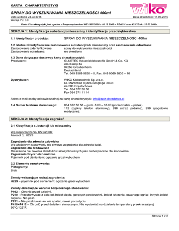 KARTA CHARAKTERYSTYKI SPRAY DO WYSZUKIWANIA NIESZCZELNOŚCI 400ml Data wydania 23.03.2015 Wersja PL: 3.0 Data aktualizacji: 14.05.2015 Karta Charakterystyki jest zgodna z Rozporządzeniem WE 1907/2006 z 18.12.2006 – REACH oraz 453/2010 z 20.05.2010r. SEKCJA 1: Identyfikacja substancji/mieszaniny i identyfikacja przedsiębiorstwa 1.1 Identyfikator produktu: SPRAY DO WYSZUKIWANIA NIESZCZELNOŚCI 400ml 1.2 Istotne zidentyfikowane zastosowania substancji lub mieszaniny oraz zastosowania odradzane: Zastosowanie zidentyfikowane: spray do wykrywania nieszczelności Zastosowanie odradzane: nie określono 1.3 Dane dotyczące dostawcy karty charakterystyki: Producent: GLUETEC Industrieklebestoffe GmbH & Co. KG Am Biotop 8a 97259 Greußenheim Deutschland Tel. 049 9369 9836 – 0, Fax. 049 9369 9836 – 10 Dystrybutor: WIKO Klebetechnik Sp. z o.o. Ul. Marszałka Rydza-Śmigłego 36/38 42-200 Częstochowa Tel. 034 372 58 58 Fax 034 371 11 14 Adres e-mail osoby odpowiedzialnej za kartę charakterystyki: [email protected] 1.4 Numer telefonu alarmowego: 034 372 58 58 – godz. 8.00 – 16.00 (poniedziałek – piątek) 112 (ogólny telefon alarmowy), 998 (straż pożarna), 999 (pogotowie medyczne); SEKCJA 2: Identyfikacja zagrożeń 2.1 Klasyfikacja substancji lub mieszaniny Wg rozporządzenia 1272/2008: Aerosol 3; H229 Zagrożenie dla zdrowia człowieka We właściwym stosowaniu nie stwarza zagrożenia dla zdrowia ludzi. Zagrożenie dla środowiska Mieszanina nie zawiera składników sklasyfikowanych jako niebezpieczne dla środowiska. Zagrożenia fizyczne/chemiczne Pojemnik pod ciśnieniem: ogrzanie grozi wybuchem 2.2 Elementy oznakowania: Piktogramy: Brak Zwroty wskazujące rodzaj zagrożenia: H229 – pojemnik pod ciśnieniem: ogrzanie grozi wybuchem Zwroty określające warunki bezpiecznego stosowania: P102 – Chronić przed dziećmi. P210 - Przechowywać z dala od źródeł ciepła, gorących powierzchni, źródeł iskrzenia, otwartego ognia i innych źródeł zapłonu. Nie palić. P251 – Nie przekłuwać ani nie spalać, nawet po zużyciu. P410+P412 – Chronić przed światłem słonecznym. Nie wystawiać na działanie temperatury przekraczającej 50°C/122°F. Strona 1 z 8 KARTA CHARAKTERYSTYKI SPRAY DO WYSZUKIWANIA NIESZCZELNOŚCI 400ml Data wydania 23.03.2015 Wersja PL: 3.0 Data aktualizacji: 14.05.2015 Karta Charakterystyki jest zgodna z Rozporządzeniem WE 1907/2006 z 18.12.2006 – REACH oraz 453/2010 z 20.05.2010r. 2.3 Inne zagrożenia: Brak dodatkowych zagrożeń Brak informacji na temat spełnienia kryteriów PBT lub vPvB zgodnie z załącznikiem XIII rozporządzenia REACH. Odpowiednie badania nie były przeprowadzone. SEKCJA 3: Skład/informacja o składnikach 3.1 Substancja: Nie dotyczy. 3.2 Mieszanina: Niebezpieczne składniki: Identyfikator produktu Dwutlenek węgla CAS: 124-38-9 WE: 204-696-9 Nr indeksowy: Nr REACH: substancja podlega przepisom okresu przejściowego Zawartość % <2,5 Klasyfikacja CLP Kody zwrotów Klasa zagrożenia i wskazujących kody kategorii rodzaj zagrożenia Press. Gas H280 Pełna treść zwrotów H w sekcji 16 SEKCJA 4: Środki pierwszej pomocy 4.1 Opis środków pierwszej pomocy W przypadku kontaktu ze skórą: Umyć zabrudzoną skórę wodą z mydłem, spłukać dokładnie wodą, w przypadku pojawienia się podrażnienia, rumieni skontaktować się z lekarzem. W przypadku kontaktu z oczami: Przepłukać oczy przez kilkanaście minut (ok. 15) dużą ilością wody, trzymając powieki szeroko rozwarte. Unikać silnego strumienia, ze względu na niebezpieczeństwo uszkodzenia rogówki, skontaktować się z lekarzem. Narażenie inhalacyjne: W razie zawrotów głowy lub nudności wyprowadzić poszkodowanego na świeże powietrze, w razie braku szybkiej poprawy zasięgnąć porady lekarza. W przypadku połknięcia: Spożycie nie jest uważane za potencjalną drogę narażenia. Uwagi dla lekarzy Stosować leczenie objawowe. 4.2 Najważniejsze ostre i opóźnione objawy oraz skutki narażenia: Kontakt ze skórą: brak informacji na temat ostrych i opóźnionych objawów narażenia Kontakt z oczami: może powodować podrażnienia w przypadku bezpośredniego narażenia. Układ oddechowy: brak informacji na temat ostrych i opóźnionych objawów narażenia Przewód pokarmowy: brak informacji na temat ostrych i opóźnionych objawów narażenia 4.3 Wskazania dotyczące wszelkiej natychmiastowej pomocy lekarskiej i szczególnego postępowania z poszkodowanym: Decyzję o sposobie postępowania podejmuje lekarz po ocenie stanu poszkodowanego. Strona 2 z 8 KARTA CHARAKTERYSTYKI SPRAY DO WYSZUKIWANIA NIESZCZELNOŚCI 400ml Data wydania 23.03.2015 Wersja PL: 3.0 Data aktualizacji: 14.05.2015 Karta Charakterystyki jest zgodna z Rozporządzeniem WE 1907/2006 z 18.12.2006 – REACH oraz 453/2010 z 20.05.2010r. SEKCJA 5: Postępowanie w przypadku pożaru 5.1 Środki gaśnicze: Odpowiednie środki gaśnicze: piana alkoholoodporna lub suche proszki gaśnicze (A, B, C), dwutlenek węgla (gaśnica śniegowa), piasek lub ziemia, mgła wodna. Stosować metody gaśnicze odpowiednie do warunków otoczenia. Niewłaściwe środki gaśnicze: Silny strumień wody. 5.2 Szczególne zagrożenia związane z substancją lub mieszaniną W trakcie pożaru, pod wpływem działania wysokich temperatur uwalniają się toksyczne produkty pirolizy – tlenki węgla. 5.3 Informacje dla straży pożarnej: Pojemniki znajdujące się w strefie pożaru chłodzić rozproszonym strumieniem wody, o ile jest to możliwe usunąć ze strefy zagrożenia. W przypadku pożaru w zamkniętym pomieszczeniu należy stosować odzież ochronną i aparat oddechowy na sprężone powietrze . Nie dopuszczać do przedostania się wody gaśniczej do wód powierzchniowych, gruntowych i kanalizacji. SEKCJA 6: Postępowanie w przypadku niezamierzonego uwolnienia do środowiska 6.1 Indywidualne środki ostrożności, wyposażenie ochronne i procedury w sytuacjach awaryjnych Dla osób nienależących do personelu udzielająceg