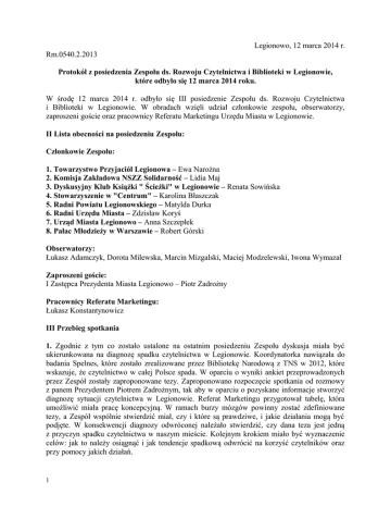 Legionowo, 12 marca 2014 r. Rm.0540.2.2013 Protokół z posiedzenia Zespołu ds. Rozwoju Czytelnictwa i Biblioteki w Legionowie, które odbyło się 12 marca 2014 roku. W środę 12 marca 2014 r. odbyło się III posiedzenie Zespołu ds. Rozwoju Czytelnictwa i Biblioteki w Legionowie. W obradach wzięli udział członkowie zespołu, obserwatorzy, zaproszeni goście oraz pracownicy Referatu Marketingu Urzędu Miasta w Legionowie. II Lista obecności na posiedzeniu Zespołu: Członkowie Zespołu: 1. Towarzystwo Przyjaciół Legionowa – Ewa Narożna 2. Komisja Zakładowa NSZZ Solidarność – Lidia Maj 3. Dyskusyjny Klub Książki " Ścieżki" w Legionowie – Renata Sowińska 4. Stowarzyszenie w "Centrum" – Karolina Błaszczak 5. Radni Powiatu Legionowskiego – Matylda Durka 6. Radni Urzędu Miasta – Zdzisław Koryś 7. Urząd Miasta Legionowo – Anna Szczepłek 8. Pałac Młodzieży w Warszawie – Robert Górski Obserwatorzy: Łukasz Adamczyk, Dorota Milewska, Marcin Mizgalski, Maciej Modzelewski, Iwona Wymazał Zaproszeni goście: I Zastępca Prezydenta Miasta Legionowo – Piotr Zadrożny Pracownicy Referatu Marketingu: Łukasz Konstantynowicz III Przebieg spotkania 1. Zgodnie z tym co zostało ustalone na ostatnim posiedzeniu Zespołu dyskusja miała być ukierunkowana na diagnozę spadku czytelnictwa w Legionowie. Koordynatorka nawiązała do badania Spelnes, które zostało zrealizowane przez Bibliotekę Narodową z TNS w 2012, które wskazuje, że czytelnictwo w całej Polsce spada. W oparciu o wyniki ankiet przeprowadzonych przez Zespół zostały zaproponowane tezy. Zaproponowano rozpoczęcie spotkania od rozmowy z panem Prezydentem Piotrem Zadrożnym, tak aby w oparciu o pozyskane informacje stworzyć diagnozę sytuacji czytelnictwa w Legionowie. Referat Marketingu przygotował tabelę, która umożliwić miała pracę koncepcyjną. W ramach burzy mózgów powinny zostać zdefiniowane tezy, a Zespół wspólnie stwierdzić miał, czy i które są prawdziwe, i jakie działania mogą być podjęte. W konsekwencji diagnozy odwróconej należało stwierdzić, czy dana teza jest jedną z przyczyn spadku czytelnictwa w naszym mieście. Kolejnym krokiem miało być wyznaczenie celów: jak to należy osiągnąć i jak tendencje spadkową odwrócić na korzyść czytelników oraz przy pomocy jakich działań. 1 2. Rozpoczęła się burzliwa dyskusja na temat działań miasta. • • • • Część osób była zdania, że nie ma pieniędzy dla bibliotek. Likwiduje się etaty. W styczniu 2012 r. było 14 bibliotekarzy (w bibliotece głównej, Filii Nr 1, Nr 2, Nr 3, Nr 4, Nr 5), natomiast w styczniu 2014 r. jest już ich tylko 10. Następne wypowiedzenie jest szykowane dla kolejnego bibliotekarza, a docelowo ma zostać ośmiu. Do tez zaproponowanych dodano: Spada czytelnictwo bo zamykane są biblioteki, ograniczony jest dostęp do bibliotek. Pośród części osób zgromadzonych na sali dominowała opinia, że spotkania niczemu nie służą, bo członkowie spotykają się sami ze sobą. W spotkaniu miała uczestniczyć pani Danuta Masiak, która z powodu choroby była nieobecna. Drugim postulatem była obecność prezydenta Romana Smogorzewskiego, niestety on też nie mógł być obecny na spotkaniu. Brak jego obecności część zespołu postrzega jako lekceważenie jego członków, a bez niego dyskusja nie może się dalej toczyć. Jego obecność jest niezbędna, by określić dalsze postępowanie zespołu, który dzisiaj jest w stanie szczątkowym. A. Szczepłek spytała czy Zespół chce sformułować pytania do Prezydenta Smogorzewskiego, które zostaną mu przekazane, czy też członkowie będą zadawać pytania bezpośrednio Prezydentowi Piotrowi Zadrożnemu? Członkowie Zespołu stwierdzili, że przyszli z konkretnymi propozycjami i pytaniami, które są zaadresowane bezpośrednio do pana Smogorzewskiego. Część zespołu była zdania, że próbuje się zrewidować ustalenia poprzedniego spotkania. Z drugiej strony stwierdzono, że otrzymano dwa niezbędne elementy do dalszej pracy zespołu: potrzebne dane oraz spotkanie, poprzez które można wpłynąć na los czytelnictwa w Legionowie. 3. Dyskusja na temat stanu obecnego sieci bibliotecznej w Legionowie rozpoczęto od zadawania pytań prezydentowi Zadrożnemu: • • • • • Czy może pan skomentować, jak to jest że w trakcie pańskiej czteroletniej kadencji zamknął pan już trzecią filię? Czy likwidacja kolejnej części biblioteki ma sens? Na przestrzeni kilku ostatnich lat biblioteka pani Danuty Masiak jest systematycznie niszczona. Czy to się zmieni? Bo naprawdę jesteśmy w kropce i nie pozostaje nic innego, tylko krytykować i patrzeć na te działania jednostronnie, bo nie otrzymuje od nikogo odpowiedzi. Kto ma o tym decydować? Pan, dyrektorka biblioteki czy KZB? Czy dyrektor biblioteki uzyska wsparcie od miasta żeby nie oddawać bibliotek? Kiedy realnie biblioteka uzyska nowy lokal, mediatekę? Jest to kwestia miesiąca, pół roku, rok? W jaki sposób należy przekazać budynek byłej Filii Nr 1 powiatowi? Czy jest pan skłonny dokonać takiej transakcji? W odpowiedzi na pytania prezydent stwierdził: • W tej chwili w Legionowie mamy bazę czytelniczą większą niż cztery lata temu. Sieć biblioteczna się rozrosła. • Zarządcą budynku, w którym mieści się biblioteka główna, jest KZB i ustali sposób ewentualnego przekazania pomieszczeń dla szkoły wspólnie z dyrektorem biblioteki. • Realny termin przeniesienia biblioteki do budynku dworca, patrząc na postęp prac przy budowie (a sam budynek musi być jeszcze wyposażony i doposażony tak aby mógł 2 • • • pełnić funkcję Mediateki), to jeszcze kwestia półtora roku. Księgozbiór jest użyczony powiatowi, który nim zarządza. Starostwo tworzy struktury i swój zasób. Minie kilka lat zanim się dorobią odpowiedniego księgozbioru. Nie ma dokumentu porozumienia ze starostwem ws. Filii nr 1. Był podpisany list int