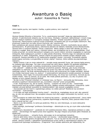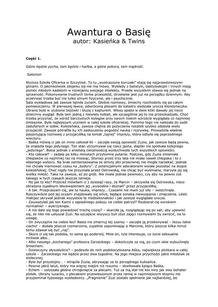 Awantura o Basię autor: Kasieńka & Twins Część 1. Gdzie będzie pycha, tam będzie i hańba, a gdzie pokora, tam mądrość. Salomon Wyższa Szkoła Oficerka w Szczytnie. To tu „wystraszone kurczaki” stają się najprawdziwszymi glinami. O jakimkolwiek obijaniu się nie ma mowy. Wykłady z balistyki, daktyloskopii i innych mają pomóc młodym kadetom w rozwijaniu swojego intelektu. Przede wszystkim stawia się jednak na sprawność. Pokonywanie trudnych torów przeszkód, strzelanie jest już na porządku dziennym. Aby przetrwać trzeba być nie tylko silnym fizycznie, ale i psychicznie. Sala wykładowa jak zawsze tętniła życiem. Głośne rozmowy, śmiechy rozchodziły się po całym pomieszczeniu. W pierwszej ławce, odwrócona plecami do katedry siedziała urocza blondyneczka. Ubrana była w ulubione bojówki i bluzę z kapturem. Włosy spięte w dwie kitki dawały jej nieco dziecinny wygląd. Była tam jedną z niewielu kobiet, ale szczególnie jej to nie przeszkadzało. Choć trzeba przyznać, że wśród barczystych kolegów przy swoim niskim wzroście wyglądała co najmniej śmiesznie. Była najlepszym uczniem w całej szkole oficerskiej. Pomimo tego nie należała do osób zadufanych w sobie. Koleżeńska, zawsze chętna do pożyczenia notatek szybko zdobyła wielu przyjaciół. Zawsze potrafiła ku ich zaskoczeniu pogodzić naukę i rozrywkę. Prowadziła właśnie pasjonującą rozmowę z przyjaciółką na temat „tajnej” imprezy, która odbyła się poprzedniego wieczoru. - Baśka mówię ci jak on mnie całował łiii – zaczęła swoją opowieść Zuzia, jak zawsze będą pewna, że znalazła tego jedynego. Ten stan utrzymywał się rzecz jasna, dopóki nie spotkała kolejnego „jedynego”. Basia jednak z anielską cierpliwością wysłuchiwała tych wszystkich opowieści. - Kto całował? – zadała po kilku minutach przytomne pytanie. Podczas, gdy Zuzia zmieniała chłopaków co najmniej raz na miesiąc, Storosz przez trzy lata nie miała nawet chłopaka i to z własnego wyboru. Na brak zainteresowania ze strony płci przeciwnej nie mogła narzekać, jednak nie chciała marnować czasu na „bzdury”. Z potencjalnymi adoratorami wolała pozostać na stopie koleżeńskiej. Choć nigdy nie przyznała przed Ostrowską, nie chcąc być wyśmiana, marzyła jej się wielka miłość. Taka na zawsze, aż po grób. Nie miała jednak pewności, czy aby na pewno coś takiego w tych czasach jeszcze istnieje. - No jak to kto? Przecież mówiłam ci z dziesięć razy, że Marcin – skrzywiła się Ostrowska, nieco obrażona zupełnym lekceważeniem jej „wywodów i doznań” przez przyjaciółkę. - A tak. Przepraszam cię, ale ta nauka, imprezy… Czasami nie mam już siły – westchnęła. Rzeczywiście pod jej oczami znajdowały się sińce, będące oznaką niewyspania i zmęczenia. Lekki makijaż ukrywał jednak wszystkie te niedoskonałości i jak zawsze wyglądała uroczo. - Zauważyłaś jak ten Kamil z sąsiedniego pokoju na ciebie patrzył? Rozbierał cię wzrokiem normalnie! – wykrzyknęła. - A nie dało się tego powiedzieć trochę ciszej? – skarciła ją, rozglądając się po sali, aby upewnić się, że nikt nie usłyszał Zuzi. Na szczęście wszyscy byli zbyt zajęci rozmowami by zwrócić, na to uwagę. - On zwyczajnie na ciebie leci! Basia nie zmarnuj tej szansy – zaczęła ją przekonywać - Jezuu takie ciacho! – dodała jeszcze rozmarzona, zupełnie zapominając o Marcinie, który jeszcze kilka minut temu zdawał się być „naj”. - Skoro ci się tak podoba, to sama go poderwij. Mnie on, tyle interesuje, co życie seksualne mrówek albo… - Albo naszego „kochanego” profesora Zarzeckiego – dokończyła za nią, po czym obie wybuchnęły śmiechem. - Dziewczyny słyszałyście? – podeszła do nich podekscytowana Aśka, największa plotkara w całej szkole - Zarzeckiego nie będzie przez dwa tygodnie. Na jego miejsce przychodzi jakiś młodziak ze stołecznej. - Byle był przystojny… - wtrąciła Zuzia, obrywając za to porządnego kuksańca. - Pewnie jakiś laluś, który ma więcej mięśni niż rozumu – skwitowała kpiąco Baśka. - Echem – usłyszała głośne chrząknięcie za plecami. Tuż za nią stał nie kto inny jak owy bohater plotek. Ubrany luzacko, z plecakiem przewieszonym przez ramię w najmniejszym stopniu nie przypominał typowego wykładowcy. „Pragnienie” Zuzi zostało spełnione jak najbardziej, bo rzeczywiście był bardzo przystojny. Patrzył na Baśkę, obdarzając ją morderczym spojrzeniem. W całej niekomfortowości tej sytuacji nie omieszkała zauważyć, że „profesor” ma piękne, błękitne oczy. Zdawały się takie inne od tysięcy par oczu, jakie widziała w całym swym życiu. Były po prostu niezwykłe… Niestety została dość szybko przywrócona do rzeczywistości. - Mięśnie owszem posiadam, a co do mojego rozumu pozwoli pani, że pozostawię go swojej ocenie. Za to ten pani chętnie sprawdzę – rzucił złośliwie i podszedł do katedry. Storosz spuściła głowę oblewając się ogromnym rumieńcem. - Nazywam się Marek Brodecki. Jestem podkomisarzem Komendy Stołecznej. Przez dwa tygodnie będę zajmował się waszą grupą. Nie lubię długich przemówień, więc powiem krótko. Podobno gliny dzielą się na tych dobrych i złych. Muszę was zmartwić, ale trafiliście na złego – oznajmił z poważną mina, a po sali przeszedł gromki śmiech. Po tym jakże oryginalnym ustaleniu jasnej granicy w tych kontaktach interpersonalnych „uczeń – wykładowca”, nikt nie ukrywał rozbawienia. Bowiem mówiła to osoba, niewiele starsza od nich samych, która zapewnie nie miała zbyt dużego doświadczenia w tym fachu. Owszem, może posiada od nich głębszą wiedzę praktyczną, o wiele cenniejszą od tej teoretycznej, wykładanej tutaj, jednak jego sposób wysławiania się, jak i styl ubierania stanowczo różnił się od standardowych, co w żadnym zakresie nie 