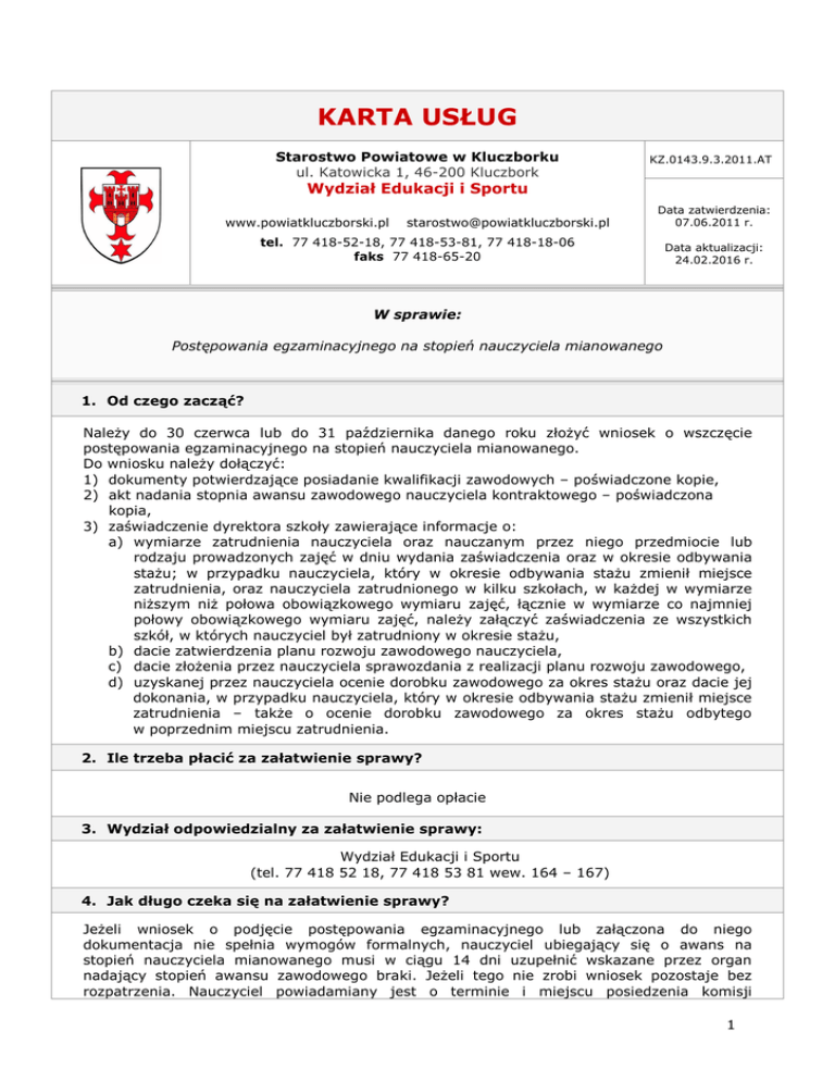 KARTA USŁUG Starostwo Powiatowe w Kluczborku ul. Katowicka 1, 46-200 Kluczbork KZ.0143.9.3.2011.AT Wydział Edukacji i Sportu www.powiatkluczborski.pl [email protected] Data zatwierdzenia: 07.06.2011 r. tel. 77 418-52-18, 77 418-53-81, 77 418-18-06 faks 77 418-65-20 Data aktualizacji: 24.02.2016 r. W sprawie: Postępowania egzaminacyjnego na stopień nauczyciela mianowanego 1. Od czego zacząć? Należy do 30 czerwca lub do 31 października danego roku złożyć wniosek o wszczęcie postępowania egzaminacyjnego na stopień nauczyciela mianowanego. Do wniosku należy dołączyć: 1) dokumenty potwierdzające posiadanie kwalifikacji zawodowych – poświadczone kopie, 2) akt nadania stopnia awansu zawodowego nauczyciela kontraktowego – poświadczona kopia, 3) zaświadczenie dyrektora szkoły zawierające informacje o: a) wymiarze zatrudnienia nauczyciela oraz nauczanym przez niego przedmiocie lub rodzaju prowadzonych zajęć w dniu wydania zaświadczenia oraz w okresie odbywania stażu; w przypadku nauczyciela, który w okresie odbywania stażu zmienił miejsce zatrudnienia, oraz nauczyciela zatrudnionego w kilku szkołach, w każdej w wymiarze niższym niż połowa obowiązkowego wymiaru zajęć, łącznie w wymiarze co najmniej połowy obowiązkowego wymiaru zajęć, należy załączyć zaświadczenia ze wszystkich szkół, w których nauczyciel był zatrudniony w okresie stażu, b) dacie zatwierdzenia planu rozwoju zawodowego nauczyciela, c) dacie złożenia przez nauczyciela sprawozdania z realizacji planu rozwoju zawodowego, d) uzyskanej przez nauczyciela ocenie dorobku zawodowego za okres stażu oraz dacie jej dokonania, w przypadku nauczyciela, który w okresie odbywania stażu zmienił miejsce zatrudnienia – także o ocenie dorobku zawodowego za okres stażu odbytego w poprzednim miejscu zatrudnienia. 2. Ile trzeba płacić za załatwienie sprawy? Nie podlega opłacie 3. Wydział odpowiedzialny za załatwienie sprawy: Wydział Edukacji i Sportu (tel. 77 418 52 18, 77 418 53 81 wew. 164 – 167) 4. Jak długo czeka się na załatwienie sprawy? Jeżeli wniosek o podjęcie postępowania egzaminacyjnego lub załączona do niego dokumentacja nie spełnia wymogów formalnych, nauczyciel ubiegający się o awans na stopień nauczyciela mianowanego musi w ciągu 14 dni uzupełnić wskazane przez organ nadający stopień awansu zawodowego braki. Jeżeli tego nie zrobi wniosek pozostaje bez rozpatrzenia. Nauczyciel powiadamiany jest o terminie i miejscu posiedzenia komisji 1 egzaminacyjnej na co najmniej 14 dni przed posiedzeniem komisji. 5. W jaki sposób odebrać dokument kończący sprawę? W dniu posiedzenia komisji egzaminacyjnej wydawane jest zaświadczenie o zdaniu egzaminu. Decyzja o nadaniu lub odmowie nadania stopnia awansu zawodowego wydawana jest do dnia 31 sierpnia danego roku, w przypadku złożenia wniosku do dnia 30 czerwca. Natomiast w przypadku złożenia wniosku o wszczęcie postępowania egzaminacyjnego do dnia 31 października w/w decyzja wydawana jest do dnia 31 grudnia danego roku. 6. Przepisy prawne obowiązujące przy postępowaniu w danej sprawie: Ustawa z dnia 26 stycznia 1982 r. Karta Nauczyciela (Dz. U. z 2014, poz. 191 z późn. zm.), Rozporządzenie Ministra Edukacji Narodowej z dnia 1 marca 2013 r. w sprawie uzyskiwania stopni awansu zawodowego przez nauczycieli (Dz. U. z 2013 r. poz. 393) 7. O czym wnioskodawca wiedzieć powinien? Wniosek wraz z załącznikami należy złożyć w Kancelarii Ogólnej – Biurze Obsługi Klienta (II piętro obok Sekretariatu) 8. Co przysługuje wnioskodawcy? Skarga do Starosty Kluczborskiego, Odwołanie do Opolskiego Kuratora Oświaty za pośrednictwem Starosty Kluczborskiego w terminie 14 dni od dnia doręczania decyzji. 9. Wzór wniosku do pobrania: w Wydziale Edukacji i Sportu, pokój nr 311-313, na stronie internetowej powiatu kluczborskiego pod adresem: www.powiatkluczborski.pl oraz w Biuletynie Informacji Publicznej Starostwa Powiatowego w Kluczborku pod adresem: http://kluczbork.starostwo.nowoczesnagmina.pl DODATKOWE UWAGI: W skład komisji egzaminacyjnej powoływanej przez Zarząd Powiatu w Kluczborku wchodzi: - przedstawiciel organu prowadzącego szkołę, - przedstawiciel organu nadzoru pedagogicznego, - dyrektor szkoły/placówki, - dwóch ekspertów, posiadających kwalifikacje do zajmowania stanowiska nauczyciela w szkole tego samego typu i rodzaju co szkoła, w której nauczyciel jest zatrudniony, z których co najmniej jeden naucza tego samego przedmiotu lub prowadzi ten sam rodzaj zajęć co nauczyciel. Na wniosek nauczyciela, do komisji może być powołany przedstawiciel wskazanego we wniosku związku zawodowego. Godziny urzędowania Starostwa Powiatowego w Kluczborku: Poniedziałek godz. 8.00 – 16.00 Wtorek-Piątek godz. 7.00-15.00 Opracowała: Anna Turczyńska Zatwierdziła: Rozalia Słoniowska 2