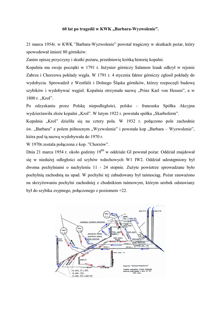 60 lat po tragedii w KWK „Barbara-Wyzwolenie”. 21 marca 1954r. w KWK ”Barbara-Wyzwolenie” powstał tragiczny w skutkach pożar, który spowodował śmierć 80 górników. Zanim opiszę przyczyny i skutki pożaru, przedstawię krótką historię kopalni. Kopalnia ma swoje początki w 1791 r. Inżynier górniczy Salamon Izaak odkrył w rejonie Zabrza i Chorzowa pokłady węgla. W 1791 r. 4 stycznia faktor górniczy zgłosił pokłady do wydobycia. Sprowadził z Westfalii i Dolnego Śląska górników, którzy rozpoczęli budowę szybików i wydobywać węgiel. Kopalnia otrzymała nazwę „Prinz Karl von Hessen”, a w 1800 r. „Krol”. Po odzyskaniu przez Polskę niepodległości, polsko - francuska Spółka Akcyjna wydzierżawiła złoże kopalni „Krol”. W lutym 1922 r. powstała spółka „Skarboferm”. Kopalnia „Krol” dzieliła się na cztery pola. W 1932 r. połączono pole zachodnie św. „Barbara” z polem północnym „Wyzwolenie” i powstała kop „Barbara – Wyzwolenie”, która pod tą nazwą wydobywała do 1970 r. W 1970r.zostala połączona z kop. ”Chorzów”. Dnia 21 marca 1954 r. około godziny 1900 w oddziale GI powstał pożar. Oddział znajdował się w niedużej odległości od szybów wdechowych W1 IW2. Oddział udostępniony był dwoma pochylniami o nachyleniu 11 - 24 stopnie. Zużyte powietrze sprowadzane było pochylnią zachodnią na upad. W pochylni tej zabudowany był taśmociąg. Pożar zauważono na skrzyżowaniu pochylni zachodniej z chodnikiem taśmowym, którym urobek odstawiany był do szybika zsypnego, połączonego z poziomem +22. Chodnik wentylacyjny odprowadzający zużyte powietrze z oddz.G1 miał zróżnicowany przekrój, miejscami miał przekrój 3,5m2. Aby poprawić przepływ powietrza, w chodniku wentylacyjnym zabudowano wentylator pomocniczy w tamie drewnianej z drzwiami. Wentylator główny posiadał depresje 30 mm słupa wody. W systemie szybów W1, W2 i szybu wentylacyjnego znajdowały się oddz. G3, G4, G4a, G5 i G7. Duża depresja pożaru spowodowała odwrócenie prądów a wyłączony wentylator i zamknięta tama spowodowały cofanie dymów. Przyczyn wyłączenia wentylatora nie ustalono. Zadymieniu uległo podszybie szybów W1, W2 przekop główny na poz. +22 oraz oddz. 4IG4a. Najwięcej osób zginęło z oddz. G4. Załoga wycofała się na przekop główny +22, który był silnie zadymiony. Usiłowano dotrzeć do szybu „Maria”. Ludzie ci ginęli w kilka minut, zatruci tlenkiem węgla. Część górników zginęła na skutek zagubienia. Trzy osoby, obsługi pompowni przy szybie wentylacyjnym, zginęły w przedziale drabinowym szybu wentylacyjnego. Duża grupa zatrutych, którzy zginęli na przekopie poz. +22, została odnaleziona 80 godzinach akcji. Poszukiwanie zaginionych w oddz. G1 trwały 14 dni. Odgazowanie wyrobisk trwało 32 dni, a dalsze 20 dni tamowanie miejsca pożaru. Po otwarciu pola pożarowego w lipcu 1954r.sttwierdzono, że część wyrobisk nadaje się do użytkowania po wykonaniu nowej rozcinki. Jednoznacznej przyczyny pożaru nie ustalono. Przypuszcza się, że pożar powstał na skutek samozapalenia węgla. Jednak miejsce jego zauważenia i gwałtowny rozwój wskazują, że przyczyna było zapalenie drewnianej obudowy chodnika od lampy górniczej. Z katastrofy wyciągnięto następujące wnioski: − akcją ratowniczą powinien kierować dyrektor kopalni i jego zastępca − osoby jednostek nadrzędnych i nadzoru górniczego powinni stanowić ciało doradcze sztab − celowe jest powołanie „Górniczego Korpusu Ratowniczego złożonego z inżynierów i doświadczonych ratowników − wycofać z kopalń światło otwarte − wyrobiska wyposażyć w sieć rurociągów p. pożarowych, − należy poprawić jakość i ilość środków łączności − wyposażyć załogi w aparaty ochrony dróg oddechowych. Aby przyśpieszyć prace nad aparatem chroniącym drogi oddechowe w czasie pożaru, delegacja polskich inżynierów z Wiceministrem Janem Mitręgą przemyciła z ZSRR aparat chroniący drogi oddechowe, który był wzorem do opracowania polskiego aparatu POG-8 − zapoznawać dozór i załogi z drogami ucieczkowymi. Opracował Józef Białek Źródła: Materiały na konferencję Wentylacyjno-Pożarowa 1957r. Prof. W. Budryk – „Pożary” Kronika KWK „Barbara-Wyzwolenie”