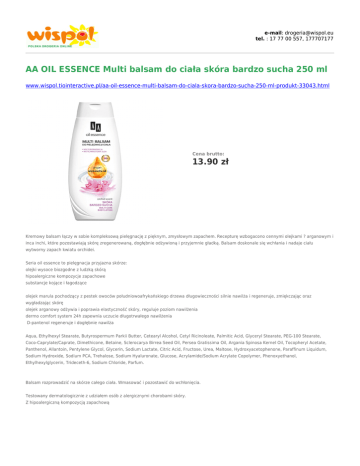 e-mail: [email protected] tel. : 17 77 00 557, 177707177 AA OIL ESSENCE Multi balsam do ciała skóra bardzo sucha 250 ml www.wispol.tiointeractive.pl/aa-oil-essence-multi-balsam-do-ciala-skora-bardzo-sucha-250-ml-produkt-33043.html Cena brutto: 13.90 zł Kremowy balsam łączy w sobie kompleksową pielęgnację z pięknym, zmysłowym zapachem. Recepturę wzbogacono cennymi olejkami ? arganowym i inca inchi, które pozostawiają skórę zregenerowaną, dogłębnie odżywioną i przyjemnie gładką. Balsam doskonale się wchłania i nadaje ciału wytworny zapach kwiatu orchidei. Seria oil essence to pielęgnacja przyjazna skórze: olejki wysoce biozgodne z ludzką skórą hipoalergiczne kompozycje zapachowe substancje kojące i łagodzące olejek marula pochodzący z pestek owoców południowoafrykańskiego drzewa długowieczności silnie nawilża i regeneruje, zmiękczając oraz wygładzając skórę olejek arganowy odżywia i poprawia elastyczność skóry, reguluje poziom nawilżenia dermo comfort system 24h zapewnia uczucie długotrwałego nawilżenia D-pantenol regeneruje i dogłębnie nawilża Aqua, Ethylhexyl Stearate, Butyrospermum Parkii Butter, Cetearyl Alcohol, Cetyl Ricinoleate, Palmitic Acid, Glyceryl Stearate, PEG-100 Stearate, Coco-Caprylate/Caprate, Dimethicone, Betaine, Sclerocarya Birrea Seed Oil, Persea Gratissima Oil, Argania Spinosa Kernel Oil, Tocopheryl Acetate, Panthenol, Allantoin, Pentylene Glycol, Glycerin, Sodium Lactate, Citric Acid, Fructose, Urea, Maltose, Hydroxyacetophenone, Paraffinum Liquidum, Sodium Hydroxide, Sodium PCA, Trehalose, Sodium Hyaluronate, Glucose, Acrylamide/Sodium Acrylate Copolymer, Phenoxyethanol, Ethylhexylglycerin, Trideceth-6, Sodium Chloride, Parfum. Balsam rozprowadzić na skórze całego ciała. Wmasować i pozostawić do wchłonięcia. Testowany dermatologicznie z udziałem osób z alergicznymi chorobami skóry. Z hipoalergiczną kompozycją zapachową Nie zawiera barwników i parabenów pH neutralne dla skóry. pH neutralne dla skóry. *Ceny obowiązują wyłącznie przy składaniu zamówień przez sklep internetowy. Ceny w sklepach mogą nieznacznie różnić się od cen prezentowanych na stronach sklepu internetowego. Przedstawiona oferta w sklepie internetowym nie stanowi oferty w rozumieniu Kodeksu Cywilnego, i jest jedynie zaproszeniem do rozpoczęcia rokowań (zgodnie z art. 71 k.c.). Zastrzegamy sobie prawo do niezrealizowania zamówień z ważnych przyczyn ekonomicznych.