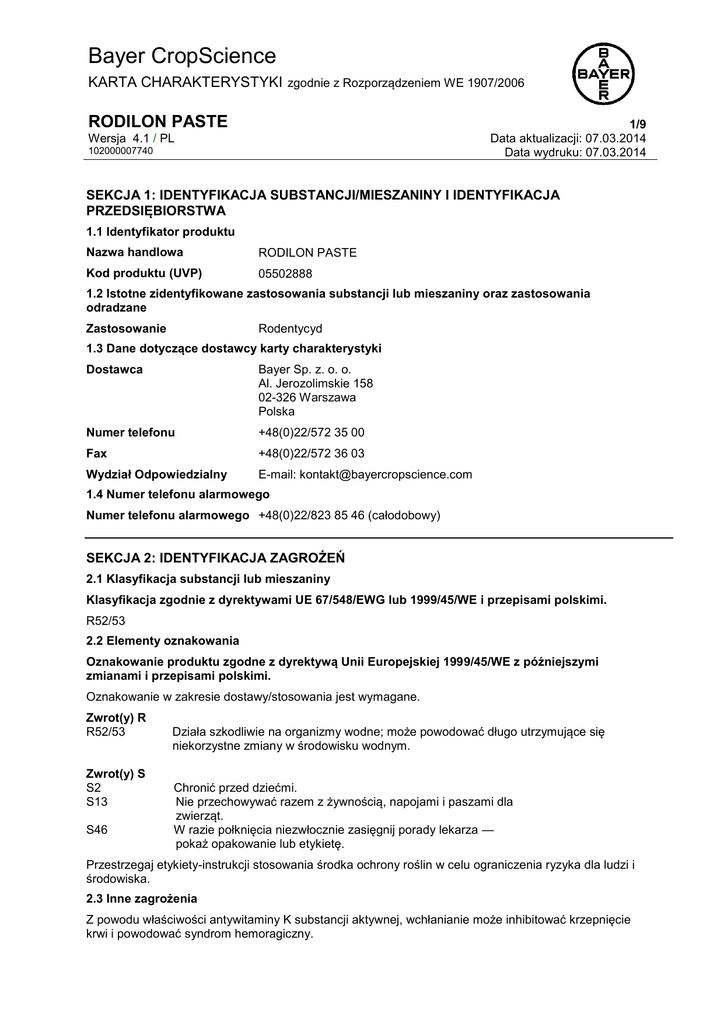 Bayer CropScience KARTA CHARAKTERYSTYKI zgodnie z Rozporządzeniem WE 1907/2006 RODILON PASTE 1/9 Data aktualizacji: 07.03.2014 Data wydruku: 07.03.2014 Wersja 4.1 / PL 102000007740 SEKCJA 1: IDENTYFIKACJA SUBSTANCJI/MIESZANINY I IDENTYFIKACJA PRZEDSIĘBIORSTWA 1.1 Identyfikator produktu Nazwa handlowa RODILON PASTE Kod produktu (UVP) 05502888 1.2 Istotne zidentyfikowane zastosowania substancji lub mieszaniny oraz zastosowania odradzane Zastosowanie Rodentycyd 1.3 Dane dotyczące dostawcy karty charakterystyki Dostawca Bayer Sp. z. o. o. Al. Jerozolimskie 158 02-326 Warszawa Polska Numer telefonu +48(0)22/572 35 00 Fax +48(0)22/572 36 03 Wydział Odpowiedzialny E-mail: [email protected] 1.4 Numer telefonu alarmowego Numer telefonu alarmowego +48(0)22/823 85 46 (całodobowy) SEKCJA 2: IDENTYFIKACJA ZAGROŻEŃ 2.1 Klasyfikacja substancji lub mieszaniny Klasyfikacja zgodnie z dyrektywami UE 67/548/EWG lub 1999/45/WE i przepisami polskimi. R52/53 2.2 Elementy oznakowania Oznakowanie produktu zgodne z dyrektywą Unii Europejskiej 1999/45/WE z późniejszymi zmianami i przepisami polskimi. Oznakowanie w zakresie dostawy/stosowania jest wymagane. Zwrot(y) R R52/53 Zwrot(y) S S2 S13 S46 Działa szkodliwie na organizmy wodne; może powodować długo utrzymujące się niekorzystne zmiany w środowisku wodnym. Chronić przed dziećmi. Nie przechowywać razem z żywnością, napojami i paszami dla zwierząt. W razie połknięcia niezwłocznie zasięgnij porady lekarza — pokaż opakowanie lub etykietę. Przestrzegaj etykiety-instrukcji stosowania środka ochrony roślin w celu ograniczenia ryzyka dla ludzi i środowiska. 2.3 Inne zagrożenia Z powodu właściwości antywitaminy K substancji aktywnej, wchłanianie może inhibitować krzepnięcie krwi i powodować syndrom hemoragiczny. Bayer CropScience KARTA CHARAKTERYSTYKI zgodnie z Rozporządzeniem WE 1907/2006 RODILON PASTE 2/9 Data aktualizacji: 07.03.2014 Data wydruku: 07.03.2014 Wersja 4.1 / PL 102000007740 SEKCJA 3: SKŁAD/INFORMACJA O SKŁADNIKACH 3.2 Mieszaniny Charakterystyka chemiczna Przynęta (gotowa do zastosowania) (RB) Difetialon 0,0025 % Składniki niebezpieczne Zwrot(y) R zgodnie z dyrektywą Unii Europejskiej 67/548/EWG i przepisami polskimi. Zwroty wskazujące rodzaj zagrożenia zgodnie z Rozporządzeniem WE 1907/2006 Nazwa Difetialon Nr CAS / Nr WE 104653-34-1 600-594-7 Klasyfikacja Dyrektywa 67/548/EWG T+; R26/27/28 T; R48/23/24/25 N; R50/53 Rozporządzenie (WE) NR 1272/2008 Acute Tox. 1, H300 Acute Tox. 1, H310 Acute Tox. 1, H330 STOT RE 1, H372 Aquatic Acute 1, H400 Aquatic Chronic 1, H410 Stężenie [%] 0,0025 Dalsze informacje Pełen tekst zwrotów R i zwrotów H/ wskazujących rodzaj zagrożenia/ podano w Sekcji 16. SEKCJA 4: ŚRODKI PIERWSZEJ POMOCY 4.1 Opis środków pierwszej pomocy Porady ogólne Usunąć z zagrożonej strefy. Ułożyć i transportować poszkodowanego w stabilnej pozycji (bocznej ustalonej). Natychmiast zdjąć całą zanieczyszczoną odzież i usunąć w bezpieczny sposób. Kontakt ze skórą Natychmiast umyć dużą ilością wody z mydłem. Jeśli objawy utrzymują się, wezwać lekarza. Kontakt z oczami Natychmiast płukać dużą ilością wody, także pod powiekami przynajmniej przez 15 minut. Usunąć soczewki kontaktowe, jeżeli są obecne, po pierwszych 5 minutach, potem kontynuować płukanie oczu. Uzyskać pomoc medyczną w przypadku pojawienia się i utrzymywania podrażnienia. Połknięcie Wypłukać usta. NIE prowokować wymiotów. Wywołać wymioty tylko jeżeli: 1. poszkodowany jest całkowicie przytomny, 2. nie ma dostępu do pomocy medycznej, 3. w przypadku połknięcia większej ilości (więcej niż jeden łyk) i 4. spożycie nastąpiło w czasie krótszym niż 1 godzina. (Wymioty nie mogą dostać się do dróg oddechowych). Podać węgiel aktywny. Natychmiast wezwać lekarza lub powiadomić ośrodek toksykologiczny. 4.2 Najważniejsze ostre i opóźnione objawy oraz skutki narażenia Objawy Krwotoki i podbiegnięcia krwawe, krwiomocz, krwawy kał, krwawe wymioty, krwotok z nosa, krwawienie dziąseł Bayer CropScience KARTA CHARAKTERYSTYKI zgodnie z Rozporządzeniem WE 1907/2006 RODILON PASTE 3/9 Data aktualizacji: 07.03.2014 Data wydruku: 07.03.2014 Wersja 4.1 / PL 102000007740 4.3 Wskazania dotyczące wszelkiej natychmiastowej pomocy lekarskiej i szczególnego postępowania z poszkodowanym Zagrożenia Z powodu właściwości antywitaminy K substancji aktywnej, wchłanianie może inhibitować krzepnięcie krwi i powodować syndrom hemoragiczny. Pierwsza pomoc Objawy mogą się pojawić dopiero w kilka godzin po zatruciu. Zapewnić opiekę medyczną przynajmniej przez 48 godzin. Leczenie miejscowe. Leczenie początkowe: objawowe. Leczenie układowe: Wymagane monitorowanie obrazu krwi. Monitorować: czas krzepnięcia krwi/ wartość INR. Antidotum: Witamina K1. W przypadkach ostrego zatrucia mogą być stosowane typowe działania, takie jak podanie produktów krwiopochodnych lub transfuzja. Powrót do zdrowia jest samoistny i bez następstw. Płukanie żołądka powinno być brane pod uwagę w ciągu pierwszej godziny (lub pierwszych dwóch godzin) w przypadku przyjęcia dużych dawek. Mimo to zalecane jest podanie węgla aktywowanego i siarczanu sodu. Objawy mogą się pojawić dopiero w kilka godzin po zatruciu. SEKCJA 5: POSTĘPOWANIE W PRZYPADKU POŻARU 5.1 Środki gaśnicze Odpowiednie Stosować mgłę wodną, pianę alkoholoodporną, proszki gaśnicze lub dwutlenek węgla. Niewłaściwe Silny strumień wody 5.2 Szczególne zagrożenia związane z substancją lub mieszaniną W przypadku pożaru tworzą się niebezpieczne gazy. 5.3 Informacje dla straży pożarnej Specjalny sprzęt ochronny dla strażaków W razie pożaru i/lub wybuchu nie wdychać dymu. W razie pożaru, założyć aparat oddechowy z zamkniętym obiegiem powietrza. Informacja uzupełniająca Ograniczyć rozprzestrzenianie się środków gaśniczych. Nie dopuścić do przedostania się wody gaśniczej do sieci wo