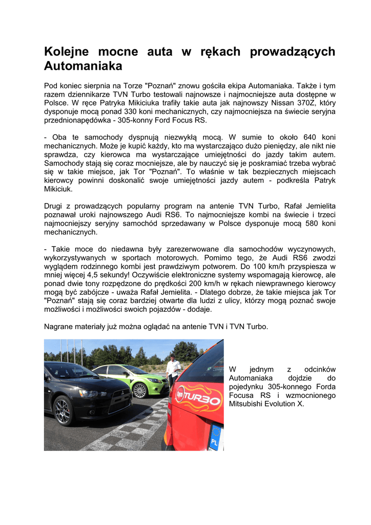 Kolejne mocne auta w rękach prowadzących Automaniaka Pod koniec sierpnia na Torze "Poznań" znowu gościła ekipa Automaniaka. Także i tym razem dziennikarze TVN Turbo testowali najnowsze i najmocniejsze auta dostępne w Polsce. W ręce Patryka Mikiciuka trafiły takie auta jak najnowszy Nissan 370Z, który dysponuje mocą ponad 330 koni mechanicznych, czy najmocniejsza na świecie seryjna przednionapędówka - 305-konny Ford Focus RS. - Oba te samochody dyspnują niezwykłą mocą. W sumie to około 640 koni mechanicznych. Może je kupić każdy, kto ma wystarczająco dużo pieniędzy, ale nikt nie sprawdza, czy kierowca ma wystarczające umiejętności do jazdy takim autem. Samochody stają się coraz mocniejsze, ale by nauczyć się je poskramiać trzeba wybrać się w takie miejsce, jak Tor "Poznań". To właśnie w tak bezpiecznych miejscach kierowcy powinni doskonalić swoje umiejętności jazdy autem - podkreśla Patryk Mikiciuk. Drugi z prowadzących popularny program na antenie TVN Turbo, Rafał Jemielita poznawał uroki najnowszego Audi RS6. To najmocniejsze kombi na świecie i trzeci najmocniejszy seryjny samochód sprzedawany w Polsce dysponuje mocą 580 koni mechanicznych. - Takie moce do niedawna były zarezerwowane dla samochodów wyczynowych, wykorzystywanych w sportach motorowych. Pomimo tego, że Audi RS6 zwodzi wyglądem rodzinnego kombi jest prawdziwym potworem. Do 100 km/h przyspiesza w mniej więcej 4,5 sekundy! Oczywiście elektroniczne systemy wspomagają kierowcę, ale ponad dwie tony rozpędzone do prędkości 200 km/h w rękach niewprawnego kierowcy mogą być zabójcze - uważa Rafał Jemielita. - Dlatego dobrze, że takie miejsca jak Tor "Poznań" stają się coraz bardziej otwarte dla ludzi z ulicy, którzy mogą poznać swoje możliwości i możliwości swoich pojazdów - dodaje. Nagrane materiały już można oglądać na antenie TVN i TVN Turbo. W jednym z odcinków Automaniaka dojdzie do pojedynku 305-konnego Forda Focusa RS i wzmocnionego Mitsubishi Evolution X. Utrzymanie 580-konnego Audi RS6 w zakręcie jest nie lada wyzwaniem. Dlatego wszystkie szczegóły muszą być dokładnie dopracowane. Zrobienie dobrego ujęcia niekiedy wymaga wielokrotnego pokonania jednego zakrętu. Patryk Mikiciuk, Ford Focus RS i Tor "Poznań". Dla dużego prowadzącego odpowiednio pojemne auto. Rafał Jemielita i Audi RS6. Każde ujęcie jest dopracowane w najmniejszych szczegółach. Dlatego przygotowanie kilkuminutowego materiału to często wiele godzin pracy operatorów. Schronienie Skody. w cieniu Turbo Niektóre zdjęcia wykonywane są z bagażnika samochodu. Opony w Nissanie 370Z nie wytrzymały całodziennej jazdy po torze.