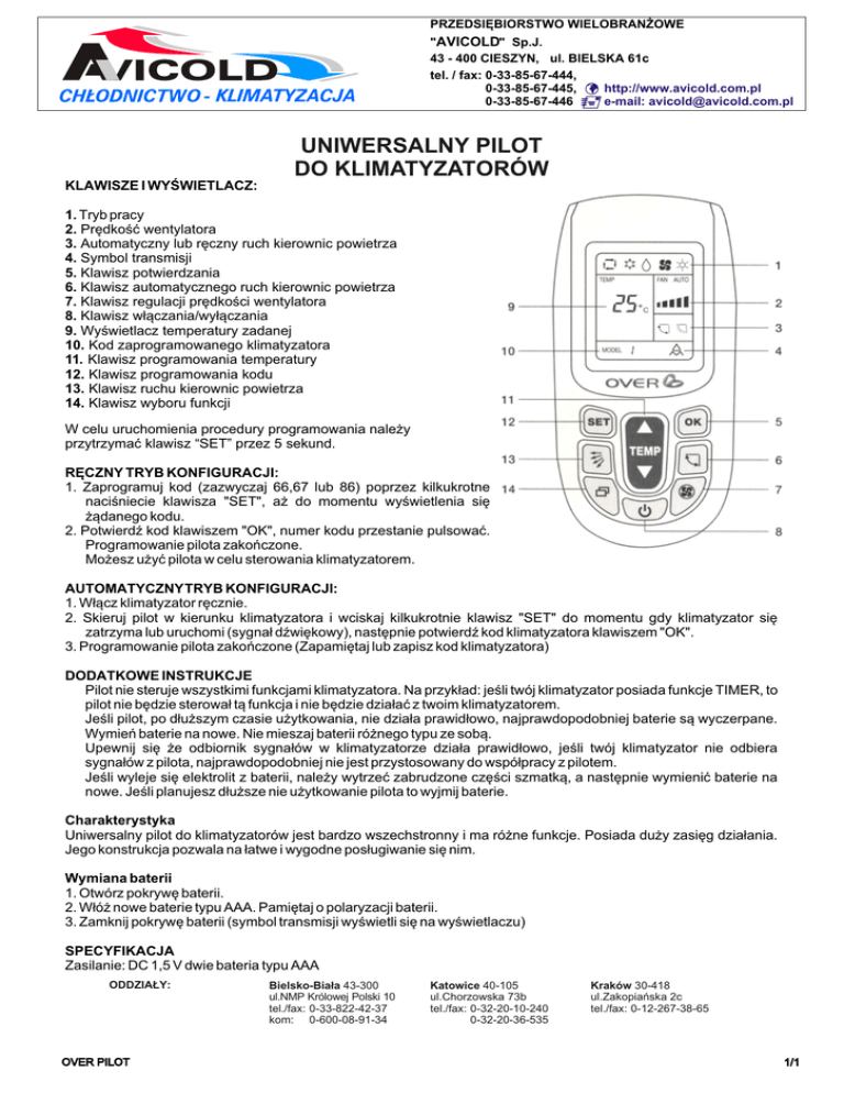 PRZEDSIÊBIORSTWO WIELOBRAN¯OWE "AVICOLD" Sp.J. 43 - 400 CIESZYN, ul. BIELSKA 61c tel. / fax: 0-33-85-67-444, 0-33-85-67-445, http://www.avicold.com.pl 0-33-85-67-446 e-mail: [email protected] UNIWERSALNY PILOT DO KLIMATYZATORÓW KLAWISZE I WYŒWIETLACZ: 1. Tryb pracy 2. Prêdkoœæ wentylatora 3. Automatyczny lub rêczny ruch kierownic powietrza 4. Symbol transmisji 5. Klawisz potwierdzania 6. Klawisz automatycznego ruch kierownic powietrza 7. Klawisz regulacji prêdkoœci wentylatora 8. Klawisz w³¹czania/wy³¹czania 9. Wyœwietlacz temperatury zadanej 10. Kod zaprogramowanego klimatyzatora 11. Klawisz programowania temperatury 12. Klawisz programowania kodu 13. Klawisz ruchu kierownic powietrza 14. Klawisz wyboru funkcji W celu uruchomienia procedury programowania nale¿y przytrzymaæ klawisz “SET” przez 5 sekund. RÊCZNY TRYB KONFIGURACJI: 1. Zaprogramuj kod (zazwyczaj 66,67 lub 86) poprzez kilkukrotne naciœniecie klawisza "SET", a¿ do momentu wyœwietlenia siê ¿¹danego kodu. 2. PotwierdŸ kod klawiszem "OK", numer kodu przestanie pulsowaæ. Programowanie pilota zakoñczone. Mo¿esz u¿yæ pilota w celu sterowania klimatyzatorem. AUTOMATYCZNY TRYB KONFIGURACJI: 1. W³¹cz klimatyzator rêcznie. 2. Skieruj pilot w kierunku klimatyzatora i wciskaj kilkukrotnie klawisz "SET" do momentu gdy klimatyzator siê zatrzyma lub uruchomi (sygna³ dŸwiêkowy), nastêpnie potwierdŸ kod klimatyzatora klawiszem "OK". 3. Programowanie pilota zakoñczone (Zapamiêtaj lub zapisz kod klimatyzatora) DODATKOWE INSTRUKCJE ! Pilot nie steruje wszystkimi funkcjami klimatyzatora. Na przyk³ad: jeœli twój klimatyzator posiada funkcje TIMER, to pilot nie bêdzie sterowa³ t¹ funkcja i nie bêdzie dzia³aæ z twoim klimatyzatorem. ! Jeœli pilot, po d³u¿szym czasie u¿ytkowania, nie dzia³a prawid³owo, najprawdopodobniej baterie s¹ wyczerpane. Wymieñ baterie na nowe. Nie mieszaj baterii ró¿nego typu ze sob¹. ! Upewnij siê ¿e odbiornik sygna³ów w klimatyzatorze dzia³a prawid³owo, jeœli twój klimatyzator nie odbiera sygna³ów z pilota, najprawdopodobniej nie jest przystosowany do wspó³pracy z pilotem. ! Jeœli wyleje siê elektrolit z baterii, nale¿y wytrzeæ zabrudzone czêœci szmatk¹, a nastêpnie wymieniæ baterie na nowe. Jeœli planujesz d³u¿sze nie u¿ytkowanie pilota to wyjmij baterie. Charakterystyka Uniwersalny pilot do klimatyzatorów jest bardzo wszechstronny i ma ró¿ne funkcje. Posiada du¿y zasiêg dzia³ania. Jego konstrukcja pozwala na ³atwe i wygodne pos³ugiwanie siê nim. Wymiana baterii 1. Otwórz pokrywê baterii. 2. W³ó¿ nowe baterie typu AAA. Pamiêtaj o polaryzacji baterii. 3. Zamknij pokrywê baterii (symbol transmisji wyœwietli siê na wyœwietlaczu) SPECYFIKACJA Zasilanie: DC 1,5 V dwie bateria typu AAA ODDZIA£Y: OVER PILOT Bielsko-Bia³a 43-300 ul.NMP Królowej Polski 10 tel./fax: 0-33-822-42-37 kom: 0-600-08-91-34 Katowice 40-105 ul.Chorzowska 73b tel./fax: 0-32-20-10-240 0-32-20-36-535 Kraków 30-418 ul.Zakopiañska 2c tel./fax: 0-12-267-38-65 1/1
