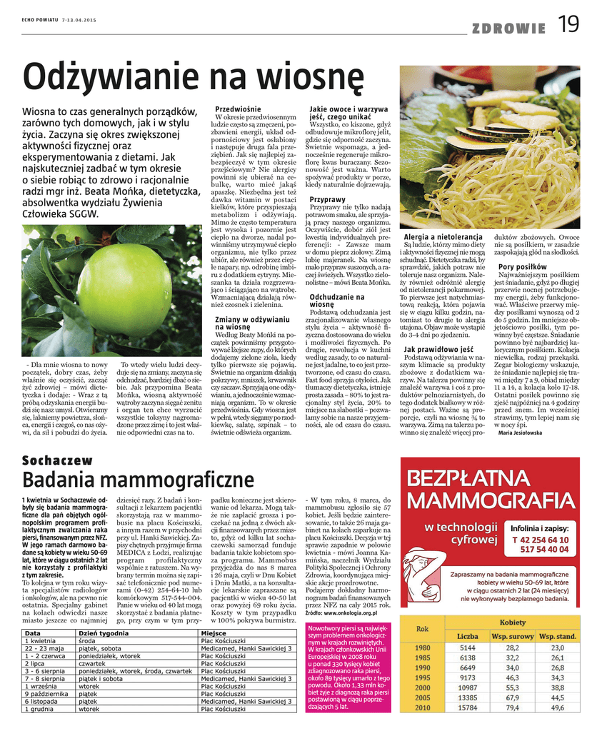 E C H O P O W I AT U 7- 13. 04. 2015 ZDROWIE 19 Odżywianie na wiosnę Wiosna to czas generalnych porządków, zarówno tych domowych, jak i w stylu życia. Zaczyna się okres zwiększonej aktywności fizycznej oraz eksperymentowania z dietami. Jak najskuteczniej zadbać w tym okresie o siebie robiąc to zdrowo i racjonalnie radzi mgr inż. Beata Mońka, dietetyczka, absolwentka wydziału Żywienia Człowieka SGGW. Przedwiośnie W okresie przedwiosennym ludzie często są zmęczeni, pozbawieni energii, układ odpornościowy jest osłabiony i następuje druga fala przeziębień. Jak się najlepiej zabezpieczyć w tym okresie przejściowym? Nie alergicy powinni się ubierać na cebulkę, warto mieć jakąś apaszkę. Niezbędna jest też dawka witamin w postaci kiełków, które przyspieszają metabolizm i odżywiają. Mimo że często temperatura jest wysoka i pozornie jest ciepło na dworze, nadal powinniśmy utrzymywać ciepło organizmu, nie tylko przez ubiór, ale również przez ciepłe napary, np. odrobinę imbiru z dodatkiem cytryny. Mieszanka ta działa rozgrzewająco i ściągająco na wątrobę. Wzmacniającą działają również czosnek i zielenina. Zmiany w odżywianiu na wiosnę - Dla mnie wiosna to nowy początek, dobry czas, żeby właśnie się oczyścić, zacząć żyć zdrowiej – mówi dietetyczka i dodaje: - Wraz z tą próbą odzyskania energii budzi się nasz umysł. Otwieramy się, łakniemy powietrza, słońca, energii i czegoś, co nas ożywi, da sił i pobudzi do życia. To wtedy wielu ludzi decyduje się na zmiany, zaczyna się odchudzać, bardziej dbać o siebie. Jak przypomina Beata Mońka, wiosną aktywność wątroby zaczyna sięgać zenitu i organ ten chce wyrzucić wszystkie toksyny nagromadzone przez zimę i to jest właśnie odpowiedni czas na to. Według Beaty Mońki na początek powinniśmy przygotowywać lżejsze zupy, do których dodajemy zielone zioła, kiedy tylko pierwsze się pojawią. Świetnie na organizm działają pokrzywy, mniszek, krwawnik czy szczaw. Sprzyjają one odżywianiu, a jednocześnie wzmacniają organizm. To w okresie przedwiośnia. Gdy wiosna jest w pełni, wtedy sięgamy po rzodkiewkę, sałatę, szpinak – to świetnie odświeża organizm. Jakie owoce i warzywa jeść, czego unikać Wszystko, co kiszone, gdyż odbudowuje mikroflorę jelit, gdzie się odporność zaczyna. Świetnie wspomaga, a jednocześnie regeneruje mikroflorę kwas buraczany. Sezonowość jest ważna. Warto spożywać produkty w porze, kiedy naturalnie dojrzewają. Przyprawy Przyprawy nie tylko nadają potrawom smaku, ale sprzyjają pracy naszego organizmu. Oczywiście, dobór ziół jest kwestią indywidualnych preferencji: - Zawsze mam w domu pieprz ziołowy. Zimą lubię majeranek. Na wiosnę mało przypraw suszonych, a raczej świeżych. Wszystko zielonolistne – mówi Beata Mońka. Odchudzanie na wiosnę Podstawą odchudzania jest zracjonalizowanie własnego stylu życia – aktywność fizyczna dostosowana do wieku i możliwości fizycznych. Po drugie, rewolucja w kuchni według zasady, to co naturalne jest jadalne, to co jest przetworzone, od czasu do czasu. Fast food sprzyja otyłości. Jak tłumaczy dietetyczka, istnieje prosta zasada – 80% to jest racjonalny styl życia, 20% to miejsce na słabostki – pozwalamy sobie na nasze przyjemności, ale od czasu do czasu. Sochaczew Badania mammograficzne 1 kwietnia w Sochaczewie odbyły się badania mammograficzne dla pań objętych ogólnopolskim programem profilaktycznym zwalczania raka piersi, finansowanym przez NFZ. W jego ramach darmowo badane są kobiety w wieku 50-69 lat, które w ciągu ostatnich 2 lat nie korzystały z profilaktyki z tym zakresie. To kolejna w tym roku wizyta specjalistów radiologów i onkologów, ale na pewno nie ostatnia. Specjalny gabinet na kołach odwiedzi nasze miasto jeszcze co najmniej dziesięć razy. Z badań i konsultacji z lekarzem pacjentki skorzystają raz w mammobusie na placu Kościuszki, a innym razem w przychodni przy ul. Hanki Sawickiej. Zapisy chętnych przyjmuje firma MEDICA z Łodzi, realizując program profilaktyczny wspólnie z ratuszem. Na wybrany termin można się zapisać telefonicznie pod numerami (0-42) 254-64-10 lub komórkowym 517-544-004. Panie w wieku od 40 lat mogą skorzystać z badania płatnego, przy czym w tym przy- padku konieczne jest skierowanie od lekarza. Mogą także nie zapłacić grosza i poczekać na jedną z dwóch akcji finansowanych przez miasto, gdyż od kilku lat sochaczewski samorząd funduje badania także kobietom spoza programu. Mammobus przyjeżdża do nas 8 marca i 26 maja, czyli w Dnu Kobiet i Dniu Matki, a na konsultacje lekarskie zapraszane są pacjentki w wieku 40-50 lat oraz powyżej 69 roku życia. Koszty w tym przypadku w 100% pokrywa burmistrz. - W tym roku, 8 marca, do mammobusu zgłosiło się 57 kobiet. Jeśli będzie zainteresowanie, to także 26 maja gabinet na kołach zaparkuje na placu Kościuszki. Decyzja w tej sprawie zapadnie w połowie kwietnia - mówi Joanna Kamińska, naczelnik Wydziału Polityki Społecznej i Ochrony Zdrowia, koordynująca miejskie akcje prozdrowotne. Podajemy dokładny harmonogram badań finansowanych przez NFZ na cały 2015 rok. Źródło: www.onkologia.org.pl Nowotwory piersi są największym problemem onkologicznym w krajach rozwiniętych. W krajach członkowskich Unii Europejskiej w 2008 roku u ponad 330 tysięcy kobiet zdiagnozowano raka piersi, około 89 tysięcy umarło z tego powodu. Około 1,33 mln kobiet żyje z diagnozą raka piersi postawioną w ciągu poprzedzających 5 lat. Alergia a nietolerancja Są ludzie, którzy mimo diety i aktywności fizycznej nie mogą schudnąć. Dietetyczka radzi, by sprawdzić, jakich potraw nie toleruje nasz organizm. Należy również odróżnić alergię od nietolerancji pokarmowej. To pierwsze jest natychmiastową reakcją, która pojawia się w ciągu kilku godzin, natomiast to drugie to alergia utajona. Objaw może wystąpić d