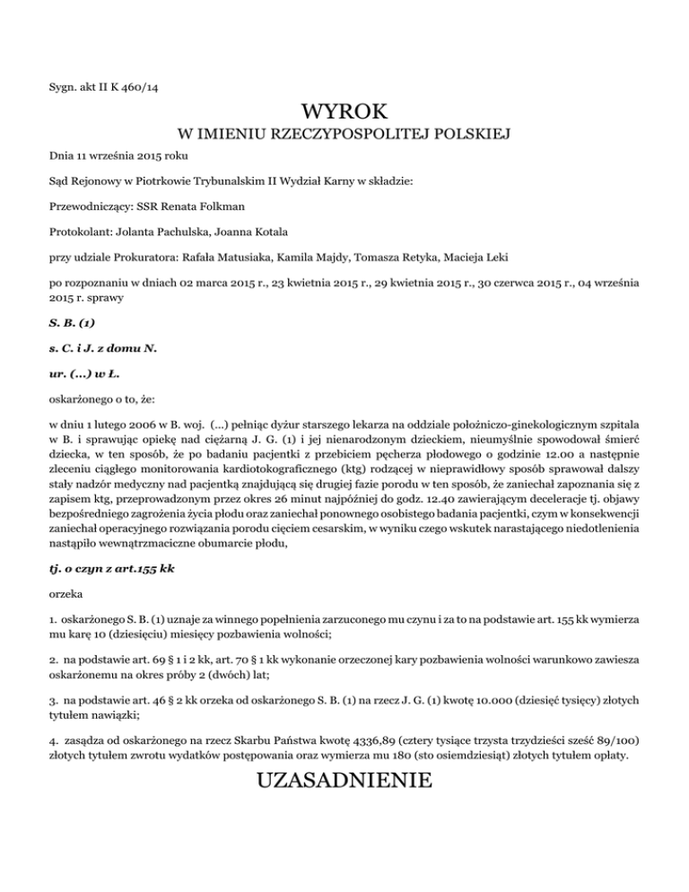 Sygn. akt II K 460/14 WYROK W IMIENIU RZECZYPOSPOLITEJ POLSKIEJ Dnia 11 września 2015 roku Sąd Rejonowy w Piotrkowie Trybunalskim II Wydział Karny w składzie: Przewodniczący: SSR Renata Folkman Protokolant: Jolanta Pachulska, Joanna Kotala przy udziale Prokuratora: Rafała Matusiaka, Kamila Majdy, Tomasza Retyka, Macieja Leki po rozpoznaniu w dniach 02 marca 2015 r., 23 kwietnia 2015 r., 29 kwietnia 2015 r., 30 czerwca 2015 r., 04 września 2015 r. sprawy S. B. (1) s. C. i J. z domu N. ur. (...) w Ł. oskarżonego o to, że: w dniu 1 lutego 2006 w B. woj. (...) pełniąc dyżur starszego lekarza na oddziale położniczo-ginekologicznym szpitala w B. i sprawując opiekę nad ciężarną J. G. (1) i jej nienarodzonym dzieckiem, nieumyślnie spowodował śmierć dziecka, w ten sposób, że po badaniu pacjentki z przebiciem pęcherza płodowego o godzinie 12.00 a następnie zleceniu ciągłego monitorowania kardiotokograficznego (ktg) rodzącej w nieprawidłowy sposób sprawował dalszy stały nadzór medyczny nad pacjentką znajdującą się drugiej fazie porodu w ten sposób, że zaniechał zapoznania się z zapisem ktg, przeprowadzonym przez okres 26 minut najpóźniej do godz. 12.40 zawierającym deceleracje tj. objawy bezpośredniego zagrożenia życia płodu oraz zaniechał ponownego osobistego badania pacjentki, czym w konsekwencji zaniechał operacyjnego rozwiązania porodu cięciem cesarskim, w wyniku czego wskutek narastającego niedotlenienia nastąpiło wewnątrzmaciczne obumarcie płodu, tj. o czyn z art.155 kk orzeka 1. oskarżonego S. B. (1) uznaje za winnego popełnienia zarzuconego mu czynu i za to na podstawie art. 155 kk wymierza mu karę 10 (dziesięciu) miesięcy pozbawienia wolności; 2. na podstawie art. 69 § 1 i 2 kk, art. 70 § 1 kk wykonanie orzeczonej kary pozbawienia wolności warunkowo zawiesza oskarżonemu na okres próby 2 (dwóch) lat; 3. na podstawie art. 46 § 2 kk orzeka od oskarżonego S. B. (1) na rzecz J. G. (1) kwotę 10.000 (dziesięć tysięcy) złotych tytułem nawiązki; 4. zasądza od oskarżonego na rzecz Skarbu Państwa kwotę 4336,89 (cztery tysiące trzysta trzydzieści sześć 89/100) złotych tytułem zwrotu wydatków postępowania oraz wymierza mu 180 (sto osiemdziesiąt) złotych tytułem opłaty. UZASADNIENIE Sąd ustalił stan faktyczny: W dniu 30.01.2006 r. J. G. (1) została skierowana przez lekarza prowadzącego jej ciążę do szpitala i tego samego dnia o godzinie 14.52 trafiła do Szpitala Wojewódzkiego w B. na Oddział Patologii Ciąży, a to wobec faktu, iż termin porodu minął w dniu 21.01.2006 r. (ciąża przeterminowana). Jej stan ogólny przy przyjęciu do szpitala oceniono jako dobry, badania laboratoryjne były w granicach normy. Potwierdzono dobrostan płodu na podstawie badania KTG i testu oksytocynowego. W dniu 01.02.2006 r. podczas rutynowo wykonanej amnioskopii o godzinie 9.45 stwierdzono zielone wody płodowe i przekazano J. G. (1) do sali porodowej celem indukcji porodu. Na sali porodowej obowiązki jej kierownika pełnił wówczas S. B. (1), który był starszym asystentem, lekarzem ginekologiem położnikiem. Do opieki nad J. G. (1) została przydzielona położna K. G.. O godzinie 9.50 J. G. (1) została zbadana - wpis położnej K. G.. Na sali porodowej przebywały wówczas trzy pacjentki; poza J. G. (1) były to M. B. (którą opiekowała się położna I. E. (1)) i A. Ś. (którą opiekowała się położna E. S.). J. G. (1) podano wlew kroplowy z oksytocyną, po czym wyzwoliła się czynność skurczowa macicy. Od godziny 9.48 do godziny 10.30 wykonano u J. G. (1) zapis KTG, który nie wskazał na zagrożenie płodu (czynność serca płodu była w granicach 150/min., prawidłowa oscylacja). Z tym wydrukiem KTG zapoznał się S. B. (1), na dowód czego przystawił swoją pieczątkę w dokumentacji. O godzinie 12.00 S. B. (1) przebił pęcherz płodowy u J. G. (1), po czym odpłynęły zielone wody płodowe. Nakazał wówczas bezzwłoczne podłączenie J. G. (1) do aparatu KTG, co parę minut po godzinie 12.00 (a dokładniej około godziny 12.19) zostało wykonane. Do aparatu KTG J. G. (1) podłączyła położna K. G.. Po podłączeniu aparatu KTG K. G. wyszła z sali porodowej pozostawiając J. G. (1) pod opieką stażystki M. Ś., która faktycznie pozostała przy rodzącej. Na bloku porodowym były inne położne, ale zajmowały się swoimi pacjentkami. O godzinie 12.45 położna I. E. (1) potrzebowała aparatu KTG dla swojej pacjentki M. B.. Nikt nie zapoznał się z zapisem KTG, jaki do tej chwili (od momentu jego podłączenia) wydrukował aparat podłączony J. G. (1) (wydruk był zdecydowanie patologiczny, dawał jednoznaczne wskazanie na bezzwłoczne cesarskie cięcie, gdyż pokazywał niedotlenienie rodzącego się dziecka, a w związku z tym – zgodnie z procedurami – było też kategoryczne przeciwwskazanie do odłączenia aparatu KTG, gdyż przy takim patologicznym zapisie niezbędne było bezwzględne monitorowanie akcji serca rodzącego się dziecka aż do rozwiązania, czyli do momentu jego urodzenia poprzez cesarskie cięcie). Aparat KTG został odłączony od J. G. (1) (przez I. E. (1), która oddarła z aparatu zapis KTG i położyła go na stoliku koło J. G. (1) nie zapoznając się z nim), po czym I. E. (1) zabrała aparat i podłączyła go swojej pacjentce M. B. o godzinie 12.45, po czym zapis u tej pacjentki był kontynuowany przez równą godzinę, to jest do godziny 13.45. Zapis u M. B. nie wykazywał żadnych patologii (co czyniło decyzję o przesunięciu aparatu pomiędzy pacjentkami tym bardziej nieuzasadnioną, mówiąc wprost, aparat KTG był niezbędny do monitorowania akcji serca dziecka J. G. (1) i w konsekwencji ratowania życia jej dziecka, a – jak się okazało, nie był wówczas w analogicznym zakresie niezbędny dla dziecka M. B.). Wówczas na bloku porodowym dostępne były tylko dwa aparaty KTG z ogólnej liczby sześciu sztuk pozostających na stanie, bo