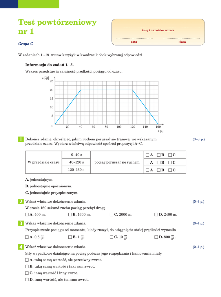 Test powtórzeniowy nr 1 .............................................................................. imię i nazwisko ucznia .................................. data Grupa C .................................. klasa W zadaniach 1.–19. wstaw krzyżyk w kwadracik obok wybranej odpowiedzi. Informacja do zadań 1.–5. Wykres przedstawia zależność prędkości pociągu od czasu. v [m s] 25 20 15 10 5 0 20 40 60 80 100 120 140 160 t [s] 1 Dokończ zdanie, określając, jakim ruchem poruszał się tramwaj we wskazanym (0–3 p.) przedziale czasu. Wybierz właściwą odpowiedź spośród propozycji A–C. 0–40 s W przedziale czasu 40–120 s pociąg poruszał się ruchem 120–160 s A B C A B C A B C A. jednostajnym. B. jednostajnie opóźnionym. C. jednostajnie przyspieszonym. 2 Wskaż właściwe dokończenie zdania. (0–1 p.) W czasie 160 sekund ruchu pociąg przebył drogę A. 400 m. B. 1600 m. C. 2000 m. D. 2400 m. 3 Wskaż właściwe dokończenie zdania. (0–1 p.) Przyspieszenie pociągu od momentu, kiedy ruszył, do osiągnięcia stałej prędkości wynosiło A. 0,5 m . s2 B. 1 m . s2 C. 10 m . s2 D. 800 m . s2 4 Wskaż właściwe dokończenie zdania. Siły wypadkowe działające na pociąg podczas jego rozpędzania i hamowania miały A. taką samą wartość, ale przeciwny zwrot. B. taką samą wartość i taki sam zwrot. C. inną wartość i inny zwrot. D. inną wartość, ale ten sam zwrot. (0–1 p.) 5 Pasażer zareaguje na zmianę prędkości pociągu. Wybierz takie sformułowanie spośród propozycji A–E, aby powstało zdanie prawidłowo wyjaśniające opisaną sytuację. Pasażer siedzący w pociągu podczas jego przyspieszania przechyla się wykazuje D / E i pozostaje w spoczynku. A. do przodu D. bezwładność B. do tyłu E. nieważkość A/ B/ (0–2 p.) C, ponieważ jego ciało C. w bok 6 Trzy pojazdy ruszają z miejsca. Na rysunkach zaznaczono wektory sił wypadkowych działających na te pojazdy. Każdy z nich uzyskał inne przyspieszenie i osiągnął inną energię kinetyczną. I – autobus II – motocykl (0–4 p.) III – samochód Wskaż poprawną odpowiedź i wybierz jej uzasadnienie spośród propozycji A–C. a) Największe przyspieszenie uzyska pojazd I/ II / III, ponieważ A/ B/ C. b) Gdyby pojazdy poruszały się z jednakową prędkością, to największą energię kinetyczną miałby pojazd I / II / III, ponieważ A / B / C. A. stosunek siły wypadkowej do masy pojazdu jest najmniejszy. B. stosunek siły wypadkowej do masy pojazdu jest największy. C. jego masa jest największa. Informacja do zadania 7. i 8. Kamień spada z przyspieszeniem 10 m . s2 Wskaż właściwe dokończenie zdań. 7 W ciągu każdej sekundy ruchu kamień (0–1 p.) A. pokonuje odległość 10 m. B. pokonuje odległość 20 m. C. zwiększa prędkość o 5 m . s D. zwiększa prędkość o 10 m . s 8 Po 3 s ruchu kamień osiągnął prędkość A. 5 m . s B. 25 m . s (0–1 p.) C. 30 m . s D. 50 m . s Informacja do zadań 9. i 10. Wykres zależności drogi od czasu sporządzono dla czterech pojazdów o jednakowej masie. s [km] 120 110 100 90 80 70 60 50 40 30 20 10 0 I II III IV 0 0,5 1,5 1 2 2,5 t [h] 9 Wskaż właściwe dokończenie zdania. (0–1 p.) Pojazdy poruszały się ruchem A. jednostajnym. B. jednostajnie przyspieszonym. C. jednostajnie opóźnionym. D. zmiennym. 10 Oceń prawdziwość poniższych wypowiedzi. (0–4 p.) I. Największą prędkość miał pojazd I. Prawda Fałsz II. Odległość 30 km w najdłuższym czasie pokonał pojazd III. Prawda Fałsz III. Największą energię kinetyczną miał pojazd IV. Prawda Fałsz km IV. Prędkość pojazdu III wynosiła 13 min . Prawda Fałsz 11 Na rysunku pokazano, w jaki sposób kulka zmienia swoje położenie. (0–3 p.) Wybierz takie sformułowanie spośród podanych propozycji, aby powstało zdanie prawidłowo wyjaśniające przedstawioną sytuację. skrajne położenie I II III skrajne położenie położenie równowagi a) Odchylając kulkę z położenia II do III, wykonujemy pracę, kosztem której wzrasta jej energia b) Gdy puścimy kulkę z położenia III, to do położenia II, będzie poruszać się ona ruchem dlatego w położeniu II jej energia kinetyczna będzie F / G. C/ A/ D/ B. E, A. potencjalna ciężkości C. przyspieszonym F. najmniejsza B. kinetyczna D. opóźnionym G. największa E. jednostajnym do 10 km . 12 Prędkość słonia zmniejszyła się z 30 km h h (0–2 p.) Wybierz takie wyrażenie spośród podanych propozycji, aby powstało zdanie prawidłowo wyjaśniające opisaną sytuację. Zmniejszenie prędkości słonia spowodowało A/ B/ C jego energii D/ E. A. trzykrotne zmniejszenie B. trzykrotne zwiększenie C. dziewięciokrotne zmniejszenie D. potencjalnej E. kinetycznej Informacja do zadań 13. i 14. Na lekcji fizyki uczniowie wyznaczali masę monety dwuzłotowej za pomocą dźwigni dwustronnej. W tym celu zmontowali dźwignię i umieścili na niej, po przeciwnych stronach jej osi obrotu, monetę i odważnik tak, że dźwignia znalazła się w równowadze. Następnie linijką zmierzyli odległości ciał od punktu podparcia (patrz rysunek). 7,7 cm 2 cm m1 = 20 g 13 Wskaż właściwe dokończenie zdania. (0–1 p.) Wyznaczona przez uczniów masa monety wynosiła około A. 0,2 g. B. 2,5 g. C. 5,2 g. D. 40 g. 14 Uczniowie zważyli monetę na wadze elektronicznej i okazało się, że jej masa różni się od tej wyznaczonej za pomocą dźwigni. Oceń, czy podana przyczyna miała wpływ na wynik pomiaru. (0–2 p.) I. Pomiar odległości od środka dźwigni do środka monety nie był dokładny. TAK NIE II. Liczba pomiarów odległości była za mała. TAK NIE III. Uczniowie użyli za krótkiej linijki. TAK NIE IV. Waga elektroniczna ma określoną dokładność. TAK NIE 15 Wskaż właściwe dokończenie zdania. Skrzypiące zawiasy w drzwiach należy posmarować olejem lub smarem, ponieważ A. zwiększa on siłę tarcia. B. zmniejsza on siłę nacisku. C. zmniejsza on siłę tarcia. D. zmniejsza on c