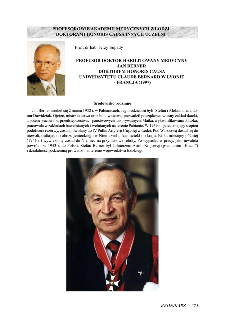 PROFESOROWIE AKADEMII MEDYCZNYCH Z ŁODZI DOKTORAMI HONORIS CAUSA INNYCH UCZELNI Prof. dr hab. Jerzy Supady PROFESOR DOKTOR HABILITOWANY MEDYCYNY JAN BERNER DOKTOREM HONORIS CAUSA UNIWERSYTETU CLAUDE BERNARD W LYONIE - FRANCJA (1997) Środowisko rodzinne Jan Berner urodził się 2 marca 1932 r. w Pabianicach. Jego rodzicami byli: Stefan i Aleksandra, z domu Dawidziak. Ojciec, mistrz tkactwa oraz budownictwa, prowadził początkowo własny zakład tkacki, a potem pracował w przedsiębiorstwach państwowych lub prywatnych. Matka, wykwalifikowana tkaczka, pracowała w zakładach bawełnianych i wełnianych na terenie Pabianic. W 1939 r. ojciec, mający stopień podoficera rezerwy, został powołany do IV Pułku Artylerii Ciężkiej w Łodzi. Pod Warszawą dostał się do niewoli, trafiając do obozu jenieckiego w Niemczech, skąd uciekł do kraju. Kilka miesięcy później (1941 r.) wywieziony został do Niemiec na przymusowe roboty. Po wypadku w pracy, jako inwalida powrócił w 1943 r. do Polski. Stefan Berner był żołnierzem Armii Krajowej (pseudonim „Huzar”) i działalność podziemną prowadził na terenie województwa łódzkiego. KRONIKARZ 275 W okresie okupacji niemieckiej Jan Berner został wraz z matką dwukrotnie wysiedlony. W 1944 roku , w ramach obowiązku pracy dzieci polskich, zatrudnił się w Zakładzie Fryzjerskim Stanisława Latuszkiewicza, gdzie do końca wojny pracował fizycznie. Wykształcenie W 1938 roku rozpoczął naukę w szkole powszechnej w Pabianicach, którą ukończył w 1944 r. na tzw. tajnych kompletach. Równocześnie uczęszczał do szkoły muzycznej, ucząc się gry na skrzypcach pod kierunkiem Mieczysława Kemphnera. W latach 1945-1950 chodził do szkoły średniej, początkowo do Gimnazjum im. Jana Śniadeckiego w Pabianicach, w którym zdał małą maturę, a następnie do Liceum Ogólnokształcącego im. Królowej Jadwigi, gdzie jako uczeń klasy humanistycznej uzyskał świadectwo dojrzałości. W 1950 r., po zdaniu egzaminów wstępnych, został w dodatkowym terminie przyjęty na Wydział Lekarski Uniwersytetu Łódzkiego, który w tymże roku wyodrębniono jako wydział Akademii Medycznej (AM) w Łodzi. W tym czasie ojca – Stefana aresztowano za działalność w Armii Krajowej (AK) i w organizacji „Wolność i Niepodległość” (WIN), ale zwolniono z braku dowodów „winy” po sześciomiesięcznym śledztwie. W 1955 roku J. Berner ukończył studia z dyplomem lekarza. W końcowym etapie nauki na Studium Wojskowym AM odbył sześciotygodniowy obóz wojskowy, a następnie w odstępach kilkuletnich przechodził szkolenie medyczno-wojskowe w Jednostce Wojskowej w Przemyślu oraz uczestniczył w szkoleniach oficerów rezerwy organizowanych przez Wojskową Akademię Medyczną (WAM), uzyskując stopień kapitana (w 2002 r. awansował do stopnia majora). Działalność organizacyjna w okresie szkolnym W roku 1938 J. Berner wstąpił do Związku Harcerstwa Polskiego, w którym aktywnie uczestniczył do chwili jego przekształcenia, tj. do 1948 r. W latach 1945-1948 pełnił funkcję zastępowego, a następnie drużynowego w referacie zuchowym i uzyskał stopień ćwika. W latach 1948-1950 pełnił funkcję łącznika w podziemnej organizacji AK – WIN pod pseudonimem „Zuch”. Od 1947 r. uprawiał wyczynowo sport motorowy, początkowo w Klubie Pabianickiego Towarzystwa Cyklistów (PTC), a następnie w Miejskim Robotniczym Klubie Sportowym „Włókniarz” Pabianice. W 1952 r., reprezentując motocyklistów Okręgu 276 KRONIKARZ Łódzkiego PZM, został wytypowany do wzięcia udziału w Światowym Zjeździe Młodzieży Demokratycznej w Warszawie. Po uzyskaniu licencji zawodnika wyczynowego drugiego stopnia uczestniczył w rajdach, crossach, wyścigach Mistrzostw Okręgu Łódzkiego i Polski oraz pięciokrotnie brał udział w międzynarodowych rajdach tatrzańskich. W tym okresie siedmiokrotnie zdobył tytuł mistrza Okręgu Łódzkiego oraz ponad 50 medali. Praca zawodowa, organizacyjna, naukowa, dydaktyczno-wychowawcza i społeczna W listopadzie 1955 r., po uzyskaniu dyplomu lekarza, przystąpił do pracy jako wolontariusz na Oddziale Chirurgicznym, a od 1 grudnia tegoż roku uzyskał etat na Oddziale Wewnętrznym Szpitala Miejskiego w Pabianicach i rozpoczął specjalizację w zakresie chorób wewnętrznych pod kierunkiem płk dr Franciszka Bianka. Równocześnie, zgodnie z zainteresowaniami, dyżurował na Oddziale Chirurgicznym. W 1958 roku przeszedł na zwolniony etat w Oddziale Chirurgicznym i podjął specjalizację z chirurgii pod kierunkiem dr. Michała Dobulewicza. W tym okresie pracował dodatkowo w miejskiej służbie zdrowia kolejno jako lekarz przemysłowy, rejonowy (5 lat) i sportowy (25 lat) w Poradni Sportowo-Lekarskiej, w której pełnił funkcję kierownika. Pracował także i prowadził przez kilka lat badania lekarskie kierowców w Ośrodku Szkoleniowym Ligi Przyjaciół Żołnierza (LPŻ) w Pabianicach. W tym czasie był zatrudniony również w Miejskiej Poradni Chirurgicznej i Stacji Pogotowia Ratunkowego. Ponadto okresowo pełnił funkcję kierownika Punktu Krwiodawstwa we wspomnianym wyżej pabianickim szpitalu. W 1960 roku uzyskał specjalizację I stopnia w zakresie chirurgii i rozpoczął w Pabianicach specjalizację II stopnia, początkowo pod kierunkiem dr. M. Dobulewicza, a następnie dr. Jerzego Kasperskiego. W 1962 roku otrzymał stypendium doktoranckie Ministerstwa Zdrowia w zakresie chirurgii w III Klinice Chirurgicznej Akademii Medycznej w Łodzi, kierowanej przez prof. Andrzeja Alichniewicza, umożliwiające ambitnemu lekarzowi przygotowanie rozprawy doktorskiej oraz uzyskanie specjalizacji w zakresie chirurgii, ze szczególnym uwzględnieniem chirurgii przewodu pokarmowego, chirurgii naczyniowej, nowotworów, a także balneoterapii w chorobach naczyń. Od 1964 roku, po zakończeniu stypendium doktoranckiego, Jan Berner pracował w III Klinice Chirurgicznej łódzkiej AM kolejno jako starszy asystent,