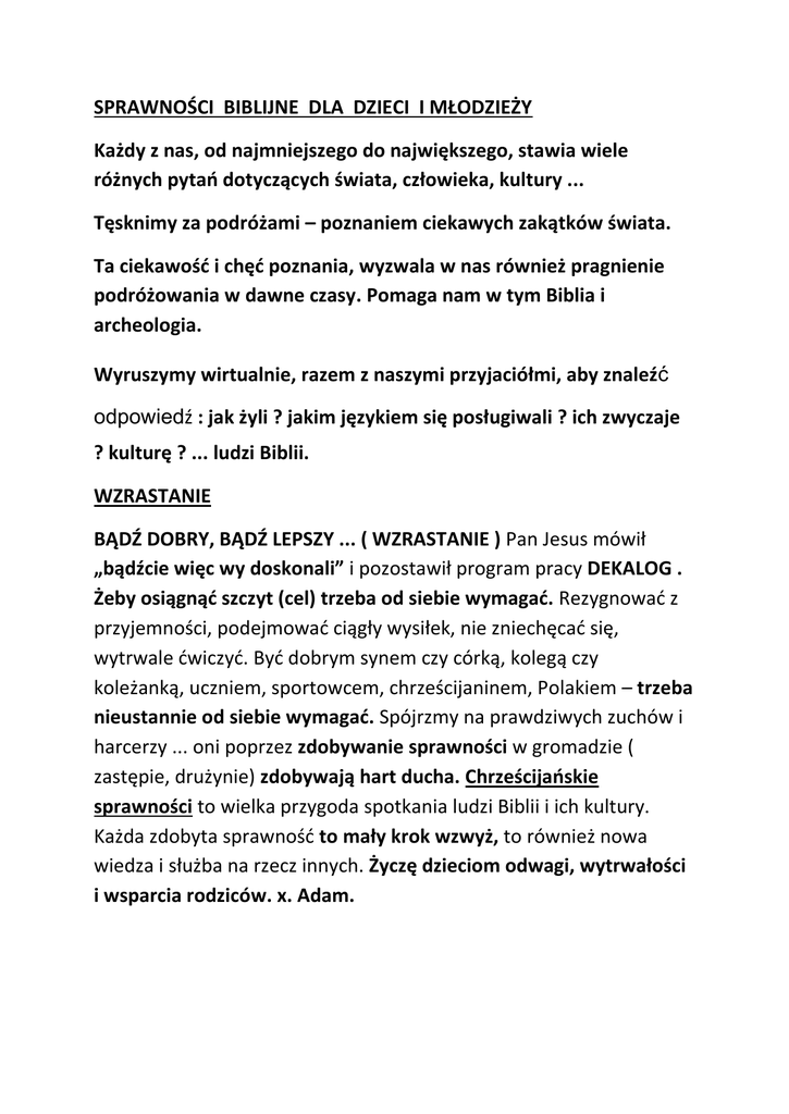 SPRAWNOŚCI BIBLIJNE DLA DZIECI I MŁODZIEŻY Każdy z nas, od najmniejszego do największego, stawia wiele różnych pytao dotyczących świata, człowieka, kultury ... Tęsknimy za podróżami – poznaniem ciekawych zakątków świata. Ta ciekawośd i chęd poznania, wyzwala w nas również pragnienie podróżowania w dawne czasy. Pomaga nam w tym Biblia i archeologia. Wyruszymy wirtualnie, razem z naszymi przyjaciółmi, aby znaleźć odpowiedź : jak żyli ? jakim językiem się posługiwali ? ich zwyczaje ? kulturę ? ... ludzi Biblii. WZRASTANIE BĄDŹ DOBRY, BĄDŹ LEPSZY ... ( WZRASTANIE ) Pan Jesus mówił „bądźcie więc wy doskonali” i pozostawił program pracy DEKALOG . Żeby osiągnąd szczyt (cel) trzeba od siebie wymagad. Rezygnowad z przyjemności, podejmowad ciągły wysiłek, nie zniechęcad się, wytrwale dwiczyd. Byd dobrym synem czy córką, kolegą czy koleżanką, uczniem, sportowcem, chrześcijaninem, Polakiem – trzeba nieustannie od siebie wymagad. Spójrzmy na prawdziwych zuchów i harcerzy ... oni poprzez zdobywanie sprawności w gromadzie ( zastępie, drużynie) zdobywają hart ducha. Chrześcijaoskie sprawności to wielka przygoda spotkania ludzi Biblii i ich kultury. Każda zdobyta sprawnośd to mały krok wzwyż, to również nowa wiedza i służba na rzecz innych. Życzę dzieciom odwagi, wytrwałości i wsparcia rodziców. x. Adam. I. HEBRAJKA ( HEBRAJCZYK ) Opowiadanie. Dominik przyniósł ze szkolnej biblioteki niedużą książeczkę i z zaciekawieniem zaczął ją przeglądad. Spośród wielu biało-czarnych obrazków przedstawiających codzienne życie dzieci i dorosłych w Izraelu, napotkał flagę Izraela koloru niebiesko-białego z gwiazdą Dawida. Każdy kraj ma swoją flagę, również i Polska – włączyła się do rozmowy Agatka. Polska, Polacy, naród, język, ziemia, praca ... kiedyś musiał byd początek ? Wszystko musi mied swój początek ... 100 ... 1000... 2000 lat a może i więcej - zastanawia się Dominik. Polacy – Polanie, a Żydzi ? Izraelczycy a może Hebrajczycy - dodaje Agatka . Jestem ciekawy, od kiedy Żydów nazywano Hebrajczykami – pytał głośno Dominik ? Początków tej nazwy trzeba szukad w Biblii (Stary Testament) w XVIII w. (1800 lat przed Chrystusem), kiedy to określenie „Hebrajczyk” zostało po raz pierwszy użyte w odniesieniu do Abrahama włączył się tata, przysłuchując się uważnie rozmowie Agatki i Dominika. Często jest tak w Biblii, że słowo hebrajskie ma jakieś znaczenie. Jestem ciekawy, dlaczego użyto takiego określenia do Abrahama i co oznacza słowo „Hebrajczyk” – zapytał trochę z ciszonym głosem Dominik. Tak jak nazwa „Polan” pochodzi najprawdopodobniej od rolniczego charakteru ich gospodarki (pole), tak „Hebrajczyk” w odniesieniu do Abrahama oznaczało „przejście przez rzekę Eufrat na polecenie Boga” lub „podróżnicy”, „przechodnie”, gdy Izraelici jeszcze wędrowali do ziemi Kanaan – wyjaśnił tata. Dominik i ja jesteśmy ciekawi początków naszej wiary. Wiele rzeczy nie rozumiemy, ale cieszymy się, że mamy kochanych rodziców, którzy pomogą nam odkryd wspaniały świat Pisma Świętego Starego Testamentu – dodała Agatka. Biblia mówi, że „Hebrajczycy” to plemię (lud semicki) złożony z 12 plemion. Hebrajczycy nazywali siebie Izraelitami tj. potomkami Izraela (takie imię nadał Jakubowi Bóg). Jakub (Izrael) był jednym z trzech patriarchów (Abraham, Izaak, Jakub) czyli założycieli. Posługiwali się językiem hebrajskim. Przodkowie Żydów nazwani byli także „Ludem Bożym”. ** Dominik wdrapał się na krzesło i z górnej półki regału „ściągnął” atlas świata. Marzył, gdy będę dorosły, to wyruszę na inne kontynenty, aby poznad nowych ludzi i ich wspaniałą kulturę. Poszukaj mapę, gdzie dzisiaj żyją potomkowie Abrahama, Jakuba, Mojżesza – poprosiła Agatka brata. Dominik szybko odnalazł stronę 14, która przedstawia mapę, gdzie żyją dzisiaj potomkowie trzech wielkich patriarchów. (18) Wtedy to właśnie Pan zawarł przymierze z Abramem, mówiąc: Potomstwu twemu daję ten kraj, od Rzeki Egipskiej aż do rzeki wielkiej, rzeki Eufrat, (19) wraz z Kenitami, Kenizytami, Kadmonitami, (20) Chetytami, Peryzzytami, Refaitami, (21) Amorytami, Kananejczykami, Girgaszytami i Jebusytami. Księga Rodzaju 15,18-21 mówi o "Granicach Kraju" traktowanych jako całośd obszaru obiecanego Abrahamowi. Były to lata 1800-1750 przed Chrystusem. Warto wiedzied, że początki Polan to IX-X wieku. Na ziemiach polskich istniało kilka plemion zajmujących określone terytorium, spośród których największe znaczenie osiągnęli Wiślanie wokół Krakowa i Polanie wokół Gniezna. Ekspansja Polan doprowadziła do zjednoczenia (nie zawsze pokojowego) w IX/X wieku większości plemion zamieszkujących te ziemie i stworzenia państwa pod dziedziczną władzą Piastów. Abraham zawarł przymierze (układ) z Bogiem, a książę Mieszko I przyjął chrzest wraz z całym swoim dworem. To jest początek naszej wiary – uzupełnił tata. Abraham, był człowiekiem zamożnym. Miał bardzo dużo owiec i szerokie pastwiska. Prowadził życie koczownicze, to znaczy przemieszczał się z całym dobytkiem tam, gdzie była lepsza trawa(pasza). Taki stan Hebrajczyków trwał do Jakuba (Izrael). Wówczas Hebrajczyków nazywano Izraelczykami. *** W czasie wakacji byliśmy w pięknych górach Tatrach – wspomina Agatka. Najbardziej podobały mi się piękne górskie kwiaty i rwące potoki. A ja – odezwał się Dominik – podziwiałem, już nieliczne, stada owiec, które wypasały się w dolinach. Górale też, jak Abraham, prowadzą koczowniczy tryb życia, przemieszczając się na obfitsze pastwiska, szukając lepszej trawy i strumieni wody – dodał tata. Ciekawe musiało byd życie Abrahama – Pasterza – stwierdziła Agatka ! Nie wiem, czy ciągle byś chciała byd na „walizkach” i nie mied stałego zamieszkania 