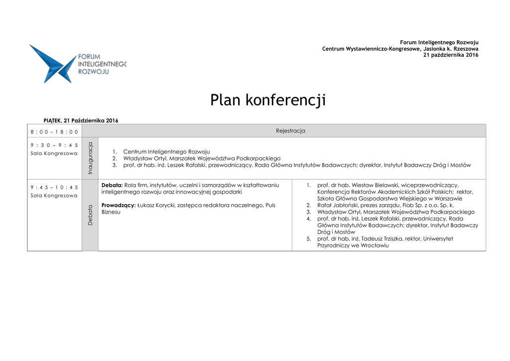 Forum Inteligentnego Rozwoju Centrum Wystawienniczo-Kongresowe, Jasionka k. Rzeszowa 21 października 2016 Plan konferencji PIĄTEK, 21 Października 2016 Rejestracja 9 : 3 0 – 9 : 4 5 Sala Kongresow a Inauguracja 8 : 0 0 – 1 8 : 0 0 9 : 4 5 – 1 0 : 4 5 Debata Sala Kongresow a 1. 2. 3. Centrum Inteligentnego Rozwoju Władysław Ortyl, Marszałek Województwa Podkarpackiego prof. dr hab. inż. Leszek Rafalski, przewodniczący, Rada Główna Instytutów Badawczych; dyrektor, Instytut Badawczy Dróg i Mostów Debata: Rola firm, instytutów, uczelni i samorządów w kształtowaniu inteligentnego rozwoju oraz innowacyjnej gospodarki 1. Prowadzący: Łukasz Korycki, zastępca redaktora naczelnego, Puls Biznesu 2. 3. 4. 5. prof. dr hab. Wiesław Bielawski, wiceprzewodniczący, Konferencja Rektorów Akademickich Szkół Polskich; rektor, Szkoła Główna Gospodarstwa Wiejskiego w Warszawie Rafał Jabłoński, prezes zarządu, Fiab Sp. z o.o. Sp. k. Władysław Ortyl, Marszałek Województwa Podkarpackiego prof. dr hab. inż. Leszek Rafalski, przewodniczący, Rada Główna Instytutów Badawczych; dyrektor, Instytut Badawczy Dróg i Mostów prof. dr hab. inż. Tadeusz Trziszka, rektor, Uniwersytet Przyrodniczy we Wrocławiu 1. 1 1 : 0 0 – 1 2 : 1 5 Plan dla Polski - inteligentny rozwój, innowacyjna gospodarka - Sesja plenarna Sala Kongresow a Tomasz Burczyński, zastępca dyrektora, Departament Programów Europejskich, Bank Gospodarstwa Krajowego 2. dr hab. Marek Cegielski, wiceprezes zarządu, Stem Cells Spin S.A. 3. Michał Filipek, prezes zarządu, Profit Network Sp. z o.o. 4. mgr Janusz Gaca, dyrektor, Dział Innowacji, Wdrożeń i Komercjalizacji, Uniwersytet Przyrodniczy we Wrocławiu 5. Rafał Jabłoński, prezes zarządu, Fiab Sp. z o.o. Sp. k. 6. Paweł Kurzyński, starszy specjalista, Narodowe Centrum, Badań i Rozwoju 7. Tomasz Nasiłowski, prezes zarządu, Inphotech Sp. z o.o. 8. prof. dr hab. dr h. c. Józef Nicpoń, dyrektor, Centrum Diagnostyki Eksperymentalnej i Innowacyjnych Technologii Biomedycznych, Uniwersytet Przyrodniczy we Wrocławiu 9. prof. dr hab. inż. Tadeusz Trziszka, rektor, Uniwersytet Przyrodniczy we Wrocławiu 10. Paulina Zadura-Lichota, dyrektor, Departament Analiz i Strategii, Polska Agencja Rozwoju Przedsiębiorczości Przerwa kawowa 1 2 : 1 5 – 1 2 : 3 0 Bezpieczeństwo energetyczne 1 2 : 3 0 – 1 3 : 5 0 Sala Diamentowa Podniesienie konkurencyjności polskiej gospodarki – receptą programy Polskiej Agencji Rozwoju Przedsiębiorczości oraz Narodowego Centrum Badań i Rozwoju Kredyt na innowacje technologiczne Program Operacyjny Inteligentny Rozwój - wsparcie dla innowacyjnych przedsiębiorców sektora MŚP Współpraca małych i średnich przedsiębiorstw z uczelniami i jednostkami badawczymi Przykłady najnowszych innowacji technologicznych w Polsce Wsparcie wdrożeń wyników prac B+R Komercjalizacja innowacyjnych rozwiązań polskich firm na rynkach światowych i krajowych Kreatywny rozwój gospodarczy Zmniejszenie emisyjności polskiej gospodarki Inwestycje w OZE Oś priorytetowa III RPO WP 2014-2020 Czysta energia – beneficjenci, grupy docelowe, obszary realizacji Zaawansowane technologie pozyskiwania energii Wykorzystanie ciepła odpadowego z procesów przemysłowych 1. 2. 3. 4. 5. 6. 7. 8. Adam Bojarczuk, dyrektor zespołu inwestycji, Cemex Polska Sp. z o.o. dr inż. Ewa Głodek-Bucyk, Instytut Ceramiki i Materiałów Budowlanych w Opolu prof. dr hab. inż. Piotr Kacejko, rektor, Politechnika Lubelska Janusz Krasucki, wiceprezes zarządu, CIM-mes Projekt Sp. z o.o. Wojciech Magnowski, Dyrektor Departamentu Zarządzania RPO, Urząd Marszałkowski Województwa Podkarpackiego Bolesław Mostowski, koordynator projektu, Procesy Inwestycyjne Sp. z o.o. Sławomir Najdyhor, dyrektor ds. technicznych, Lubelski Dom Efektywny Energetycznie Sp. z o.o. prof. nzw. dr hab. inż. Anatolij Płatonow, Politechnika Warszawska 1 2 : 3 0 – 1 3 : 5 0 Sala konferencyjna Szkolnictwo wyższe i nauka 2015-2030 Sala Perłowa Strategia rozwoju branży kosmicznej 1 2 : 3 0 – 1 3 : 5 0 1 2 : 3 0 – 1 3 : 5 0 Plan dla transportu kolejowego Sala Szmaragdowa Rola prywatnego sektora w branży kosmicznej oraz przyszłość polskiego sektora kosmicznego Związek nauki z kosmosem Możliwości rozwoju branży kosmicznej w Polsce Perspektywa unijna 2014-2020 szansą na nowe inwestycje w sektorze kosmicznym Współpraca w obszarze technologii kosmicznych i satelitarnych 1. 2. 3. 4. 5. 6. 7. Dostosowanie szkolnictwa wyższego do trendów na rynku pracy Polska w Europejskim Obszarze Szkolnictwa Wyższego Szkolnictwo wyższe dla gospodarki – Program Operacyjny Wiedza Edukacja Rozwój 2014-2020 Efektywna współpraca nauki z biznesem – jak ją osiągnąć? Najlepsze praktyki w zarządzaniu uczelnią - rektor= dobry menedżer 1. 2. 3. 4. 5. 6. 7. Główne wyzwania dla Polskich Kolei w XXI wieku Kolizje pociągów ze zwierzętami - przyczyny, skutki, zapobieganie Innowacje a bezpieczeństwo Projekty unijne szansą dla rozwoju kolei w Polsce Innowacje w kolejnictwie 1. 2. 3. 4. 5. 6. Andrzej Banasiak, dyrektor generalny, Thales Polska Sp. z o.o. prof. dr hab. Katarzyna Dąbrowska-Zielińska, kierownik, Centrum Teledetekcji, Instytut Geodezji i Kartografii Sebastian Meszyński, prezes zarządu, ABM Space Sp. z o.o. dr Piotr Orleański, zastępca dyrektora ds. rozwoju technologii, Centrum Badań Kosmicznych Polskiej Akademii Nauk dr Jacek Szczepaniak, wiceprezes zarządu, Narodowa Agencja Promocji Zaawansowanych Technologii S.A. Zbigniew Trzaskowski, prezes zarządu, Hertz System LTD Sp. z o.o. Paweł Wojtkiewicz, prezes zarządu, Związek Pracodawców Sektora Kosmicznego; GMV Innovating Solutions Sp. z o.o. dr Marzena Feldy, kierownik, Laboratorium Analiz Statystycznych i Ewaluacji, Ośrodek Przetwarzania Informacji Państwowy Instytut Badawczy prof. dr hab. Marek Koziorowski, Prorektor ds. Nauki i Współpracy z Zagranicą, Dziekan Zamiejscowego Wydziału Biotechnologii Uni