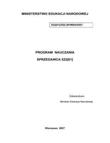 MINISTERSTWO EDUKACJI NARODOWEJ 522[01]/ZSZ,SP/MEN/2007. PROGRAM NAUCZANIA SPRZEDAWCA 522[01] Zatwierdzam Minister Edukacji Narodowej Warszawa 2007 0 Autorzy: mgr Małgorzata Maria Bączak mgr Teresa Bogusławska mgr Ewa Szymańska Recenzenci: mgr Maria Gaertner dr inż. Justyna Górna Opracowanie redakcyjne: mgr Małgorzata Cencelewicz 1 Spis treści I. Plany nauczania ......................................................................... 3 II. Programy nauczania przedmiotów zawodowych .................... 5 1. Towaroznawstwo ................................................................... 2. Organizacja sprzedaży .......................................................... 11 3. Sprzedaż towarów ................................................................. 20 4. Podstawy działalności handlowej .......................................... 28 5. Zajęcia praktyczne ................................................................ 35 6. Praktyka zawodowa .............................................................. 41 2 5 I. PLANY NAUCZANIA PLAN NAUCZANIA Zasadnicza szkoła zawodowa Zawód: sprzedawca 522[01] Podbudowa programowa: gimnazjum Lp. Przedmioty nauczania Dla młodzieży Liczba godzin tygodniowo w dwuletnim okresie nauczania Klasy I-II 1. 2. 3. 4. 5. Towaroznawstwo Organizacja sprzedaży Sprzedaż towarów Podstawy działalności handlowej Zajęcia praktyczne Razem 4 4 4 2 20 34 3 Dla dorosłych Liczba Liczba godzin godzin tygodniowo w dwuletnim w dwuletnim okresie okresie nauczania nauczania Semestry I-IV Forma Forma stacjonarna zaoczna 3 55 3 55 3 55 2 28 15 275 26 468 PLAN NAUCZANIA Szkoła policealna Zawód: sprzedawca 522[01] Podbudowa programowa: szkoła dająca wykształcenie średnie Dla młodzieży Liczba godzin tygodniowo w dwuletnim okresie nauczania Dla dorosłych Liczba Liczba godzin godzin tygodniowo w dwuletnim w dwuletnim okresie Lp. Przedmioty nauczania nauczania okresie nauczania Semestry I-II Semestry I-II Forma Forma stacjonarna zaoczna 1. Towaroznawstwo 3 2 41 2. Organizacja sprzedaży 3 2 41 3. Sprzedaż towarów 3 2 41 4. Podstawy działalności handlowej 1 1 21 5. Zajęcia praktyczne 15 11 197 Razem 25 18 341 Praktyka zawodowa: 2 tygodnie 4 II. PROGRAMY NAUCZANIA PRZEDMIOTÓW ZAWODOWYCH TOWAROZNAWSTWO Szczegółowe cele kształcenia W wyniku procesu kształcenia uczeń (słuchacz) powinien umieć: – posłużyć się terminologią z zakresu towaroznawstwa, – dokonać podziału towarów na grupy asortymentowe, – określić właściwości towarów oraz ich przeznaczenie, – określić zasady badania jakości towarów, – określić zasady jakościowego odbioru towarów, – scharakteryzować rodzaje opakowań oraz określić ich funkcje, – odczytać oznakowania oraz informacje zamieszczone na towarach, opakowaniach i etykietach, – scharakteryzować grupy artykułów żywnościowych, – wykonać badania artykułów żywnościowych, – określić składniki oraz odżywczą i kaloryczną wartość artykułów żywnościowych, – zinterpretować przepisy prawa dotyczące bezpieczeństwa zdrowotnego żywności, – scharakteryzować grupy artykułów nieżywnościowych, – wykonać badania artykułów nieżywnościowych, – określić zasady przechowywania i magazynowania towarów, – określić zasady ochrony towarów podczas transportu, – posłużyć się normami dotyczącymi oceny jakości, sposobu przechowywania i transportu towarów, – skorzystać z różnych źródeł informacji oraz doradztwa specjalistycznego. Materiał nauczania 1. Podstawy towaroznawstwa Kryteria podziału towarów Polska Klasyfikacja Wyrobów i Usług (PKWiU). Normalizacja i jej znaczenie. Właściwości towarów, czynniki wpływające na ich jakość. Zasady badania i odbioru jakościowego towarów. Funkcje opakowań. Klasyfikacja opakowań. Normalizacja opakowań. Pojemniki wielofunkcyjne. Systemy paletowe. Oznakowanie towarów, znaki towarowe. Przechowywanie i magazynowanie towarów. Czynniki wpływające na jakość przechowywanych towarów. Zmiany 5 zachodzące w przechowywanych towarach. Szkodniki magazynowe. Ubytki towarowe. Ochrona towarów podczas transportu. Przedłużanie trwałości towarów. Ćwiczenia: • Klasyfikowanie towarów według różnych kryteriów. • Charakteryzowanie struktury PKWiU. • Określanie właściwości towarów. • Określanie czynników wpływających na jakość towarów. • Przeprowadzanie organoleptycznych badań towarów. • Dokonywanie oceny jakości towarów na podstawie norm. • Klasyfikowanie opakowań według różnych kryteriów. • Odczytywanie oznakowań oraz interpretowanie informacji zamieszczonych na towarach, opakowaniach i etykietach. • Określanie warunków przechowywania towarów. • Odczytywanie informacji o warunkach i okresie przechowywania towarów. • Określanie zmian zachodzących w przechowywanych towarach. • Identyfikowanie szkodników magazynowych. • Określanie wpływu metod konserwacji na właściwości towarów. • Rozróżnianie ubytków towarowych. • Dobieranie środków i sposobów ochrony towarów podczas transportu. 2. Artykuły żywnościowe Normy żywienia. Składniki odżywcze. Wartość kaloryczna artykułów żywnościowych. Klasyfikacja żywności. Dodatki do żywności. Produkty zbożowe. Mleko i jego przetwory. Mięso, produkty mięsne. Dziczyzna. Drób, przetwory drobiowe. Ocena świeżości mięsa, kontrola sanitarna. Ryby, przetwory rybne. Owoce morza. Oleje roślinne. Tłuszcze roślinne utwardzane. Jaja. Warzywa i przetwory z warzyw. Owoce i przetwory z owoców. Grzyby i przetwory z grzybów. Cukier, wyroby cukiernicze. Miód. Koncentraty spożywcze. Napoje bezalkoholowe. Woda mineralna. Napoje alkoholowe. Wpływ alkoholu na organizm człowieka. Przyprawy i używki. Bezpieczeństwo zdrowotne żywności. Ćwiczenia: • Opracowywanie przykładowego jadłospisu, zgodnie z normami żywienia. • Charakteryzowanie głównych składników odżywczych i