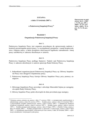 ©Kancelaria Sejmu s. 1/50 USTAWA Opracowano na podstawie: Dz.U. z 2007 r. Nr 89, poz. 589, z 2008 r. Nr 237, poz. 1656, z 2009 r. Nr 6, poz. 33, Nr 20, poz. 106. z dnia 13 kwietnia 2007 r. o Państwowej Inspekcji Pracy1) Rozdział 1 Organizacja Państwowej Inspekcji Pracy Art. 1. Państwowa Inspekcja Pracy jest organem powołanym do sprawowania nadzoru i kontroli przestrzegania prawa pracy, w szczególności przepisów i zasad bezpieczeństwa i higieny pracy, a także przepisów dotyczących legalności zatrudnienia i innej pracy zarobkowej w zakresie określonym w ustawie. Art. 2. Państwowa Inspekcja Pracy podlega Sejmowi. Nadzór nad Państwową Inspekcją Pracy w zakresie określonym w ustawie sprawuje Rada Ochrony Pracy. Art. 3. 1. Jednostkami organizacyjnymi Państwowej Inspekcji Pracy są: Główny Inspektorat Pracy oraz okręgowe inspektoraty pracy. 2. Państwową Inspekcją Pracy kieruje Główny Inspektor Pracy przy pomocy zastępców. Art. 4. 1. Głównego Inspektora Pracy powołuje i odwołuje Marszałek Sejmu po zasięgnięciu opinii Rady Ochrony Pracy. 2. Główny Inspektor Pracy pełni obowiązki do dnia powołania jego następcy. 1) Niniejszą ustawą zmienia się ustawę z dnia 17 czerwca 1966 r. o postępowaniu egzekucyjnym w administracji, ustawę z dnia 26 czerwca 1974 r. – Kodeks pracy, ustawę z dnia 16 września 1982 r. o pracownikach urzędów państwowych, ustawę z dnia 4 marca 1994 r. o zakładowym funduszu świadczeń socjalnych, ustawę z dnia 6 czerwca 1997 r. – Kodeks karny, ustawę z dnia 6 czerwca 1997 r. – Kodeks postępowania karnego, ustawę z dnia 24 lipca 1999 r. o Służbie Celnej, ustawę z dnia 24 sierpnia 2001 r. – Kodeks postępowania w sprawach o wykroczenia, ustawę z dnia 9 lipca 2003 r. o zatrudnianiu pracowników tymczasowych oraz ustawę z dnia 20 kwietnia 2004 r. o promocji zatrudnienia i instytucjach rynku pracy. 2009-02-23 ©Kancelaria Sejmu s. 2/50 3. Zastępców Głównego Inspektora Pracy powołuje i odwołuje Marszałek Sejmu, na wniosek Głównego Inspektora Pracy. Art. 5. 1. Okręgowy inspektorat pracy obejmuje zakresem swojej właściwości terytorialnej obszar jednego lub więcej województw. W okręgowych inspektoratach pracy mogą być tworzone oddziały. 2. Okręgowym inspektoratem pracy kieruje okręgowy inspektor pracy przy pomocy zastępców. 3. Okręgowych inspektorów pracy oraz ich zastępców powołuje i odwołuje Główny Inspektor Pracy. Art. 6. 1. Marszałek Sejmu na wniosek Głównego Inspektora Pracy ustali, w drodze zarządzenia: 1) statut Państwowej Inspekcji Pracy, określający jej organizację wewnętrzną; 2) siedziby i zakres terytorialnej właściwości okręgowych inspektoratów pracy. 2. Zarządzenia Marszałka Sejmu w sprawach, o których mowa w ust. 1, podlegają ogłoszeniu w Dzienniku Urzędowym Rzeczypospolitej Polskiej „Monitor Polski”. Art. 7. 1. Powołuje się Radę Ochrony Pracy, zwaną dalej „Radą”, jako organ nadzoru w sprawach dotyczących przestrzegania prawa pracy, w tym bezpieczeństwa i higieny pracy, a także legalności zatrudnienia oraz działalności Państwowej Inspekcji Pracy. 2. W skład Rady wchodzi 30 członków, w tym przewodniczący, zastępcy przewodniczącego, sekretarz i członkowie, których powołuje i odwołuje Marszałek Sejmu. Kadencja Rady trwa cztery lata. 3. Członkowie Rady pełnią obowiązki do dnia powołania nowych członków. 4. Członków Rady powołuje się spośród posłów, senatorów i kandydatów zgłoszonych przez Prezesa Rady Ministrów oraz przez organizacje związkowe i organizacje pracodawców reprezentatywne w rozumieniu ustawy z dnia 6 lipca 2001 r. o Trójstronnej Komisji do Spraw Społeczno-Gospodarczych i wojewódzkich komisjach dialogu społecznego (Dz.U. Nr 100, poz. 1080 z późn. zm.2)), a także przez inne organizacje społeczne zajmujące się problematyką ochrony pracy. Do Rady powołuje się także ekspertów i przedstawicieli nauki. 5. W skład Rady nie można powołać pracownika Państwowej Inspekcji Pracy, chyba że korzysta on z urlopu bezpłatnego udzielonego w celu wykonywania funkcji z wyboru. 2) Zmiany tekstu wymienionej ustawy zostały ogłoszone w Dz.U. z 2001 r. Nr 154, poz. 1793 i 1800, z 2002 r. Nr 10, poz. 89 i Nr 240, poz. 2056 oraz z 2004 r. Nr 240, poz. 2407. 2009-02-23 ©Kancelaria Sejmu s. 3/50 6. Zasady reprezentacji w Radzie oraz wysokość diety członków Rady za udział w jej pracach określa Marszałek Sejmu w drodze zarządzenia. 7. Do zadań Rady należy wyrażanie stanowiska w sprawach z zakresu działania Państwowej Inspekcji Pracy, w szczególności dotyczących: 1) programów działalności i zadań Państwowej Inspekcji Pracy; 2) okresowych ocen działalności Państwowej Inspekcji Pracy oraz wniosków wynikających z tych ocen; 3) problemów ochrony pracy o zasięgu ogólnokrajowym. 8. Rada wyraża opinię o kandydatach na stanowiska Głównego Inspektora Pracy i jego zastępców oraz okręgowych inspektorów pracy. 9. Rada działa na podstawie uchwalonego przez siebie regulaminu, zatwierdzonego przez Marszałka Sejmu. Art. 8. 1. Państwowa Inspekcja Pracy prowadzi placówkę szkoleniową Ośrodek Szkolenia Państwowej Inspekcji Pracy im. Profesora Jana Rosnera we Wrocławiu, zwaną dalej „Ośrodkiem”. 2. Do zadań Ośrodka należy szkolenie i doskonalenie kadr Państwowej Inspekcji Pracy oraz upowszechnianie wiedzy i informacji, a także doradztwo w zakresie ochrony pracy. 3. Główny Inspektor Pracy nadaje Ośrodkowi statut oraz, na wniosek dyrektora Ośrodka, określa jego szczegółową organizację wewnętrzną. Art. 9. 1. Główny Inspektor Pracy nadaje uprawnienia rzeczoznawcy do spraw bezpieczeństwa i higieny pracy na wniosek Komisji Kwalifikacyjnej do Oceny Kandydatów na Rzeczoznawców, zwanej dalej „Komisją”, oraz prowadzi centralny rejestr wydanych uprawnień. 2. Uprawnienia rzeczoznawcy do spraw bezpieczeństwa i higieny pracy, zwanego dalej „rzeczoznawcą