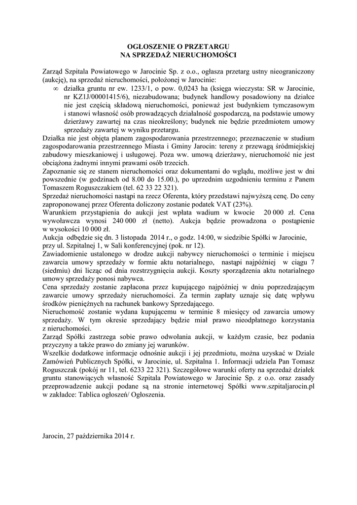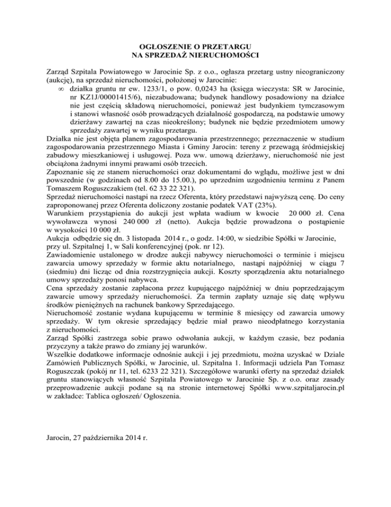 OGŁOSZENIE O PRZETARGU NA SPRZEDAŻ NIERUCHOMOŚCI Zarząd Szpitala Powiatowego w Jarocinie Sp. z o.o., ogłasza przetarg ustny nieograniczony (aukcję), na sprzedaż nieruchomości, położonej w Jarocinie: • działka gruntu nr ew. 1233/1, o pow. 0,0243 ha (księga wieczysta: SR w Jarocinie, nr KZ1J/00001415/6), niezabudowana; budynek handlowy posadowiony na działce nie jest częścią składową nieruchomości, ponieważ jest budynkiem tymczasowym i stanowi własność osób prowadzących działalność gospodarczą, na podstawie umowy dzierżawy zawartej na czas nieokreślony; budynek nie będzie przedmiotem umowy sprzedaży zawartej w wyniku przetargu. Działka nie jest objęta planem zagospodarowania przestrzennego; przeznaczenie w studium zagospodarowania przestrzennego Miasta i Gminy Jarocin: tereny z przewagą śródmiejskiej zabudowy mieszkaniowej i usługowej. Poza ww. umową dzierżawy, nieruchomość nie jest obciążona żadnymi innymi prawami osób trzecich. Zapoznanie się ze stanem nieruchomości oraz dokumentami do wglądu, możliwe jest w dni powszednie (w godzinach od 8.00 do 15.00.), po uprzednim uzgodnieniu terminu z Panem Tomaszem Roguszczakiem (tel. 62 33 22 321). Sprzedaż nieruchomości nastąpi na rzecz Oferenta, który przedstawi najwyższą cenę. Do ceny zaproponowanej przez Oferenta doliczony zostanie podatek VAT (23%). Warunkiem przystąpienia do aukcji jest wpłata wadium w kwocie 20 000 zł. Cena wywoławcza wynosi 240 000 zł (netto). Aukcja będzie prowadzona o postąpienie w wysokości 10 000 zł. Aukcja odbędzie się dn. 3 listopada 2014 r., o godz. 14:00, w siedzibie Spółki w Jarocinie, przy ul. Szpitalnej 1, w Sali konferencyjnej (pok. nr 12). Zawiadomienie ustalonego w drodze aukcji nabywcy nieruchomości o terminie i miejscu zawarcia umowy sprzedaży w formie aktu notarialnego, nastąpi najpóźniej w ciągu 7 (siedmiu) dni licząc od dnia rozstrzygnięcia aukcji. Koszty sporządzenia aktu notarialnego umowy sprzedaży ponosi nabywca. Cena sprzedaży zostanie zapłacona przez kupującego najpóźniej w dniu poprzedzającym zawarcie umowy sprzedaży nieruchomości. Za termin zapłaty uznaje się datę wpływu środków pieniężnych na rachunek bankowy Sprzedającego. Nieruchomość zostanie wydana kupującemu w terminie 8 miesięcy od zawarcia umowy sprzedaży. W tym okresie sprzedający będzie miał prawo nieodpłatnego korzystania z nieruchomości. Zarząd Spółki zastrzega sobie prawo odwołania aukcji, w każdym czasie, bez podania przyczyny a także prawo do zmiany jej warunków. Wszelkie dodatkowe informacje odnośnie aukcji i jej przedmiotu, można uzyskać w Dziale Zamówień Publicznych Spółki, w Jarocinie, ul. Szpitalna 1. Informacji udziela Pan Tomasz Roguszczak (pokój nr 11, tel. 6233 22 321). Szczegółowe warunki oferty na sprzedaż działek gruntu stanowiących własność Szpitala Powiatowego w Jarocinie Sp. z o.o. oraz zasady przeprowadzenie aukcji podane są na stronie internetowej Spółki www.szpitaljarocin.pl w zakładce: Tablica ogłoszeń/ Ogłoszenia. Jarocin, 27 października 2014 r.