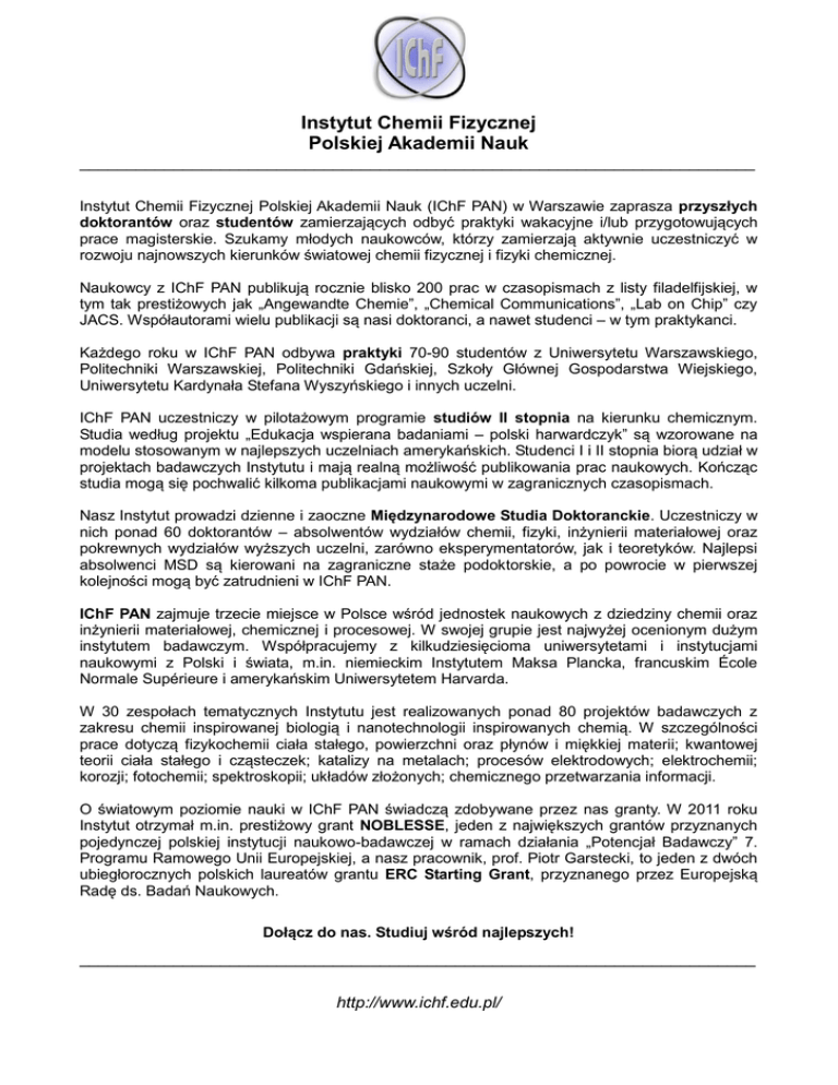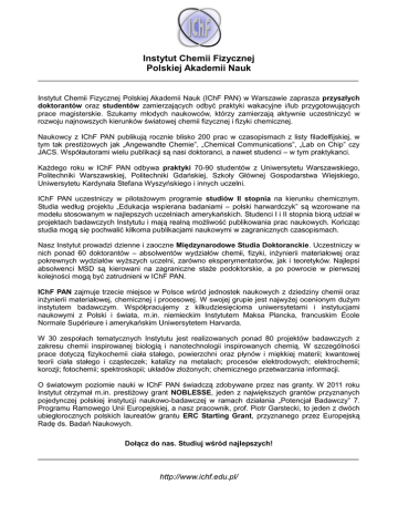 Instytut Chemii Fizycznej Polskiej Akademii Nauk ________________________________________________________________________ Instytut Chemii Fizycznej Polskiej Akademii Nauk (IChF PAN) w Warszawie zaprasza przyszłych doktorantów oraz studentów zamierzających odbyć praktyki wakacyjne i/lub przygotowujących prace magisterskie. Szukamy młodych naukowców, którzy zamierzają aktywnie uczestniczyć w rozwoju najnowszych kierunków światowej chemii fizycznej i fizyki chemicznej. Naukowcy z IChF PAN publikują rocznie blisko 200 prac w czasopismach z listy filadelfijskiej, w tym tak prestiżowych jak „Angewandte Chemie”, „Chemical Communications”, „Lab on Chip” czy JACS. Współautorami wielu publikacji są nasi doktoranci, a nawet studenci – w tym praktykanci. Każdego roku w IChF PAN odbywa praktyki 70-90 studentów z Uniwersytetu Warszawskiego, Politechniki Warszawskiej, Politechniki Gdańskiej, Szkoły Głównej Gospodarstwa Wiejskiego, Uniwersytetu Kardynała Stefana Wyszyńskiego i innych uczelni. IChF PAN uczestniczy w pilotażowym programie studiów II stopnia na kierunku chemicznym. Studia według projektu „Edukacja wspierana badaniami – polski harwardczyk” są wzorowane na modelu stosowanym w najlepszych uczelniach amerykańskich. Studenci I i II stopnia biorą udział w projektach badawczych Instytutu i mają realną możliwość publikowania prac naukowych. Kończąc studia mogą się pochwalić kilkoma publikacjami naukowymi w zagranicznych czasopismach. Nasz Instytut prowadzi dzienne i zaoczne Międzynarodowe Studia Doktoranckie. Uczestniczy w nich ponad 60 doktorantów – absolwentów wydziałów chemii, fizyki, inżynierii materiałowej oraz pokrewnych wydziałów wyższych uczelni, zarówno eksperymentatorów, jak i teoretyków. Najlepsi absolwenci MSD są kierowani na zagraniczne staże podoktorskie, a po powrocie w pierwszej kolejności mogą być zatrudnieni w IChF PAN. IChF PAN zajmuje trzecie miejsce w Polsce wśród jednostek naukowych z dziedziny chemii oraz inżynierii materiałowej, chemicznej i procesowej. W swojej grupie jest najwyżej ocenionym dużym instytutem badawczym. Współpracujemy z kilkudziesięcioma uniwersytetami i instytucjami naukowymi z Polski i świata, m.in. niemieckim Instytutem Maksa Plancka, francuskim École Normale Supérieure i amerykańskim Uniwersytetem Harvarda. W 30 zespołach tematycznych Instytutu jest realizowanych ponad 80 projektów badawczych z zakresu chemii inspirowanej biologią i nanotechnologii inspirowanych chemią. W szczególności prace dotyczą fizykochemii ciała stałego, powierzchni oraz płynów i miękkiej materii; kwantowej teorii ciała stałego i cząsteczek; katalizy na metalach; procesów elektrodowych; elektrochemii; korozji; fotochemii; spektroskopii; układów złożonych; chemicznego przetwarzania informacji. O światowym poziomie nauki w IChF PAN świadczą zdobywane przez nas granty. W 2011 roku Instytut otrzymał m.in. prestiżowy grant NOBLESSE, jeden z największych grantów przyznanych pojedynczej polskiej instytucji naukowo-badawczej w ramach działania „Potencjał Badawczy” 7. Programu Ramowego Unii Europejskiej, a nasz pracownik, prof. Piotr Garstecki, to jeden z dwóch ubiegłorocznych polskich laureatów grantu ERC Starting Grant, przyznanego przez Europejską Radę ds. Badań Naukowych. Dołącz do nas. Studiuj wśród najlepszych! ________________________________________________________________________ http://www.ichf.edu.pl/