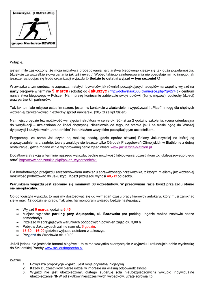 Witajcie, jestem mile zaskoczony, że moja inicjatywa propagowania narciarstwa biegowego cieszy się tak dużą popularnością. (dziękuję za wszystkie słowa uznania jak też i uwagi;) Wobec takiego zainteresowania nie pozostaje mi nic innego, jak jeszcze raz podjąć się trudu organizacji wyjazdu ☺ Będzie to ostatni wyjazd w tym sezonie! ☺ W związku z tym serdecznie zapraszam stałych bywalców jak również początkujących adeptów na wspólny wyjazd na narty biegowe w terminie 9 marca (sobota) do Jakuszyc (http://dolnyslask360.pl/miejsce.php?q=274 ) - centrum narciarstwa biegowego w Polsce. Na imprezę koniecznie zabierzcie swoje połówki (żony, mężów), pociechy (dzieci) oraz partnerki i partnerów. Tak jak to miało miejsce ostatnim razem, jestem w kontakcie z właścicielem wypożyczalni „Piast” i mogę dla chętnych wcześniej zarezerwować niezbędny sprzęt narciarski. (30,- zł za kpl./dzień). Na miejscu będzie też możliwość wynajęcia instruktora w cenie ok. 30,- zł za 2 godziny szkolenia. (cena orientacyjna do weryfikacji – uzależniona od ilości chętnych). Niezależnie od tego, na starcie jak i na trasie będę do Waszej dyspozycji i służyć swoim „amatorskim” instruktażem wszystkim początkującym uczestnikom. Przypomnę, że same Jakuszyce są malutką osadą, gdzie oprócz sławnej Polany Jakuszyckiej na której są wypożyczalnie nart, szatnie, toalety znajduje się jeszcze tylko Ośrodek Przygotowań Olimpijskich w Biathlonie z dobrą restauracją , gdzie można w nie wygórowanej cenie zjeść obiad. www.jakuszyce-biathlon.pl Dodatkową atrakcją w terminie naszego wyjazdu, będzie możliwość kibicowania uczestnikom „X jubileuszowego biegu retro” http://www.orleizerskie.pl/pl/pokaz_wydarzenie/41 Dla komfortowego przejazdu zarezerwowałem autokar u sprawdzonego przewoźnika, z którym mieliśmy już wcześniej możliwość podróżować do Jakuszyc. Koszt przejazdu wynosi 40,- zł od osoby. Warunkiem wyjazdu jest zebranie się minimum 30 uczestników. W przeciwnym razie koszt przejazdu stanie się nieopłacalny. Co do logistyki wyjazdu, to musimy dostosować się do wymagań czasu pracy kierowcy autokaru, który musi zamknąć się w max. 12 godzinnej pracy. Tak więc harmonogram wyjazdu będzie następujący: • • • • • • Wyjazd 9 marca, godzina 6:45. Miejsce wyjazdu: parking przy Aquaparku, ul. Borowska (na parkingu będzie można zostawić nasze samochody) Przejazd w sprzyjających warunkach pogodowych powinien zająć ok. 3,00 h Pobyt w Jakuszycach zajmie nam ok. 6 godzin. 15:30 – 16:00 godzina wyjazdu autokaru z Jakuszyc. Przyjazd do Wrocławia ok. 19:00 Jeżeli jednak nie jesteście fanami biegówek, to mimo wszystko skorzystajcie z wyjazdu i zafundujcie sobie wycieczkę do Szklarskiej Poręby www.szklarskaporeba.pl Ważne 1. 2. 3. Powyższa propozycja wyjazdu jest moją prywatną inicjatywą. Każdy z uczestników bierze udział w imprezie na własną odpowiedzialność Wyjazd nie jest ubezpieczony, dlatego sugeruję (dla nieubezpieczonych) wykupić indywidualne ubezpieczenie NNW od skutków nieszczęśliwych wypadków, utratę zdrowia itp. 4. 5. 6. 7. Po zadeklarowaniu swojego uczestnictwa, zbiorę opłatę jedynie za przejazd, którą opłacę wynajęcie transportu. Wasza wpłata będzie dla mnie potwierdzeniem udziału w imprezie. W przypadku ewentualnej rezygnacji, nie będzie możliwy zwrot wpłaconej kwoty za przejazd. Możliwe za to będzie wskazanie innej osoby na swoje miejsce. Wszystkie pozostałe koszty podczas wyjazdu (wypożyczenie nart, posiłki, itp.) uczestnik pokrywa we własnym zakresie, Szczegóły organizacji wyjazdu będę ustalać już z grupą docelową. Podsumowując, jeżeli jesteś zainteresowana/ny wyjazdem, to proszę o zgłoszenia na mój adres e-mail [email protected] do piątku 1 marca z dodatkową informacją (o poniższe dane), potrzebne do kontaktu oraz do ewentualnego wypożyczenia nart biegowych. Imię i Nazwisko nr tel. komórkowego adres e-mail wzrost nr buta W przypadku jakichkolwiek pytań, dzwońcie, piszcie, jestem do Waszej dyspozycji. PS. Proponuję nie czekajcie z podjęciem decyzji o wyjeździe do ostatniej chwili (1 marca), ponieważ decyduje kolejność zgłoszeń, (a ostatnim razem lista uczestników bardzo szybko się zapełniła i z przykrością musiałem odmawiać wyjazdu). Pozdrawiam Mariusz Kochański Tel. 695 71 22 00