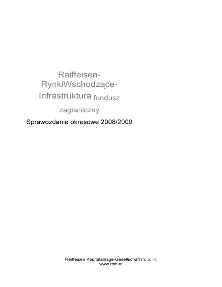 RaiffeisenRynkiWschodząceInfrastruktura fundusz zagraniczny Sprawozdanie okresowe 2008/2009 Raiffeisen Kapitalanlage-Gesellschaft m. b. H. www.rcm.at Raiffeisen-EmergingMarkets-Infrastruktur Raiffeisen-RynkiWschodzące-Infrastruktura 1) Zarządzanie funduszem: Raiffeisen Kapitalanlage-Gesellschaft m. b. H. Sprawozdanie okresowe za okres od 5 sierpnia 2008 do 31 stycznia 2009 Kod ISIN przy wypłacaniu: AT0000A09ZJ4 Kod ISIN przy aprecjacji kapitału: AT0000A09ZK2 Kod ISIN przy pełnej aprecjacji kapitału (zagranica): AT0000A09ZL0 Kod ISIN plany oszczędnościowe funduszu przy aprecjacji kapitału: AT0000A09ZX5 1) Opublikowany prospekt funduszu Raiffeisen-RynkiWschodzące-Infrastrukturafundusz zagraniczny w aktualnej wersji łącznie ze wszystkimi zmianami wprowadzonymi od pierwszego wydania dostępny jest na stronie internetowej www.rcm.at Seite 2 Raiffeisen-RynkiWschodz ce-Infrastrukturafundusz zagraniczy Spis treści Wspólnicy i organy.................................................................................................................4 Szczegółowe dane o funduszu w EUR...................................................................................6 Rynek kapitałowy ...................................................................................................................7 Polityka inwestycyjna .............................................................................................................8 Struktura majątku funduszu w EUR .......................................................................................9 Zestawienie majątku funduszu w EUR .................................................................................11 Zarządzane fundusze inwestycyjne......................................................................................15 Strona 3 Raiffeisen-RynkiWschodz ce-Infrastrukturafundusz zagraniczy Wspólnicy i organy (stan na: 31 stycznia 2009) Raiffeisen Kapitalanlage-Gesellschaft m. b. H. Schwarzenbergplatz 3, A-1010 Wien Tel. +43 1 71170-0, Fax +43 1 71170-1092 Wspólnicy: RZB Sektorbeteiligung GmbH, Raiffeisenlandesbank Burgenland und Revisionsverband reg.Gen.m.b.H., Raiffeisenlandesbank Kärnten – Rechenzentrum und Revisionsverband reg.Gen.m.b.H., RAIFFEISENLANDESBANK NIEDERÖSTERREICH-WIEN AG, Raiffeisen-Landesbank Steiermark AG, Raiffeisenlandesbank Vorarlberg Waren- und Revisionsverband reg.Gen.m.b.H., Raiffeisenverband Salzburg reg.Gen.m.b.H., Raiffeisen Landesbank (Tirol) Sektor Beteiligungsverwaltungs GmbH, Raiffeisen Landesbank OÖ Unternehmensbeteiligungs GmbH Komisarze państwowi: dr Edeltraud LACHMAYER, mgr Kristina FUCHS Rada nadzorcza: dyr. dr Gerhard GRUND, przewodniczący, prok. mgr Regina REITTER z-ca przewodniczącego, z-ca dyrektora gen. Leopold BUCHMAYER, dyr. zarz. Dkfm. Arndt HALLMANN, dyr. mgr Georg MESSNER, dyr. mgr Johann SCHINWALD, dyr. zarz. dr Georg STARZER, dyr. mgr Gobert STERNBACH, dyr. Anton TROJER, mgr Manfred BAYER, mgr Stefan GRÜNWALD, Martin HAGER, Sylvia KUBICEK, prok. mgr Friedrich SCHILLER Rada polityki handlowej: dyr. zarz. mgr Manfred URL, przewodniczący, prok. mgr Harald SCHODER, z-ca przewodniczącego, dyr. wydziału mgr Peter BREZINSCHEK,mgr inż. Alexander EGGER, dyr. dr Gerhard GRUND, mgr Margot INSAM-GSTACH, zca dyr. dr Nicolaus HAGLEITNER, prok. Uwe HANGHOFER, prok. Paul KIRCHKNOPF, mgr Petra RUDERER-KNOLLMAYR, prok. Helmut WIMMER Bank depozytariusz: Raiffeisen Zentralbank Österreich AG Zarząd: dr Mathias BAUER, przewodniczący, mgr (FH) Dieter AIGNER, mgr Gerhard AIGNER Prokurenci: Anne AUBRUNNER MSc., Andreas BOCKBERGER, mgr Mathias BREIER, mgr Elke EBNER, mgr Harald FRODL, mgr Gerhard GALLNER, mgr Klaus GLASER, Wolfgang HÖFNER, mgr Norbert JANISCH, mgr Gabriele KELLNER, mgr Kurt KOTZEGGER, Martina LENZ, dr Heinz MACHER, dr Angelika MILLENDORFER, Herbert PERUS, Herbert POPOVITS, mgr Hans RAPATZ, mgr Monika RIEDEL, mgr Andreas RIEGLER, mgr Friedrich SCHILLER, dr Michael SCHMID, mgr Robert SENZ, mgr Rosemarie STIPKOVICH-WIMMER, mgr Ingrid SZEILER, mgr Sheila TALEBIZADEH, mgr Daniela UHLIK-KLIEMSTEIN, mgr Georg WILDNER, dr Marina ZENKER Strona 4 Raiffeisen-RynkiWschodz ce-Infrastrukturafundusz zagraniczy Szanowni posiadacze jednostek uczestnictwa! Spółka Raiffeisen Kapitalanlage-Gesellschaft m. b. H. przedkłada niniejszym sprawozdanie z działalności funduszu Raiffeisen-RynkiWschodzące-Infrastrukturafundusz zagraniczny – Fundusz współwłasnościowy zgodnie z § 20 InvFG – za okres od 5 sierpnia 2008 do 31 stycznia 2009. Na wstępie pozwalamy sobie zauważyć, że Raiffeisen- A.R.-Global-Obligacjefundusz zagraniczny jest założony zgodnie z § 20 InvFG. Podległym podfunduszom zarządzające nimi spółki inwestycyjne rozliczyły odszkodowania administracyjne do maksymalnie 2,00 % rocznie. W rachunku nie policzono narzutu emisyjnego dla planowania i odkupienia jednostek. Wartość jednostki uczestnictwa wynika z podziału wartości całkowitej funduszu inwestycyjnego wraz z zyskami przez liczbę jednostek uczestnictwa. Wartość całkowitą funduszu inwestycyjnego ustala bank depozytariusz na podstawie aktualnych kursów wchodzących w jego skład papierów wartościowych, instrumentów rynku pieniężnego i praw do poboru akcji łącznie z wartością wchodzących w skład funduszu inwestycji finansowych, kwot pieniężnych, wkładów, należności i pozostałych praw po potrąceniu zobowiązań. Majątek netto ustalany jest według poniższych zasad: a) Wartość wartości majątkowych, które są notowane lub są w obrocie na giełdzie lub innym rynku uregulowanym, ustalane są z reguły na podstawie ostatniego dostępnego kursu. b) O ile wartość majątkowa nie jest notowana lub nie jest w obrocie na giełdzie lub innym rynku uregulowanym lub o ile dla wartości majątkowej, która jest notowana lub jest w obrocie na giełdzie lub innym rynku uregulowanym, kurs nie odzwierciedla właściwie faktycznej wartości rynkowej, miarodajne są kursy wiarygodnych d