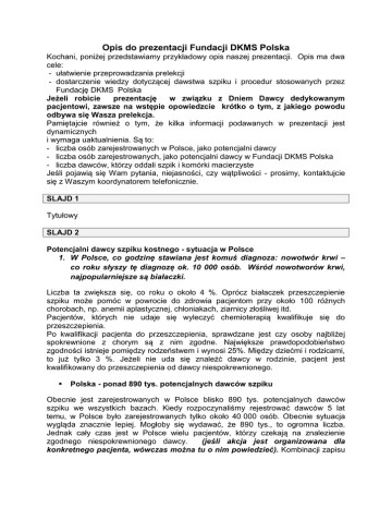 Opis do prezentacji Fundacji DKMS Polska Kochani, poniżej przedstawiamy przykładowy opis naszej prezentacji. Opis ma dwa cele: - ułatwienie przeprowadzania prelekcji - dostarczenie wiedzy dotyczącej dawstwa szpiku i procedur stosowanych przez Fundację DKMS Polska Jeżeli robicie prezentację w związku z Dniem Dawcy dedykowanym pacjentowi, zawsze na wstępie opowiedzcie krótko o tym, z jakiego powodu odbywa się Wasza prelekcja. Pamiętajcie również o tym, że kilka informacji podawanych w prezentacji jest dynamicznych i wymaga uaktualnienia. Są to: - liczba osób zarejestrowanych w Polsce, jako potencjalni dawcy - liczba osób zarejestrowanych, jako potencjalni dawcy w Fundacji DKMS Polska - liczba dawców, którzy oddali szpik i komórki macierzyste Jeśli pojawią się Wam pytania, niejasności, czy wątpliwości - prosimy, kontaktujcie się z Waszym koordynatorem telefonicznie. SLAJD 1 Tytułowy SLAJD 2 Potencjalni dawcy szpiku kostnego - sytuacja w Polsce 1. W Polsce, co godzinę stawiana jest komuś diagnoza: nowotwór krwi – co roku słyszy tę diagnozę ok. 10 000 osób. Wśród nowotworów krwi, najpopularniejsze są białaczki. Liczba ta zwiększa się, co roku o około 4 %. Oprócz białaczek przeszczepienie szpiku może pomóc w powrocie do zdrowia pacjentom przy około 100 różnych chorobach, np. anemii aplastycznej, chłoniakach, ziarnicy złośliwej itd. Pacjentów, których nie udaje się wyleczyć chemioterapią kwalifikuje się do przeszczepienia. Po kwalifikacji pacjenta do przeszczepienia, sprawdzane jest czy osoby najbliżej spokrewnione z chorym są z nim zgodne. Największe prawdopodobieństwo zgodności istnieje pomiędzy rodzeństwem i wynosi 25%. Między dziećmi i rodzicami, to już tylko 3 %. Jeżeli nie uda się znaleźć dawcy w rodzinie, pacjent jest kwalifikowany do przeszczepienia od dawcy niespokrewnionego. Polska - ponad 890 tys. potencjalnych dawców szpiku Obecnie jest zarejestrowanych w Polsce blisko 890 tys. potencjalnych dawców szpiku we wszystkich bazach. Kiedy rozpoczynaliśmy rejestrować dawców 5 lat temu, w Polsce było zarejestrowanych tylko około 40 000 osób. Obecnie sytuacja wygląda znacznie lepiej. Mogłoby się wydawać, że 890 tys., to ogromna liczba. Jednak cały czas jest w Polsce wielu pacjentów, którzy czekają na znalezienie zgodnego niespokrewnionego dawcy. (jeśli akcja jest organizowana dla konkretnego pacjenta, wówczas można tu o nim powiedzieć). Kombinacji zapisu fragmentu informacji genetycznej, dzięki której dopasowuje się zgodnego dawce do pacjenta jest kilkanaście miliardów. Więcej niż ludzi na ziemi. Dlatego może zdarzyć się tak, że są osoby, dla których nie uda znaleźć się zgodnych dawców. Jednak im więcej osób zarejestruje się, tym większą szansa na znalezienie dawcy dla każdego pacjenta. Fundacja DKMS Polska (od lutego 2009r.) zarejestrowała ponad 772 000 potencjalnych dawców (październik 2015 r.) – jesteśmy obecnie największą bazą potencjalnych dawców komórek macierzystych w Polsce. Fundacja DKMS Polska rozpoczęła rejestrację potencjalnych dawców szpiku w lutym 2009r. Od tego momentu staliśmy się największą bazą potencjalnych dawców w Polsce. Obecnie jest u nas zarejestrowanych ponad 772 tys. dawców. Przyglądając się innym państwom wiemy, że w Polsce jest potencjał na zarejestrowanie co najmniej miliona potencjalnych dawców szpiku. Dzięki akcji, która organizujemy zbliżamy się do pierwszego miliona dawców w Polsce. SLAJD 3 Prawdopodobieństwo bycia realnym dawcą 5% zarejestrowanych potencjalnych dawców przeszczepienia w przeciągu 10 lat od rejestracji. oddaje komórki do Prawdopodobieństwo, że zostanie się rzeczywistym dawcą wynosi około 5% w ciągu 10 lat. Oznacza to, że około 5 osób, z każdych 100 zarejestrowanych w przedziale 10 lat, może ofiarować szansę na życie zgodnemu pacjentowi. Im więcej osób zarejestruje się, jako potencjalni dawcy, tym większe są szanse na znalezienie zgodnego genetycznie niespokrewnionego dawcy dla pacjenta – „genetycznego bliźniaka”. Im więcej osób będzie zarejestrowanych, tym większa szansa na znalezienie zgodnego genetycznie dawcy niespokrewnionego dla większej liczby pacjentów. Patrząc na liczby na możecie zobaczyć proporcje. 2499 osób, które dotychczas zostało dawcami z bazy Fundacji DKMS to zaledwie 0,29 % ze wszystkich zarejestrowanych ponad 772 tys. . SLAJD 4 Kto może zostać potencjalnym dawcą? Jakie kryteria musi spełniać osoba, która chce się zarejestrować? Osoba, która chce się zarejestrować, jako potencjalny dawca szpiku może to zrobić pod warunkiem, że spełni kilka kryteriów. Świadoma Decyzja Pierwszym kryterium jest podjęcie świadomej decyzji dotyczącej rejestracji, jako potencjalny dawca szpiku. Ta decyzja może mieć niezwykle duży rzeczywisty wpływ na życie pacjenta. W każdym dniu, nowe osoby dowiadują się, że są, będą potrzebowały zgodnego dawcy, aby móc otrzymać szansę na zdrowie i życie. Dawca w takiej sytuacji staje się najważniejszym lekiem. Bez niego pacjent nie otrzymam swojej szansy. Zgoda na pobranie obiema metodami (materiału do przeszczepienia) Osoba, która chce się zarejestrować, jako potencjalny dawca szpiku, wyraża zgodę na obie metody pobierania materiału do przeszczepienia (komórek macierzystych i szpiku – w dalszej części będą one szczegółowo opisane). Zgoda ta jest bardzo ważna. Wybranie metody pobrania jest zależne od lekarza kwalifikującego pacjenta do przeszczepienia. Lekarz korzystając ze swojej wiedzy i doświadczenia wie znając wyniki pacjenta i jego przebieg choroby, jaki materiał do przeszczepienia zwiększy szansę pacjenta na życie i powrót do zdrowia. • Wiek: 18 - 55 lat To kryterium jest bardzo łatwo sprawdzić . Jako potencjalni dawcy szpiku mogą zarejestrować się osoby, które ukończyły 18 r.ż. i jednocześnie, które nie skończyły jeszcze 55 lat, w dni