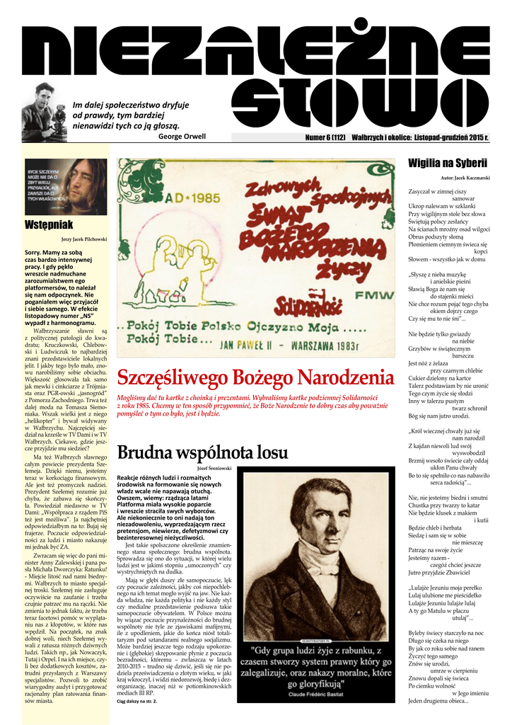 Im dalej społeczeństwo dryfuje od prawdy, tym bardziej nienawidzi tych co ją głoszą. George Orwell Numer 6 (112) Wałbrzych i okolice: Listopad-grudzień 2015 r. Wigilia na Syberii Autor: Jacek Kaczmarski Zasyczał w zimnej ciszy samowar Ukrop nalewam w szklanki Przy wigilijnym stole bez słowa Świętują polscy zesłańcy Na ścianach mroźny osad wilgoci Obrus podszyty słomą Płomieniem ciemnym świeca się kopci Słowem - wszystko jak w domu Wstępniak Jerzy Jacek Pilchowski Sorry. Mamy za sobą czas bardzo intensywnej pracy. I gdy pękło wreszcie nadmuchane zarozumialstwem ego platformersów, to należał się nam odpoczynek. Nie poganiałem więc przyjacół i siebie samego. W efekcie listopadowy numer „NS” wypadł z harmonogramu. Wałbrzyszanie sławni są z politycznej patologii do kwadratu; Kruczkowski, Chlebowski i Ludwiczuk to najbardziej znani przedstawiciele lokalnych jelit. I jakby tego było mało, znowu narobiliśmy sobie obciachu. Większość głosowała tak samo jak mewki i cinkciarze z Trójmiasta oraz PGR-owski „jasnogród” z Pomorza Zachodniego. Trwa też dalej moda na Tomasza Siemoniaka. Wszak wielki jest z niego „helikopter” i bywał widywany w Wałbrzychu. Najczęściej siedział na krześle w TV Dami i w TV Wałbrzych. Ciekawe, gdzie jeszcze przyjdzie mu siedzieć? Ma też Wałbrzych sławnego całym powiecie prezydenta Szełemeja. Dzięki niemu, jesteśmy teraz w korkociągu finansowym. Ale jest też promyczek nadziei. Prezydent Szełemej rozumie już chyba, że zabawa się skończyła. Powiedział niedawno w TV Dami: „Współpraca z rządem PiS też jest możliwa”. Ja najchętniej odpowiedziałbym na to: Bujaj się frajerze. Poczucie odpowiedzialności za ludzi i miasto nakazuje mi jednak być ZA. Zwracam się więc do pani minister Anny Zalewskiej i pana posła Michała Dworczyka: Ratunku! - Miejcie litość nad nami biednymi. Wałbrzych to miasto specjalnej troski. Szełemej nie zasługuje oczywiście na zaufanie i trzeba czujnie patrzeć mu na rączki. Nie zmienia to jednak faktu, że trzeba teraz facetowi pomóc w wyplątaniu nas z kłopotów, w które nas wpędził. Na początek, na znak dobrej woli, niech Szełemej wywali z ratusza różnych dziwnych ludzi. Takich np., jak Nowaczyk, Tutaj i Orpel. I na ich miejsce, czyli bez dodatkowych kosztów, zatrudni przysłanych z Warszawy specjalistów. Pozwoli to zrobić wiarygodny audyt i przygotować racjonalny plan ratowania finansów miasta. „Słyszę z nieba muzykę i anielskie pieśni Sławią Boga że nam się do stajenki mieści Nie chce rozum pojąć tego chyba okiem dojrzy czego Czy się mu to nie śni”... Szczęśliwego Bożego Narodzenia Mogliśmy dać tu kartke z choinką i prezentami. Wybraliśmy kartke podziemnej Solidarności z roku 1985. Chcemy w ten sposób przypomnieć, że Boże Narodzenie to dobry czas aby poważnie pomyśleć o tym co było, jest i będzie. Brudna wspólnota losu Józef Śreniowski Reakcje różnych ludzi i rozmaitych środowisk na formowanie się nowych władz wcale nie napawają otuchą. Owszem, wiemy: rządząca latami Platforma miała wysokie poparcie i wreszcie straciła swych wyborców. Ale niekoniecznie to oni nadają ton niezadowoleniu, wyprzedzającym rzecz pretensjom, niewierze, defetyzmowi czy bezinteresownej nieżyczliwości. Jest takie spolszczone określenie znamiennego stanu społecznego: brudna wspólnota. Sprowadza się ono do sytuacji, w której wielu ludzi jest w jakimś stopniu „umoczonych” czy wystrychniętych na dudka. Mają w głębi duszy złe samopoczucie, lęk czy poczucie zależności, jakby coś niepochlebnego na ich temat mogło wyjść na jaw. Nie każda władza, nie każda polityka i nie każdy styl czy medialne przedstawienie podsuwa takie samopoczucie obywatelom. W Polsce można by wiązać poczucie przynależności do brudnej wspólnoty nie tyle ze zjawiskami mafijnymi, ile z upodleniem, jakie do końca niósł totalitaryzm pod sztandarami realnego socjalizmu. Może bardziej jeszcze tego rodzaju upokorzenie i (głębokie) skrępowanie płynie z poczucia bezradności, któremu – zwłaszcza w latach 2010-2015 – trudno się dziwić, jeśli się nie podziela przeświadczenia o złotym wieku, w jaki kraj wkroczył, i widzi niedorozwój, biedę i dezorganizację, inaczej niż w potiomkinowskich mediach III RP. Ciąg dalszy na str. 2. Nie będzie tylko gwiazdy na niebie Grzybów w świątecznym barszczu Jest nóż z żelaza przy czarnym chlebie Cukier dzielony na kartce Talerz podstawiam by nie uronić Tego czym życie się słodzi Inny w talerzu pustym twarz schronił Bóg się nam jutro urodzi. „Król wiecznej chwały już się nam narodził Z kajdan niewoli lud swój wyswobodził Brzmij wesoło świecie cały oddaj ukłon Panu chwały Bo to się spełniło co nas nabawiło serca radością”... Nie, nie jesteśmy biedni i smutni Chustka przy twarzy to katar Nie będzie klusek z makiem i kutii Będzie chleb i herbata Siedzę i sam się w sobie nie mieszczę Patrząc na swoje życie Jesteśmy razem czegóż chcieć jeszcze Jutro przyjdzie Zbawiciel „Lulajże Jezuniu moja perełko Lulaj ulubione me pieścidełko Lulajże Jezuniu lulajże lulaj A ty go Matulu w płaczu utulaj”... Byleby świecy starczyło na noc Długo się czeka na niego By jak co roku sobie nad ranem Życzyć tego samego Znów się urodzi, umrze w cierpieniu Znowu dopali się świeca Po ciemku wolność w Jego imieniu Jeden drugiemu obieca... 2 Matylda Aleksandra Makowska-Prochera W 2014 roku, przed wyborami samorządowymi znalazłam się na ulicy Beethovena w Wałbrzychu.Chodziłam od domu do domu. Budynki pokopalniane, nic ciekawego. Szłam dalej pod górę i… zobaczyłam na końcu ulicy stary, zabytkowy piękny obiekt. Zatkało mnie. Ja, rodowita wałbrzyszanka, nie miałam pojęcia o istnieniu czegoś takiego. Postanowiłam poszperać, poustalać i dowiedzieć się czegoś o tym budynku. Pierwsze kroki skierowałam do konserwatora z