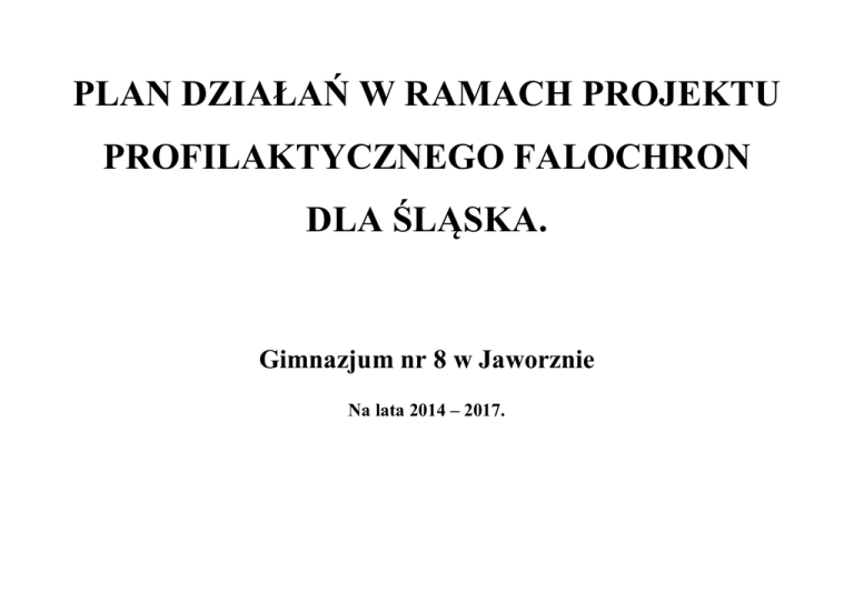PLAN DZIAŁAŃ W RAMACH PROJEKTU PROFILAKTYCZNEGO FALOCHRON DLA ŚLĄSKA. Gimnazjum nr 8 w Jaworznie Na lata 2014 – 2017. PLAN DZIAŁAŃ W RAMACH PROJEKTU PROFILAKTYCZNEGO FALOCHRON DLA ŚLĄSKA. Nazwa działania Zadania pedagoga, wychowawców nauczycieli i instytucji zewnętrznych Termin realizacji I. Obszar Profilaktyka zdrowotna: V IV XI V/VI Zadania zaproponowane przez uczniów „W zdrowym ciele zdrowy duch” promocja zdrowego stylu życia bez używek. Szkolny konkurs wiedzy o zdrowiu „Awantura o zdrowie”; Zajęcia profilaktyczne dla dziewcząt nt. zaburzeń odżywiania „Piękno wczoraj i dziś” P-PP; Przesiewowe badanie słuchu dla kl. I (przeprowadzone przez pracownika Poradni Psychologiczno – Pedagogicznej); Pierwsza pomoc - zajęcia z udziałem ratownika medycznego; Konkurs fotograficzny – „Zdrowo jem”; wykonywanie prezentacji multimedialnych o tematyce zdrowego odżywiania i zaburzeń odżywiania - na zajęciach z edukacji zdrowotnej; dekalog zdrowego stylu życia. „Jestem tym, co jem”. projekt „Kolorowy zawrót głowy” przyrządzanie potraw: sałatek, surówek oraz kanapek; dni zdrowego jedzenia, wybranego produktu; „Czerwone jabłuszko”, „Owocowe szaleństwo” Wychowanie fizyczne na wesoło: Sprawność fizyczna: V V/VI Profilaktyka uzależnień: IX V V „Wyrolowani” ( jazda na rolkach ), joga; spacery z kijami Nordic walking; wędrówki piesze na lekcjach wf; udział w rajdach pieszych zorganizowanych przez PTTK; Impreza sportowa „W zdrowym ciele zdrowy duch”; „Światowy dzień bez papierosów” pogadanki na temat zdrowotnych skutków palenia tytoniu; Scenka profilaktyczna – „Sąd nad Papierosem”; Zachęcanie uczniów do udziału w konkursach szkolnych: - konkurs czytelniczo – profilaktyczny „Pułapka uzależnień”; - konkurs profilaktyczny „Dziękuję nie palę”; zorganizowanie punktu informacyjnego (ulotki) dla rodziców i uczniów przy gabinecie pedagoga; na bieżąco Happening uliczny (uczniowie G8 wraz z funkcjonariuszami KMP - zachęcają kierowców do zachowania trzeźwości- wręczanie ulotek, pisemny apel do sprzedawców i właścicieli sklepów o Rajd Pierwszaka; Rozgrywki sportowe - „piłkarzyki” na świeżym powietrzu; gazetki tematyczne na korytarzu szkolnym– „Papieros Twój wróg”; angażowanie uczniów w zajęcia profilaktyczne – uczeń jako prowadzący; kontynuacja programu edukacyjno – profilaktycznego „Trzymaj formę”, „Znajdź właściwe rozwiązanie”, „Palenie jest słabe”; kontynuacja programu „Zachowaj trzeźwy umysł”; kontynuacja happeningu ulicznego; zwrócenie szczególnej uwagi na wiek osoby kupującej alkohol ); realizacja programu profilaktycznego Unplugged dla uczniów kl.I – cykl spotkań zaplanowany na cały rok szkolny . zajęcia profilaktyczne: Uzależnienia - Narkotyki? To mnie nie kręci”, „Uwaga na Dopalacze”; podczas godzin wychowawczych ( zgodnie z planem pracy); ulotki dla rodziców „O narkotykach bez histerii” ( w formie pisemnej oraz na stronie internetowej); II. „Wyloguj się do życia” – bezpiecznie w cybeprzestrzeni. Obszar „Dzień Bezpiecznego Internetu” Cyberprzemoc II Fonoholizm Projekcje filmów profilaktycznych: „Uważaj na facebooka”, „Cyberprzestrzeń”, „Stop cyberprzemocy”, „Wyloguj się do życia” – zajecia profilaktyczne; Prezentacja multimedialna dla rodziców „ Cyberprzestrzeń”; Pogadanka przeprowadzona przez insp. do spraw nieletnich dot. cybeprzestrzeni w świetle prawa. Zajęcia profilaktyczne – fonoholizm. pakiet - bezpieczne gry; internetowy turniej (FIFA); zorganizowanie dnia walki z hałasem – strefa ciszy świetlica; III.Savoir vivre – przepis na kulturalnego człowieka. Obszar „Jak cię widzą tak cię piszą”. III Zapoznanie uczniów z zasadami savoir vivre w szkole, w domu, na ulicy. VI Udział w imprezach kulturalnych organizowanych na terenie miasta; Udział w międzygimnazjalnym konkursie „Arbiter Elegantiarum”; Szkolny Konkurs Savoir Vivre; Kształtowanie XI u uczniów kultury wysławiania się, szacunku dla innych, XII –III umiejętności bycia pomocnym. Przeciwdziałania dyskryminacji (realizacja pakietu antydyskryminacyjnego), gazetka nt. tolerancji; Rozwijanie więzi koleżeńskich i form samopomocy, pomoc koleżeńska w nauce; Akcja „Stop wulgaryzmom” – konkurs na plakat, gazetki na korytarzu szkolnym, rozdawanie ulotek informacyjnych; Udział w pomocowych akcjach społecznych; „Dobre maniery łamią wszystkie bariery” Kodeks rycerzy Kazimierza Wielkiego; Internetowa ankieta dla uczniów nt. przestrzegania dobrych manier; pokaz kulturalnych zachowań; gazetki na korytarzu szkolnym i w klasach; zorganizowanie tygodnia przyjaźni i życzliwości – (listopad); „Gimnazjalna piosenka o tolerancji” napisana przez uczniów; konkurs w scrable; klasowe wybory „pomocnego” ucznia; zbieranie plastikowych nakrętek dla chorego chłopca; „Szlachetna paczka”; zbieranie karmy dla zwierząt ze schroniska Coolturalny uczeń na bieżąco Rozwijanie umiejętności radzenia sobie ze stresem; warsztaty dla uczniów nt. stresu; Wypracować klasowe zasady dotyczące wzajemnego traktowania się; Przypomnienie szkolnych zasad, wyjaśnienie obowiązujących procedur, wyjaśnienie konsekwencji – jaki mają charakter, czemu służą. prezentacje multimedialne – klasowe zasady wzajemnego traktowania się; dyżury uczniów na korytarzach szkolnych; Informacja dla Rodziców/Opiekunów – zapoznać z procedurami postępowania w sytuacji konfliktów, zdarzeń o charakterze przemocowym/ ceberprzemocowym. Warsztaty dla rodziców ( zgodne z planem pracy); Zajęcia profilaktyczne nt. przemocy i konfliktów rówieśniczych. Zapoznać uczniów z procedurami szkolnymi.Przypomnieć zasady szkolne – prawa i obowiązki. Pogadanka przeprowadzona przez insp. do spraw nieletnich dot. odpowiedzialności nieletnich w świetle przepisów prawa. Wzmacnianie pozytywnych z