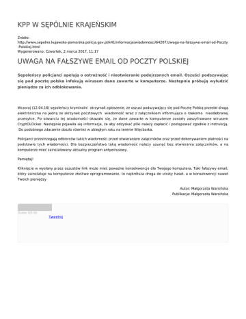 KPP W SĘPÓLNIE KRAJEŃSKIM Źródło: http://www.sepolno.kujawsko-pomorska.policja.gov.pl/k41/informacje/wiadomosci/64207,Uwaga-na-falszywe-email-od-Poczty -Polskiej.html Wygenerowano: Czwartek, 2 marca 2017, 11:17 UWAGA NA FAŁSZYWE EMAIL OD POCZTY POLSKIEJ Sępoleńscy policjanci apelują o ostrożność i nieotwieranie podejrzanych email. Oszuści podszywając się pod pocztę polska infekują wirusem dane zawarte w komputerze. Następnie próbują wyłudzić pieniądze za ich odblokowanie. Wczoraj (12.04.16) sępoleńscy kryminalni otrzymali zgłoszenie, że oszust podszywający się pod Pocztę Polską przesłał drogą elektroniczna na jedną ze skrzynek pocztowych wiadomość wraz z załącznikiem informująca o rzekomo nieodebranej przesyłce. Po otwarciu tej wiadomości okazało się, że dane zawarte w komputerze zostały zaszyfrowane wirusem CryptOLOcker. Następnie pojawiła się informacja, że aby odzyskać pliki należy zapłacić i postępować zgodnie z instrukcją. Do podobnego zdarzenie doszło również w ubiegłym roku na terenie Więcborka. Policjanci przestrzegają odbiorców takich wiadomości przed otwieraniem załączników oraz przed dokonywaniem płatności na podstawie tych wiadomości. Dla bezpieczeństwa taką wiadomość należy usunąć bez otwierania załączników, a na komputerze mieć zainstalowany aktualny program antywirusowy. Pamiętaj! Kliknięcie w wysłany przez oszustów link może mieć poważne konsekwencje dla Twojego komputera. Taki fałszywy email, który zainstaluje na komputerze złośliwe oprogramowanie, to najkrótsza droga do utraty haseł, a w konsekwencji nawet Twoich pieniędzy Autor: Małgorzata Warsińska Publikacja: Małgorzata Warsińska Ocena: 0/5 (0) Tweetnij
