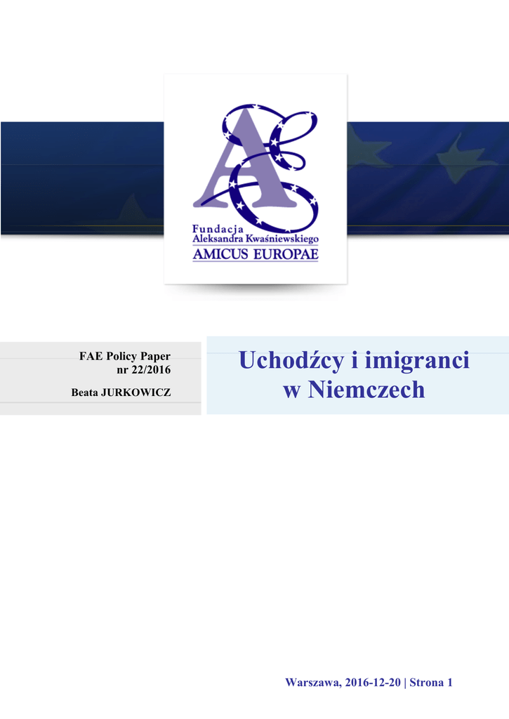 FAE Policy Paper nr 22/2016 Beata JURKOWICZ Uchodźcy i imigranci w Niemczech Afganistan Warszawa, 2016-12-20 | Strona 1 Uchodźcy i imigranci w Niemczech FAE Policy Paper nr 22/2016 Beata Jurkowicz Dramatyczne wydarzenia z 19 grudnia br. z Berlina – gdzie islamski imigrant dokonał ataku terrorystycznego na uczestników tradycyjnego jarmarku bożonarodzeniowego – każą ponownie pochylić się nad kwestią obecności imigrantów i uchodźców w Niemczech oraz ich wpływu na bezpieczeństwo państwa i społeczeństwa naszych zachodnich sąsiadów. Jak podało federalne Ministerstwo Spraw Wewnętrznych RFN, w 2015 roku w Niemczech zarejestrowano ok. 1,1 mln osób ubiegających się o azyl. Przy czym najwięcej, bo ponad 428 tys. aplikujących, to obywatele Syrii, 154 tys. – Afganistanu, 121 tys. – Iraku, 69 tys. – Albanii, 33 tys. – Kosowa, pozostałe 285 tys. wniosków przypada na osoby innych narodowości. Wszyscy zostali już wstępnie sprawdzeni przez niemiecką policję, natomiast do końca bieżącego roku mają zostać wydane decyzje o przyznaniu azylu, bądź też odrzuceniu wniosku. Jednocześnie szef MSW Thomas de Maiziere zapowiedział szybsze deportacje osób, którym odmówiono azylu i nie podlegają ochronie ze względu na sytuację w ich kraju ojczystym. Istnieje bowiem lista tzw. bezpiecznych państw, co w praktyce oznacza, że ich obywatele nie dostaną azylu. Niemiecka konstytucja (art. 16 niemieckiej ustawy zasadniczej z 1949 roku) gwarantuje możliwość przyznania azylu uchodźcom politycznym. Należy też podkreślić, że w roku 2016 liczba uchodźców przybywających do Niemiec spadła. Niewątpliwie przyczyniło się do tego zamknięcie tzw. szlaku bałkańskiego oraz zawarcie porozumienia Unii Europejskiej z Turcją, w którym strony zdecydowały, że Turcja będzie przejmować wszystkich uchodźców wydalonych z greckich wysp, którzy przedostali się tam nielegalnie. W zamian UE będzie przyjmować syryjskich uchodźców z tureckich obozów. Unia zobowiązała się też do liberalizacji polityki wizowej wobec obywateli Turcji i przyspieszenia negocjacji akcesyjnych. Samo porozumienie spotkało się z krytyką nie tylko partii opozycyjnych w Niemczech, ale i siostrzanej CSU. Lewica i Zieloni zarzucili Angeli Merkel, że kanclerz zrezygnowała z angażowania się w działania na rzecz praw człowieka w Turcji, a CSU, że decyzje podjęte w Brukseli nie tylko nie doprowadzą do spadku liczby uchodźców, ale przyczynią się do wzrostu popularności antyimigranckiej partii Alternatywa dla Warszawa, 2016-12-20 | Strona 2 Uchodźcy i imigranci w Niemczech FAE Policy Paper nr 22/2016 Beata Jurkowicz Niemiec (AfD). Albowiem nie można zapominać, że Niemcy są jednym z najchętniej wybieranych kierunków migracji przez osoby nielegalnie przedostające się do Europy. Z sondażu przeprowadzonego przez Federalny Urząd ds. Migracji i Uchodźców (BAMF) wynika, że większość imigrantów ubiegających się o azyl planuje osiedlić się w Niemczech na stałe. 84 proc. ankietowanych myśli o przyszłości w Niemczech, a 80 proc. planuje starać się o niemieckie obywatelstwo. BAMF, który działa też na rzecz integracji uchodźców z niemieckim społeczeństwem, podkreśla, że 82 proc. uchodźców biorących udział w badaniu rozpoczęła kurs niemieckiego, aby pozostać w Niemczech. Trudniej przedstawiała się kwestia ich aktywności zawodowej: jedna trzecia ankietowanych jest czynna zawodowo, a tylko 9 proc. ukończyło szkołę, ma wykształcenie zawodowe lub wyższe. Badanie przeprowadzono na próbie reprezentatywnej osób z Afganistanu, Erytrei, Iraku, Iranu, Sri Lanki i Syrii. Dwie trzecie ankietowanych to mężczyźni, a średnia wieku osób badanych wynosiła 35 lat. W związku z tym, że do Niemiec napływają w dużej mierze osoby młode (w wieku produkcyjnym), niektórzy demografowie podkreślają, że uchodźcy mogą podnieść wskaźnik dzietności w starzejącym się społeczeństwie niemieckim. Optymistyczne wizje towarzyszyły również pracodawcom, bowiem niemiecka gospodarka boryka się z niedoborem pracowników w wielu branżach. Okazuje się jednak, że mimo posiadania odpowiednich kwalifikacji uchodźcy często nie mogą wykonywać swoich profesji w Niemczech, albowiem są one w grupie zawodów regulowanych. W praktyce oznacza to, że jeśli chcą pracować w swoim zawodzie, muszą uzyskać niemiecki certyfikat. Natomiast, aby go zdobyć, wcześniej muszą nauczyć się języka niemieckiego. Tak więc wejście specjalisty na niemiecki rynek pracy nie jest automatyczne, a sam proces może potrwać kilka lat. Ci uchodźcy, którzy od razu nie zostaną zagospodarowani na rynku pracy, w dłuższej perspektywie staną się klientami opieki społecznej. Już dziś eksperci rynku pracy ostrzegają, że bez szybkiej integracji uchodźcy zasilą grupę osób pracujących na czarno. Rozpatrując wspomniane uwarunkowania nie sposób nie zgodzić się ze zmarłym w 2015 roku b. kanclerzem Helmutem Schmidtem, który twierdził, że uchodźcy nie są remedium na problemy demograficzne czy niedobory siły roboczej. Po II wojnie światowej Republika Federalna Niemiec stała się państwem homogenicznym, podobnie jak Niemiecka Republika Demokratyczna. O ile napływ imigracji Warszawa, 2016-12-20 | Strona 3 Uchodźcy i imigranci w Niemczech FAE Policy Paper nr 22/2016 Beata Jurkowicz zarobkowej zmienił strukturę narodowościową w RFN, tak NRD do samego końca pozostała krajem jednolitym narodowościowo. Rosnące zapotrzebowanie na nisko wykwalifikowanych pracowników sprawiło, że państwo zachodnioniemieckie zdecydowało się sprowadzić ich z zagranicy. Pierwszą umowę o przyjmowaniu pracowników RFN podpisała już w 1955 roku z Włochami, następne z Hiszpanią i Grecją (1960), Turcją (1961), Marokiem i Koreą Południową (1963), Portugalią (1964), Tunezją (1965) i Jugosławią (1968). W ramach tychże umów w latach 1962–1974 przez RF