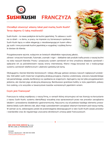 Chciałbyś otworzyć własny lokal pod marką Sushi Kushi? Teraz dajemy Ci taką możliwość! Sushi Kushi – to nowe podejście do kuchni japońskiej. To zabawa z sushi na co dzień – w domu, w pracy, na imprezie czy biznesowym spotkaniu. Sushi Kushi łączy w sobie elegancję z niezobowiązującym luzem oferując sushi i inne przysmaki kuchni japońskiej w wygodnej i szybkiej formule dostaw do klienta. Przygotowywane ręcznie, wyłącznie ze świeżych składników najwyższej jakości, zdrowe i smaczne hosomaki, futomaki, uramaki i nigiri – dokładnie taki produkt trafia prosto z naszej kuchni na stoły naszych klientów. Prosty i przejrzysty system zamówień on-line umożliwia składanie zamówień i opłacanie ich za pośrednictwem naszej strony internetowej. Klienci mogą korzystać też z tradycyjnego systemu zamówień telefonicznych i płatności gotówką lub kartą. Obsługujemy również klientów biznesowych i sklepy oferując gotowe zestawy naszych najlepszych produktów. Stół pełen sushi może być oryginalną atrakcją przyjęcia, imprezy urodzinowej, wieczoru kawalerskiego lub panieńskiego, wesela, konferencji czy spotkania ze znajomymi. Zajmujemy się nie tylko przygotowaniem jedzenia, ale również jego atrakcyjną ekspozycją. Bambusowo-granitowe bufety w stylu japońskim, pokazy live cooking, a to wszystko w towarzystwie toastów wzniesionych japońskim winem. Czym jest franczyza? Franczyza to rodzaj współpracy z naszą firmą, w ramach której otrzymujesz od nas licencję na korzystanie z nazwy Sushi Kushi, systemu identyfikacji wizualnej oraz opracowanych przez nas procedur zarządzania lokalem i prowadzenia działalności gastronomicznej. Nauczymy cię od podstaw każdego elementu prowadzenia lokalu sushi delivery tak, abyś mógł z powodzeniem zarządzać własnym biznesem pod naszą marką. W zamian za to, zobowiązany jesteś do przestrzegania obowiązujących w sieci Sushi Kushi zasad, procedur i standardów oraz do regularnego uiszczania określonych umową opłat franczyzowych. RED STAR FOOD SERVICE Sp. z o.o. 90-451 Łódź, ul. Piotrkowska 211/4 Kontakt: Tomasz Jakubowski +48 500 054 838 [email protected] Korzyści Na każdym etapie współpracy z naszą firmą będziesz mógł liczyć na pomoc naszych doradców. Pomożemy ci przygotować lokal do otwarcia, wyjaśnimy zawiłe przepisy sanitarne, polecimy dostawców sprzętu i wyposażenia, przeszkolimy pracowników, nauczymy procedur codziennego zarządzania lokalem i podpowiemy jak uniknąć ewentualnych błędów i pomyłek, a kiedy już otworzysz swój lokal Sushi Kushi będziemy pomagać ci skutecznie i efektywnie nim zarządzać. Wymagania Aby rozpocząć współpracę franczyzową z naszą firmą musisz dysponować lokalem, w którym prowadzony będzie twoja placówka Sushi Kushi oraz posiadać kapitał niezbędny do pokrycia kosztów inwestycji związanej z jego uruchomieniem i uiszczeniem opłat franczyzowych. Lokal może być wynajmowany i musi mieć powierzchnię minimum 70m2, a kapitał początkowy zamyka się w kwocie ok. 120 tys. zł netto (bez opłat franczyzowych). Wysokość tej kwoty uzależniona jest przede wszystkim od stanu lokalu, a co za tym idzie zakresu prac adaptacyjnych i remontowych, jakie trzeba będzie w nim przeprowadzić. Kapitał początkowy wynosi 130.000,- złotych + koszt adaptacji lokalu Oferujemy też możliwość uruchomienia działalności pod marką Sushi Kushi w działających już lokalach gastronomicznych jako dodatkowej działalności. To rozwiązanie kierowane do osób i firm prowadzących już restaurację, bar lub pizzerie, które zainteresowane są dywersyfikacją i poszerzeniem oferty. W takim wypadku powierzchnia działającego lokalu musi dawać możliwość wygospodarowania na zapleczu dodatkowych pomieszczeń na potrzeby prowadzenia działalności pod marką Sushi Kushi lub zgodną z przepisami modyfikację istniejącego procesu technologicznego. Koszt inwestycji w tym modelu współpracy wynosi ok. 45 tys. zł netto (bez opłat franczyzowych). Opłaty franczyzowe W związku z współpracą franczyzową z naszą firmą zobowiązany będziesz do uiszczania następujących opłat: Wstępna opłata franczyzowa – uiszczana jednorazowo na etapie rozpoczynania współpracy. Jest to opłata za udzielenie licencji na korzystanie z marki Sushi Kushi oraz za pomoc na etapie uruchamiania lokalu. Wynosi ona 10 tys. zł netto. RED STAR FOOD SERVICE Sp. z o.o. 90-451 Łódź, ul. Piotrkowska 211/4 Kontakt: Tomasz Jakubowski +48 500 054 838 [email protected] Opłaty franczyzowe C.D. Bieżąca opłata franczyzowa – uiszczana regularnie, co miesiąc, przez cały okres współpracy. Jest to opłata za działanie w ramach sieci Sushi Kushi oraz za bieżącą pomoc i wsparcie udzielane ci przez naszych doradców. Tabela opłat: Pierwszy miesiąc - bez opłat kolejne pięć miesięcy - 1.000 zł netto/mc kolejne sześć miesięcy - 1.500 zł netto/mc po roku - 2.000 zł netto/mc Bieżąca opłata marketingowa – uiszczana regularnie, co miesiąc, przez cały okres współpracy. Jest to opłata za podejmowane przez nas działania marketingowe i reklamowe, których zadaniem jest promocja sieci Sushi Kushi, a co za tym idzie również twojego lokalu. Wynosi ona 250 złotych netto. Kontakt Więcej informacji na temat zasad i warunków współpracy franczyzowej z siecią Sushi Kushi uzyskasz wysyłając maila na adres: [email protected] lub dzwoniąc pod numer: 500 054 838 RED STAR FOOD SERVICE Sp. z o.o. 90-451 Łódź, ul. Piotrkowska 211/4 Kontakt: Tomasz Jakubowski +48 500 054 838 [email protected]