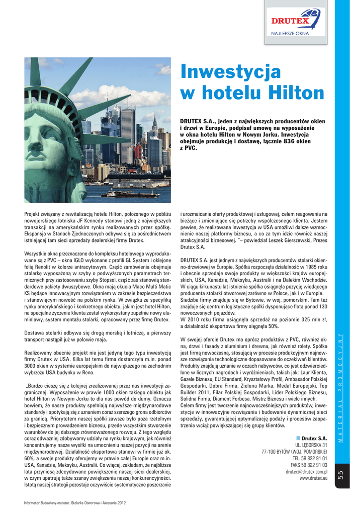 Inwestycja w hotelu Hilton DRUTEX S.A., jeden z największych producentów okien i drzwi w Europie, podpisał umowę na wyposażenie w okna hotelu Hilton w Nowym Jorku. Inwestycja obejmuje produkcję i dostawę, łącznie 836 okien z PVC. Realizowany obecnie projekt nie jest jedyną tego typu inwestycją firmy Drutex w USA. Kilka lat temu firma dostarczyła m.in. ponad 3000 okien w systemie europejskim do największego na zachodnim wybrzeżu USA budynku w Reno. „Bardzo cieszę się z kolejnej zrealizowanej przez nas inwestycji zagranicznej. Wyposażenie w prawie 1000 okien takiego obiektu jak hotel Hilton w Nowym Jorku to dla nas powód do dumy. Oznacza bowiem, że nasze produkty spełniają najwyższe międzynarodowe standardy i spotykają się z uznaniem coraz szerszego grona odbiorców za granicą. Priorytetem naszej spółki zawsze było poza rzetelnym i bezpiecznym prowadzeniem biznesu, przede wszystkim stworzenie warunków do jej dalszego zrównoważonego rozwoju. Z tego względu coraz odważniej zdobywamy udziały na rynku krajowym, jak również koncentrujemy nasze wysiłki na umocnieniu naszej pozycji na arenie międzynarodowej. Działalność eksportowa stanowi w firmie już ok. 60%, a swoje produkty oferujemy w prawie całej Europie oraz m.in. USA, Kanadzie, Meksyku, Australii. Co więcej, zakładam, że najbliższe lata przyniosą zdecydowane powiększenie naszej sieci dealerskiej, w czym upatruję także szansy zwiększenia naszej konkurencyjności. Istotą naszej strategii pozostaje oczywiście systematyczne poszerzanie Informator Budowlany-murator. Stolarka Otworowa i Akcesoria 2012 W swojej ofercie Drutex ma oprócz produktów z PVC, również okna, drzwi i fasady z aluminium i drewna, jak również rolety. Spółka jest firmą nowoczesną, stosującą w procesie produkcyjnym najnowsze rozwiązania technologiczne dopasowane do oczekiwań klientów. Produkty znajdują uznanie w oczach nabywców, co jest odzwierciedlone w licznych nagrodach i wyróżnieniach, takich jak: Laur Klienta, Gazele Biznesu, EU Standard, Kryształowy Profil, Ambasador Polskiej Gospodarki, Dobra Firma, Zielona Marka, Medal Europejski, Top Builder 2011, Filar Polskiej Gospodarki, Lider Polskiego Biznesu, Solidna Firma, Diament Forbesa, Mistrz Biznesu i wiele innych. Celem firmy jest tworzenie najnowocześniejszych produktów, inwestycje w innowacyjne rozwiązania i budowanie dynamicznej sieci sprzedaży, gwarantującej optymalizację podaży i procesów zaopatrzenia wciąż powiększającej się grupy klientów. ■ Drutex s.a. UL. LĘBORSKA 31 77-100 BYTÓW (WOJ. POMORSKIE) TEL. 59 822 91 01 FAKS 59 822 91 03 [email protected] www.drutex.eu p r o m o c y j n y Dostawa stolarki odbywa się drogą morską i lotniczą, a pierwszy transport nastąpił już w połowie maja. DRUTEX S.A. jest jednym z największych producentów stolarki okienno-drzwiowej w Europie. Spółka rozpoczęła działalność w 1985 roku i obecnie sprzedaje swoje produkty w większości krajów europejskich, USA, Kanadzie, Meksyku, Australii i na Dalekim Wschodzie. W ciągu kilkunastu lat istnienia spółka osiągnęła pozycję wiodącego producenta stolarki otworowej zarówno w Polsce, jak i w Europie. Siedziba firmy znajduje się w Bytowie, w woj. pomorskim. Tam też znajduje się centrum logistyczne spółki dysponujące flotą ponad 130 nowoczesnych pojazdów. W 2010 roku firma osiągnęła sprzedaż na poziomie 325 mln zł, a działalność eksportowa firmy sięgnęła 50%. m a t e r i a ł Wszystkie okna przeznaczone do kompleksu hotelowego wyprodukowane są z PVC – okna IGLO wykonane z profili GL System i oklejone folią Renolit w kolorze antracytowym. Część zamówienia obejmuje stolarkę wyposażoną w szyby o podwyższonych parametrach termicznych przy zastosowaniu szyby Stopsol, część zaś stanowią standardowe pakiety dwuszybowe. Okna mają okucia Maco Multi Matic KS będące innowacyjnym rozwiązaniem w zakresie bezpieczeństwa i stanowiącym nowość na polskim rynku. W związku ze specyfiką rynku amerykańskiego i konkretnego obiektu, jakim jest hotel Hilton, na specjalne życzenie klienta został wykorzystany zupełnie nowy aluminiowy, system montażu stolarki, opracowany przez firmę Drutex. i urozmaicanie oferty produktowej i usługowej, celem reagowania na bieżące i zmieniające się potrzeby współczesnego klienta. Jestem pewien, że realizowana inwestycja w USA umożliwi dalsze wzmocnienie naszej platformy biznesu, a co za tym idzie również naszej atrakcyjności biznesowej. ”– powiedział Leszek Gierszewski, Prezes Drutex S.A. 55 Projekt związany z rewitalizacją hotelu Hilton, położonego w pobliżu nowojorskiego lotniska JF Kennedy stanowi jedną z największych transakcji na amerykańskim rynku realizowanych przez spółkę. Ekspansja w Stanach Zjednoczonych odbywa się za pośrednictwem istniejącej tam sieci sprzedaży dealerskiej firmy Drutex.