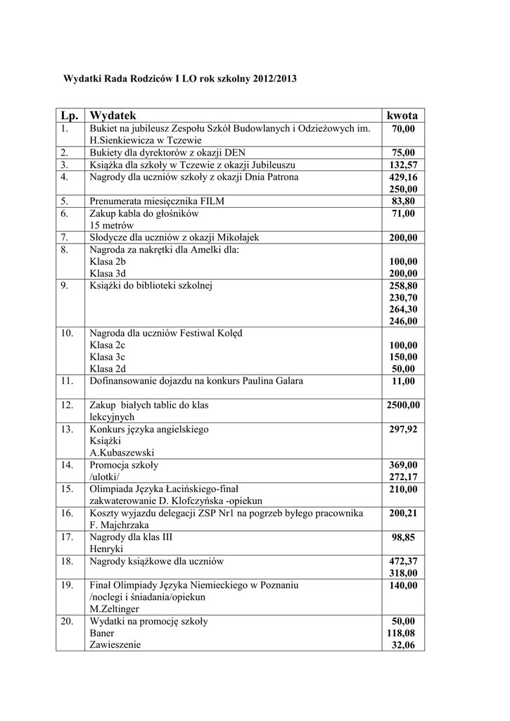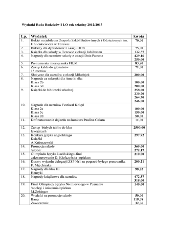 Wydatki Rada Rodziców I LO rok szkolny 2012/2013 Lp. Wydatek 1. 2. 3. 4. 5. 6. 7. 8. 9. 10. 11. 12. 13. 14. 15. 16. 17. 18. 19. 20. Bukiet na jubileusz Zespołu Szkół Budowlanych i Odzieżowych im. H.Sienkiewicza w Tczewie Bukiety dla dyrektorów z okazji DEN Książka dla szkoły w Tczewie z okazji Jubileuszu Nagrody dla uczniów szkoły z okazji Dnia Patrona Prenumerata miesięcznika FILM Zakup kabla do głośników 15 metrów Słodycze dla uczniów z okazji Mikołajek Nagroda za nakrętki dla Amelki dla: Klasa 2b Klasa 3d Książki do biblioteki szkolnej Nagroda dla uczniów Festiwal Kolęd Klasa 2c Klasa 3c Klasa 2d Dofinansowanie dojazdu na konkurs Paulina Galara Zakup białych tablic do klas lekcyjnych Konkurs języka angielskiego Książki A.Kubaszewski Promocja szkoły /ulotki/ Olimpiada Języka Łacińskiego-finał zakwaterowanie D. Klofczyńska -opiekun Koszty wyjazdu delegacji ZSP Nr1 na pogrzeb byłego pracownika F. Majchrzaka Nagrody dla klas III Henryki Nagrody książkowe dla uczniów Finał Olimpiady Języka Niemieckiego w Poznaniu /noclegi i śniadania/opiekun M.Zeltinger Wydatki na promocję szkoły Baner Zawieszenie kwota 70,00 75,00 132,57 429,16 250,00 83,80 71,00 200,00 100,00 200,00 258,80 230,70 264,30 246,00 100,00 150,00 50,00 11,00 2500,00 297,92 369,00 272,17 210,00 200,21 98,85 472,37 318,00 140,00 50,00 118,08 32,06 21. Dofinansowanie Warsztaty Ekologiczne w Iławie 22. Dofinansowanie do wycieczki klasowanej do Słupska 97,15 344,00 500,00 23. Zakup kroniki szkolnej Odbitki fotografii do kroniki szkolnej 52,10 126,57 24. Zakup upominków i kwiatów na pożegnanie nauczycieli odchodzących na emeryturę Zakup pakietu multimedialnego-lekcje wychowawcze na DVD Dofinansowanie kosztów wycieczki dla uczennicy klasy I”F,, Aleksandry Malinowskiej 587,00 80,00 773,61 160,00 25. 26.